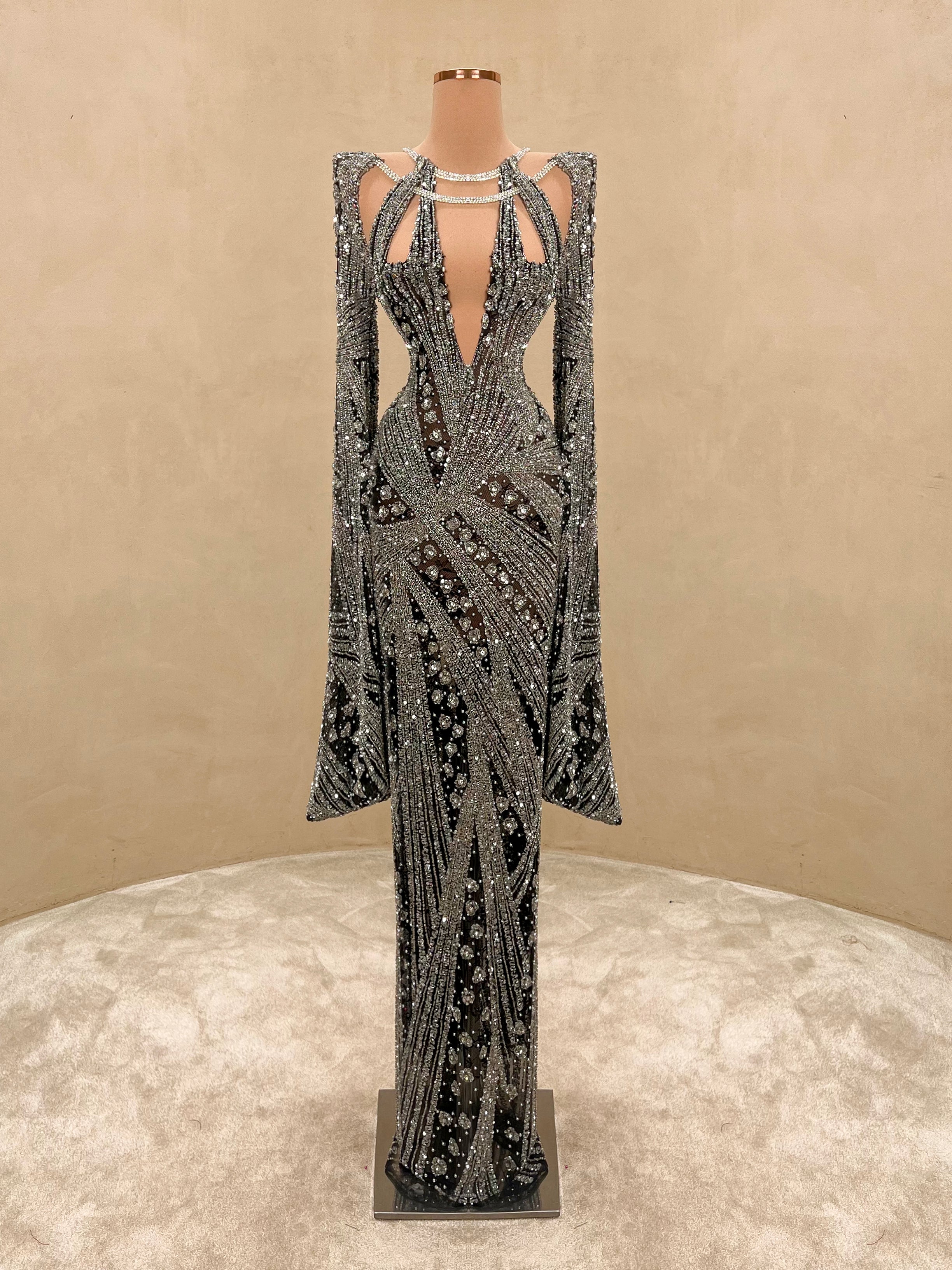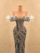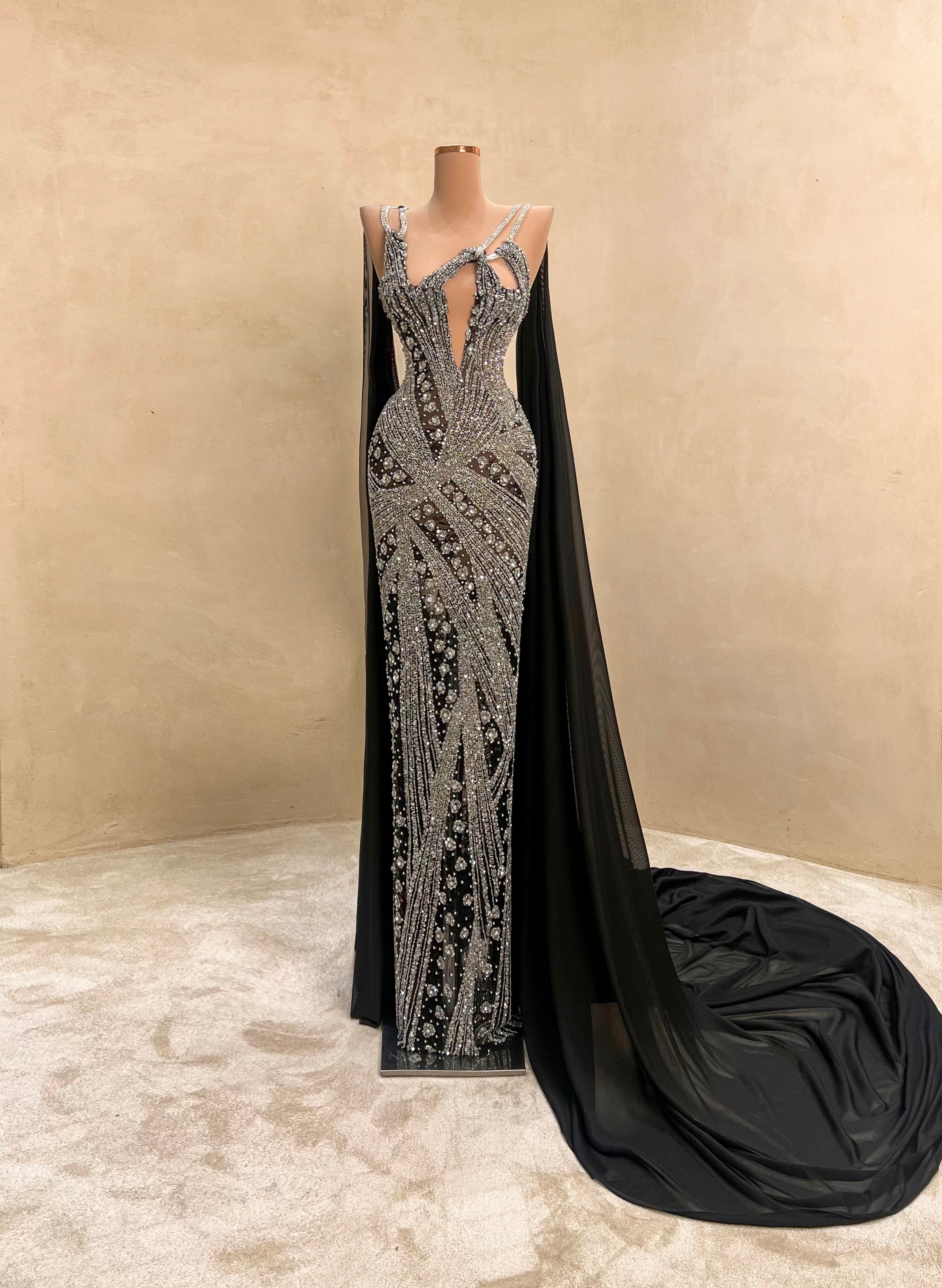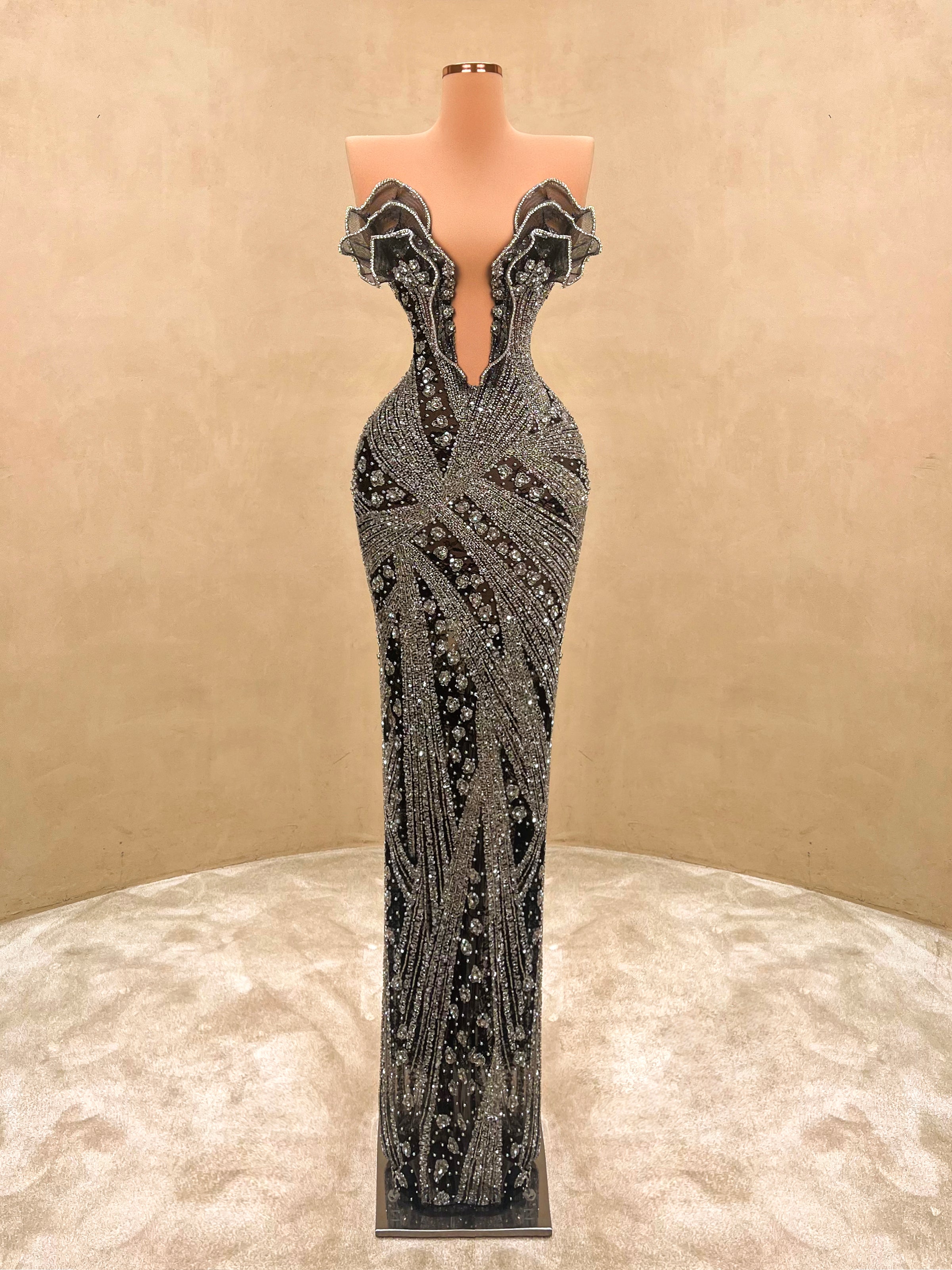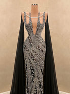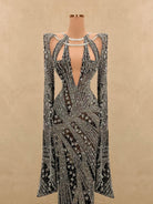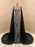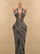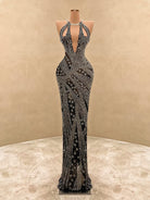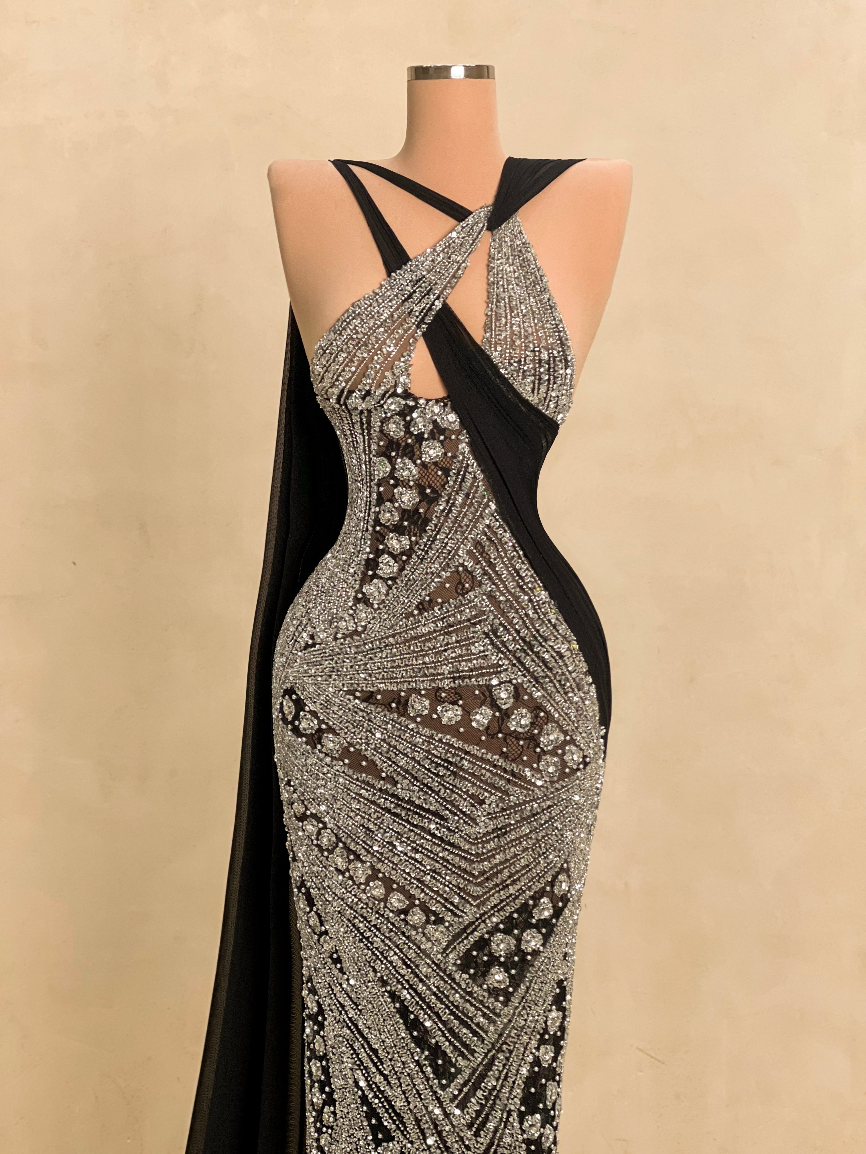 Command the spotlight in this striking black and silver evening gown. This form-fitting dress is a true statement piece. Ideal for upscale galas, red carpet moments, or any event where elegance and bold style collide.
