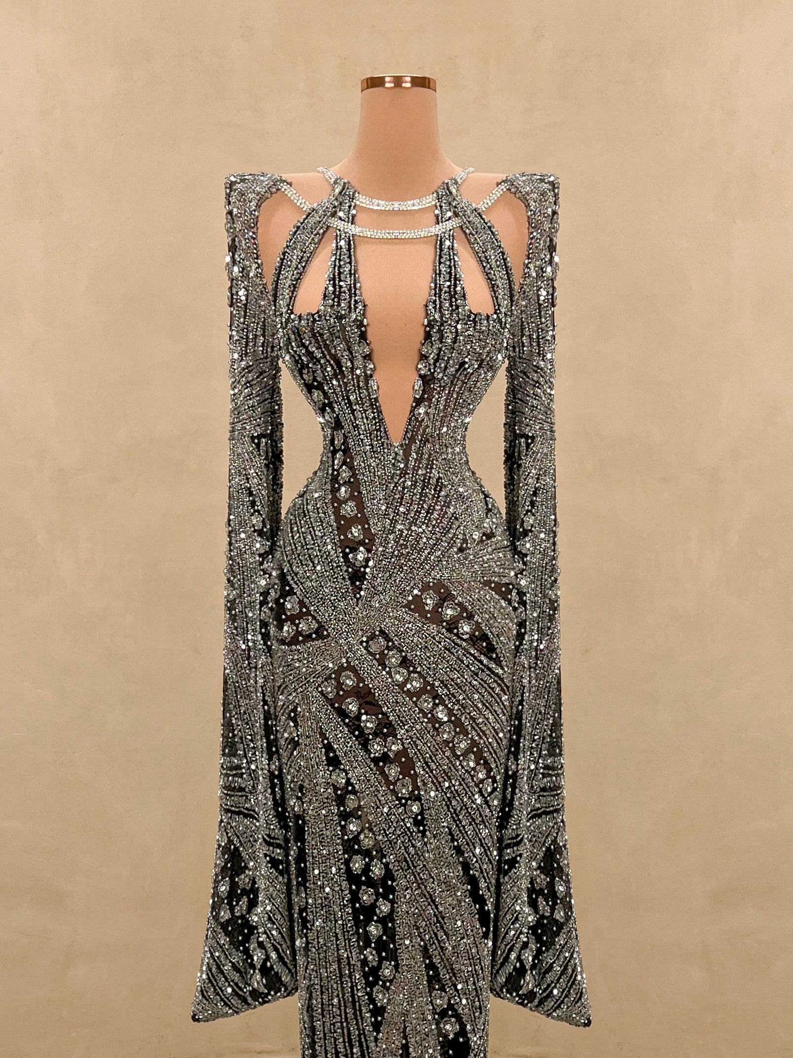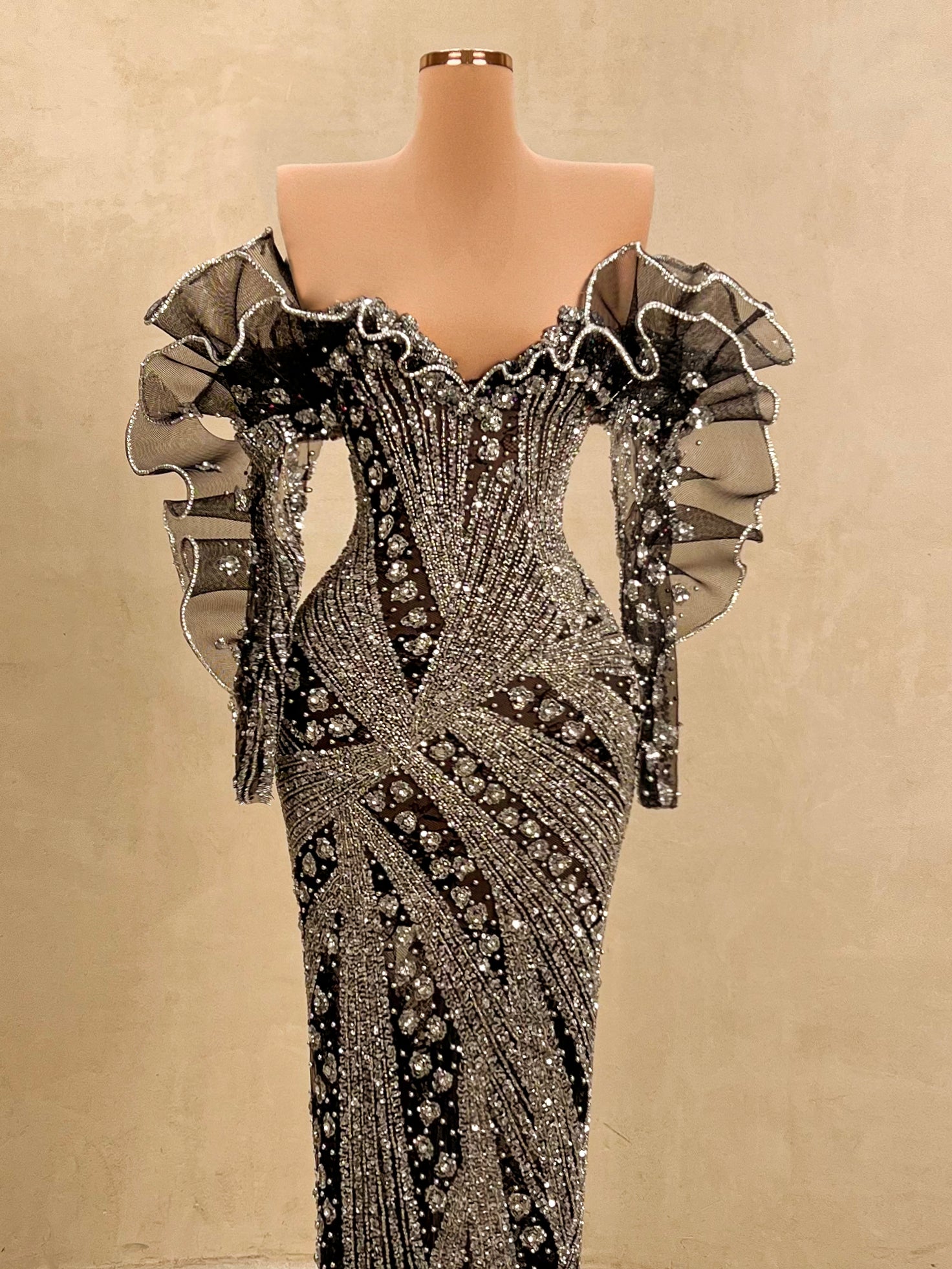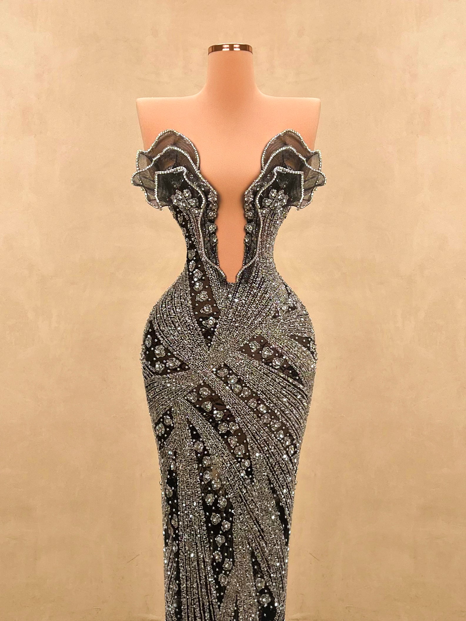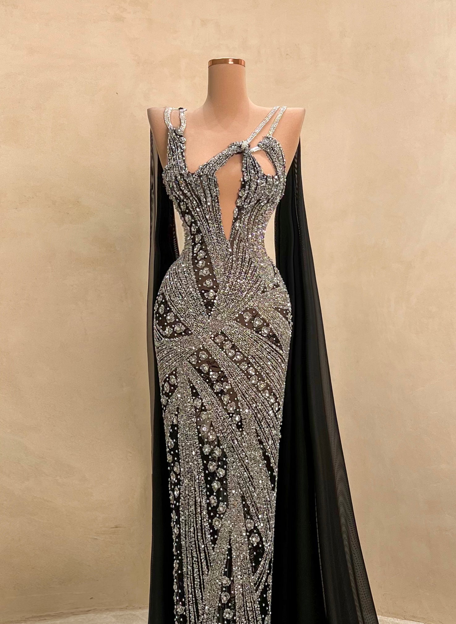 Command the spotlight in this striking black and silver evening gown. This form-fitting dress is a true statement piece. Ideal for upscale galas, red carpet moments, or any event where elegance and bold style collide.