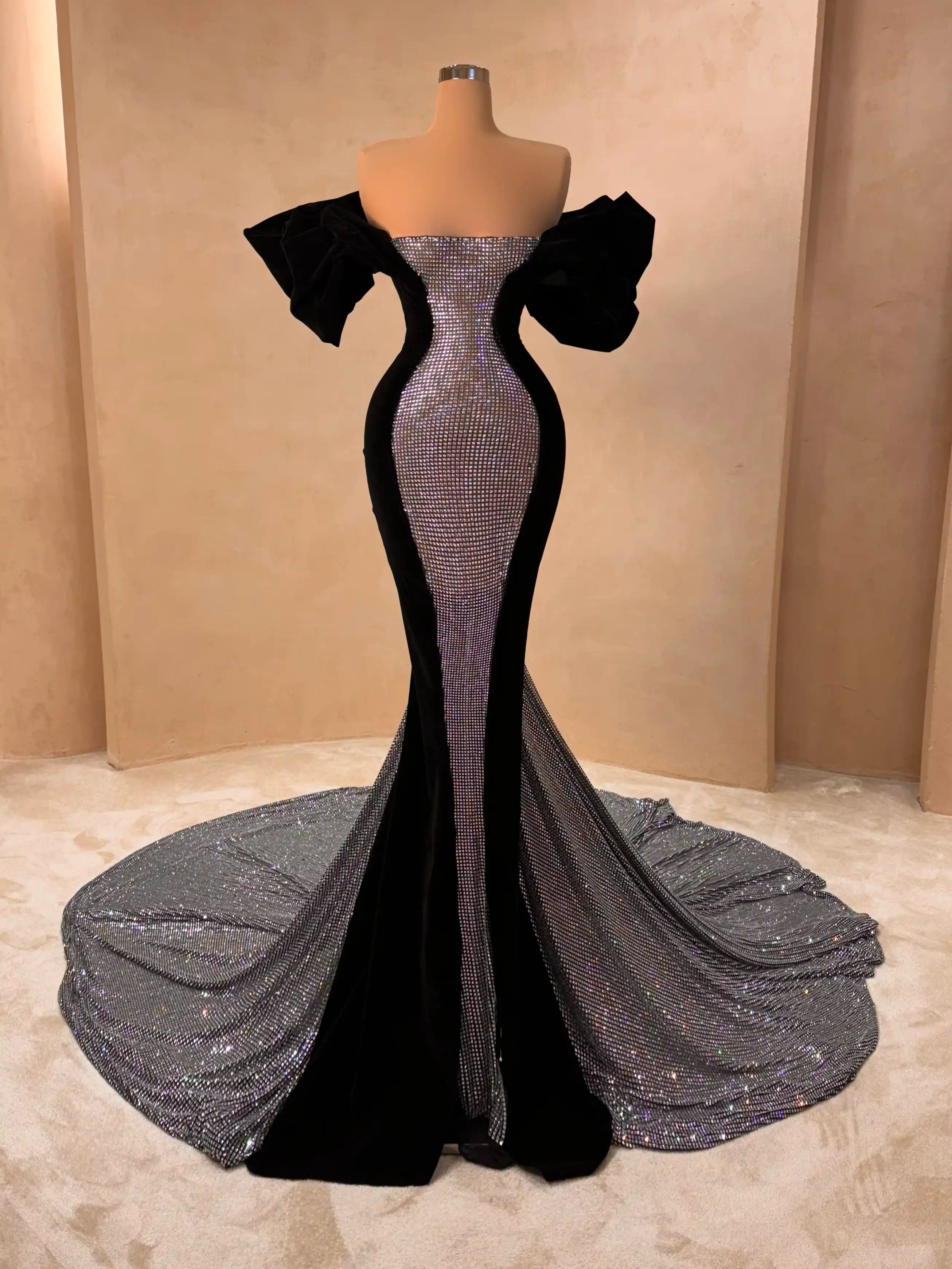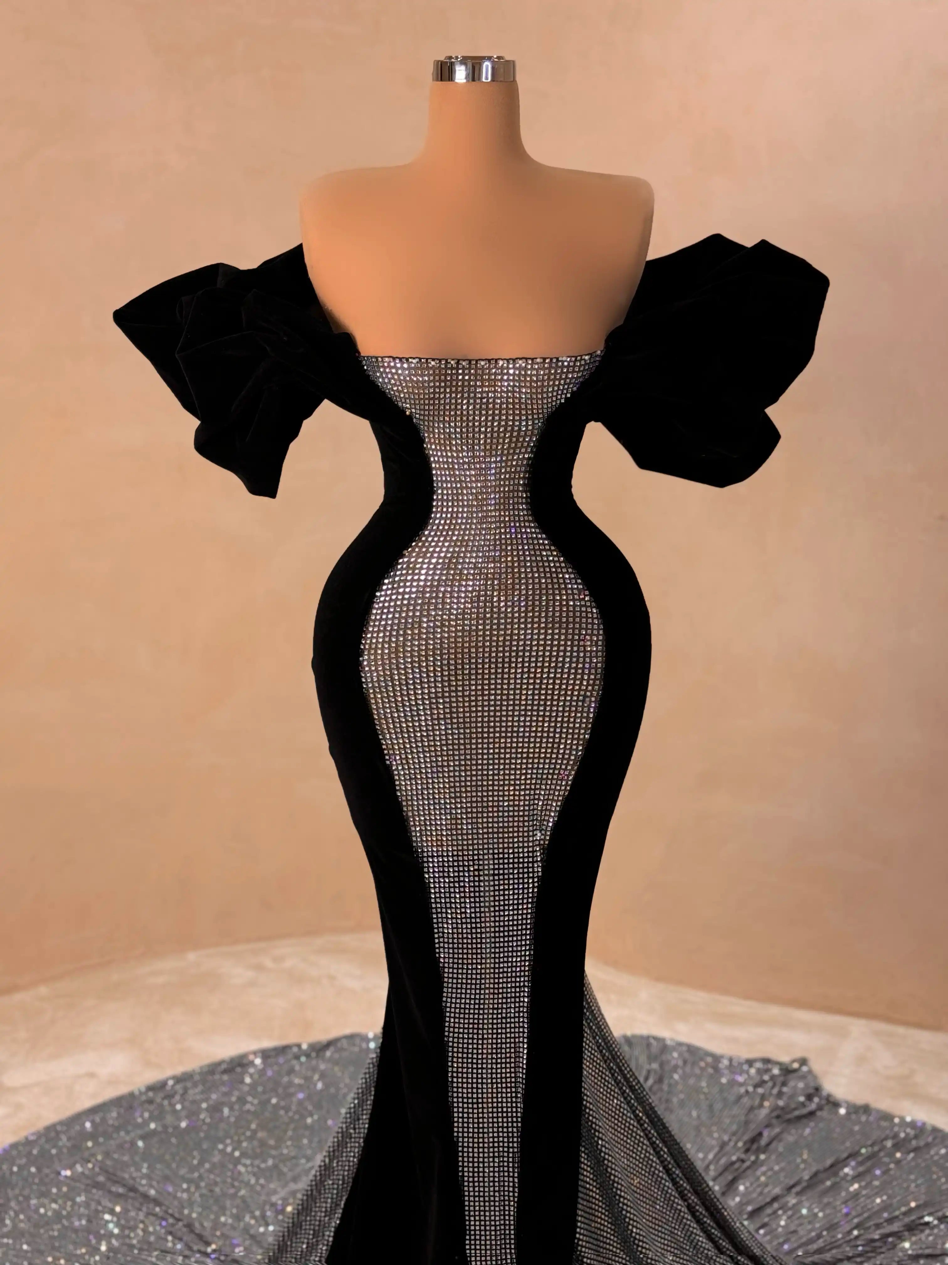 A daring blend of velvet and sparkle, this sculpted black gown features a glittering halter neckline with a deep keyhole cut-out, paired with exaggerated puff sleeves. It’s drama and elegance rolled into one unforgettable look.
