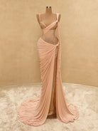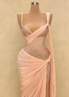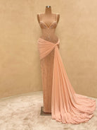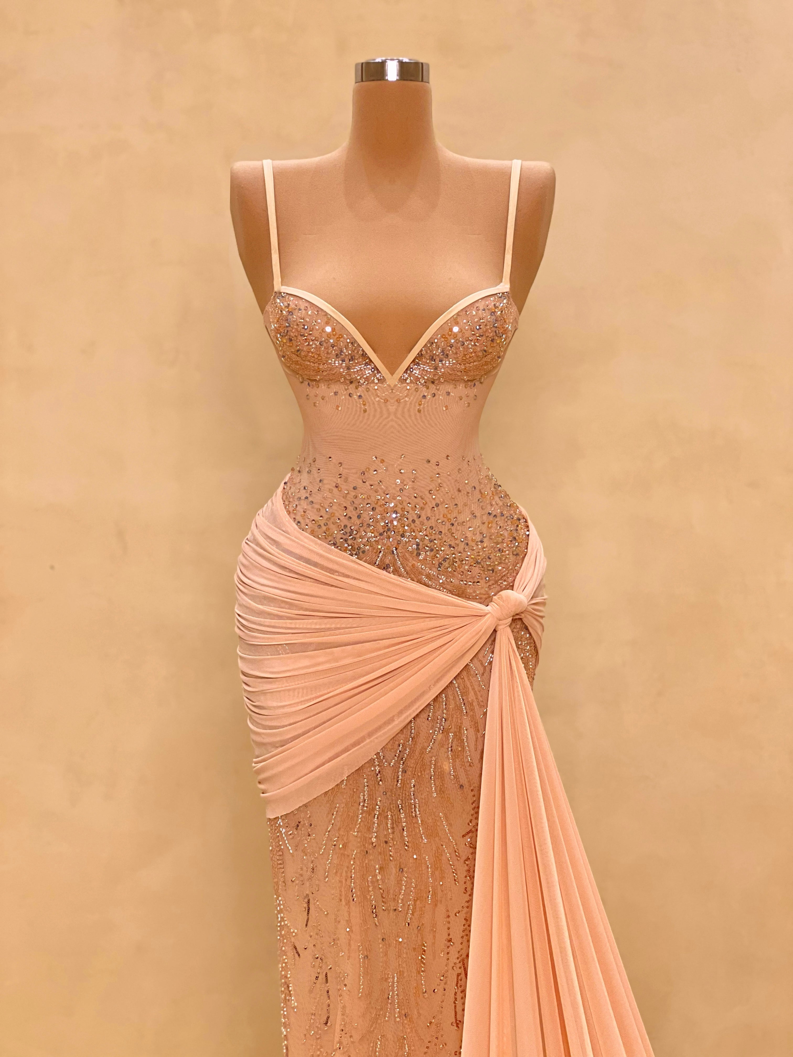 Each gown features a body-sculpting silhouette with a sheer embroidered base adorned in hand-applied crystals, delicately catching the light with every movement. Draped layers of blush fabric wrap the waist and hips, adding dimension and softness to the form. The design transitions effortlessly between two interpretations: one with a classic sweetheart neckline and another with an asymmetrical crystal-strap drape - each embodying confidence, poise, and grace.