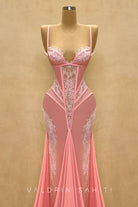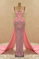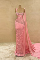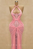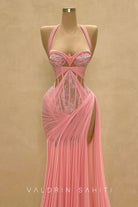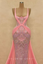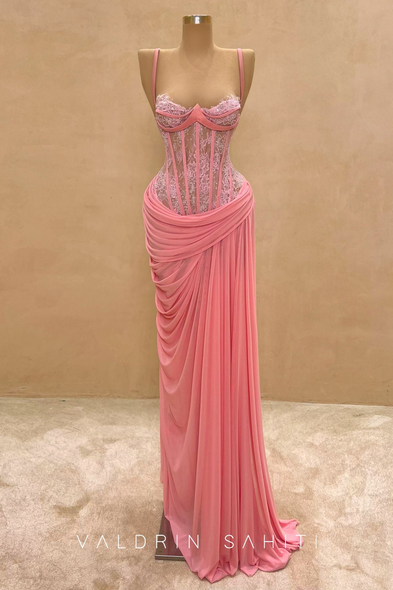 An ethereal blush gown crafted from layers of sheer draped tulle that sculpt the body with architectural precision. The corseted bodice features delicate lace embroidery and structured boning for an hourglass silhouette, while fluid gathers cascade to the floor, creating movement and allure. A signature Valdrin Sahiti piece that merges elegance with sensual craftsmanship.