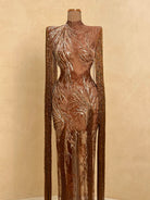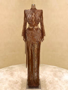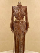 Crafted to captivate, this bronze sheer lace gown features intricate embroidery and glistening sequins cascading in botanical-inspired patterns. The elegant high neckline and elongated, beaded fringe sleeves create a statuesque silhouette. Ideal for red carpet moments or high-fashion galas, it’s a luxurious statement of artistry and allure.