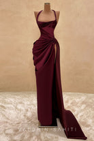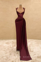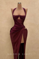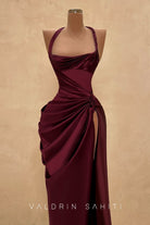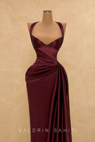 Refined, sensual, and powerful - this burgundy satin evening gown is designed with a sculpted bodice and draped detailing that cinches the waist, the gown highlights the brand’s signature mastery of silhouette and precision tailoring.