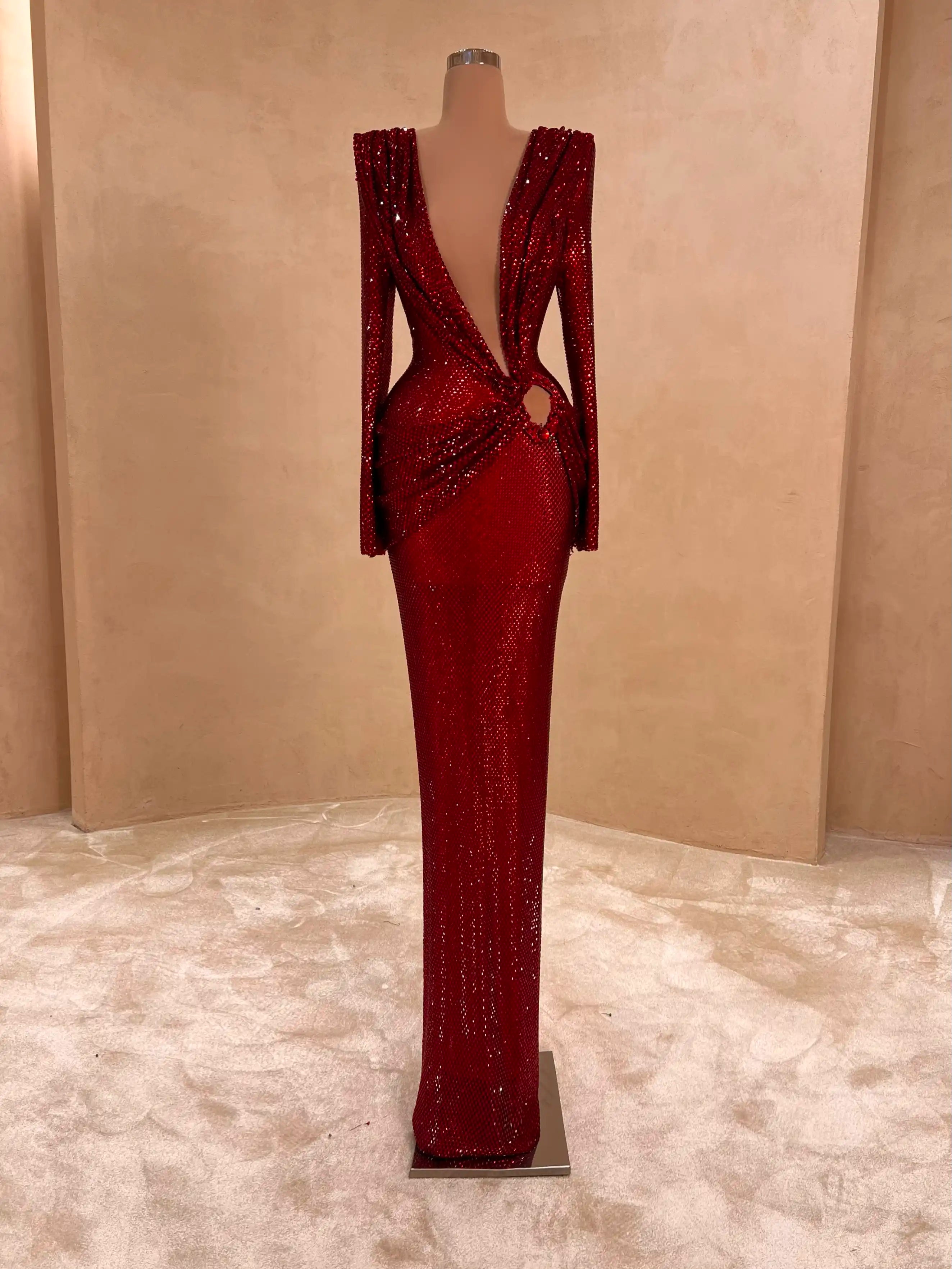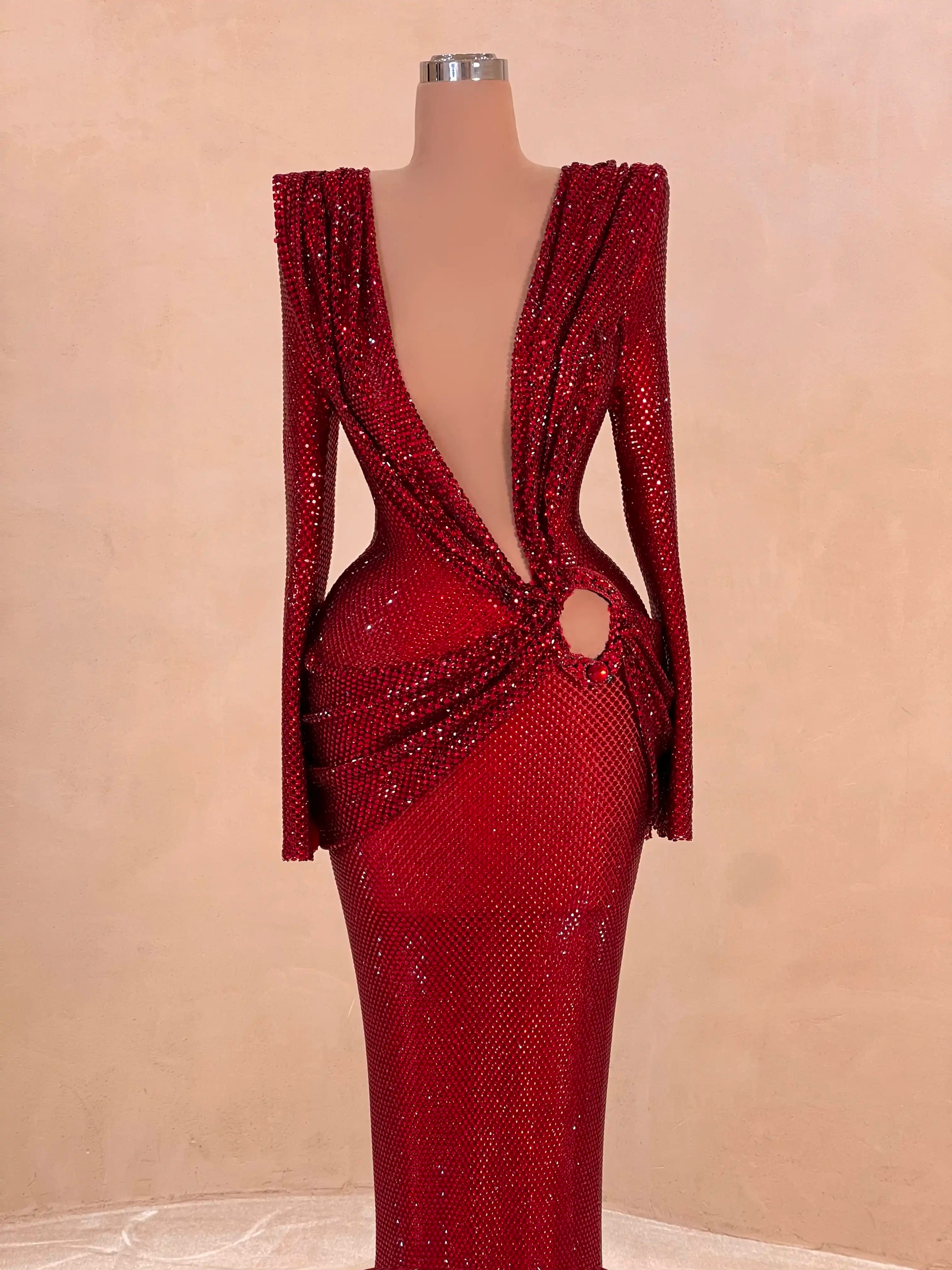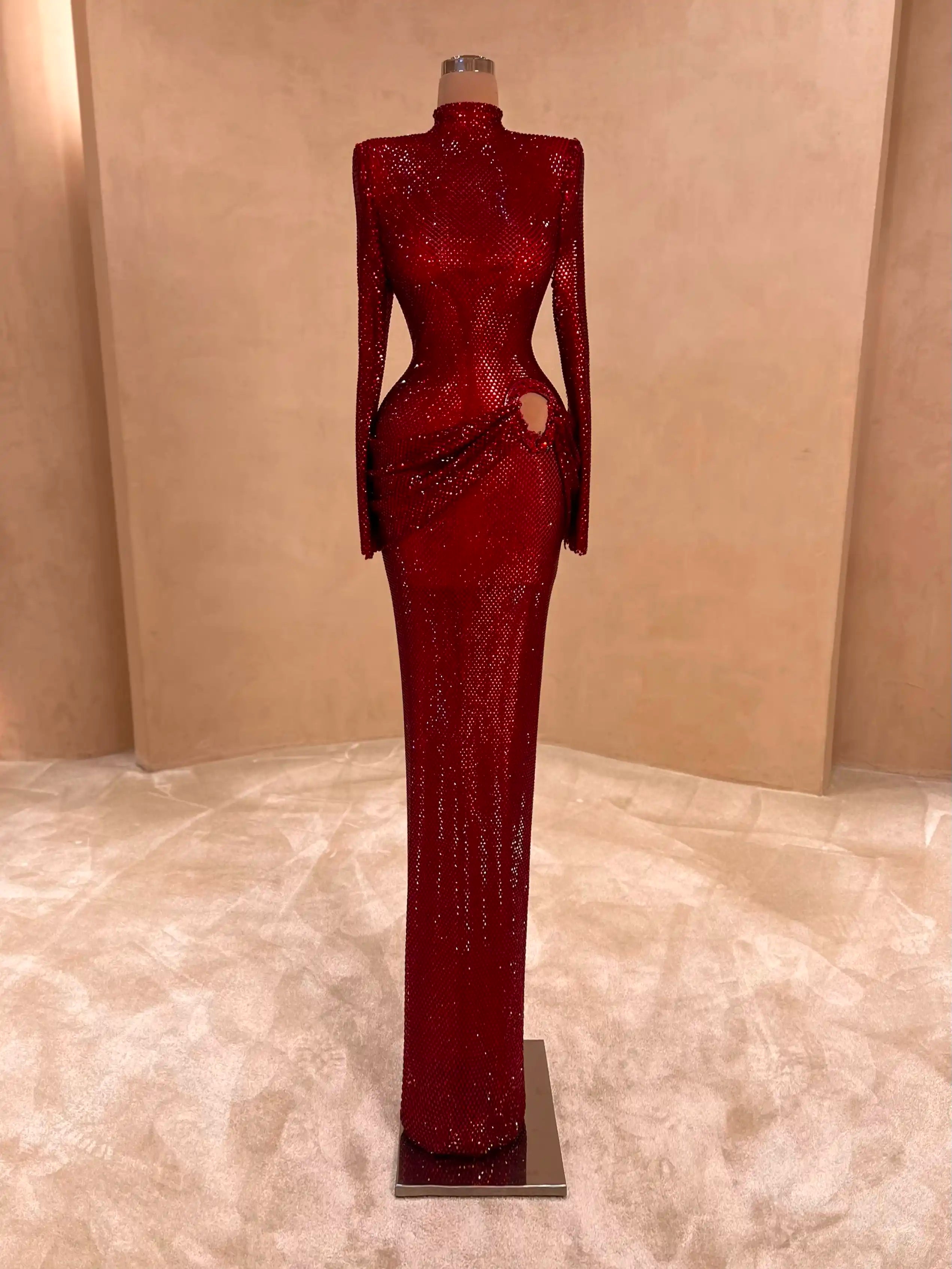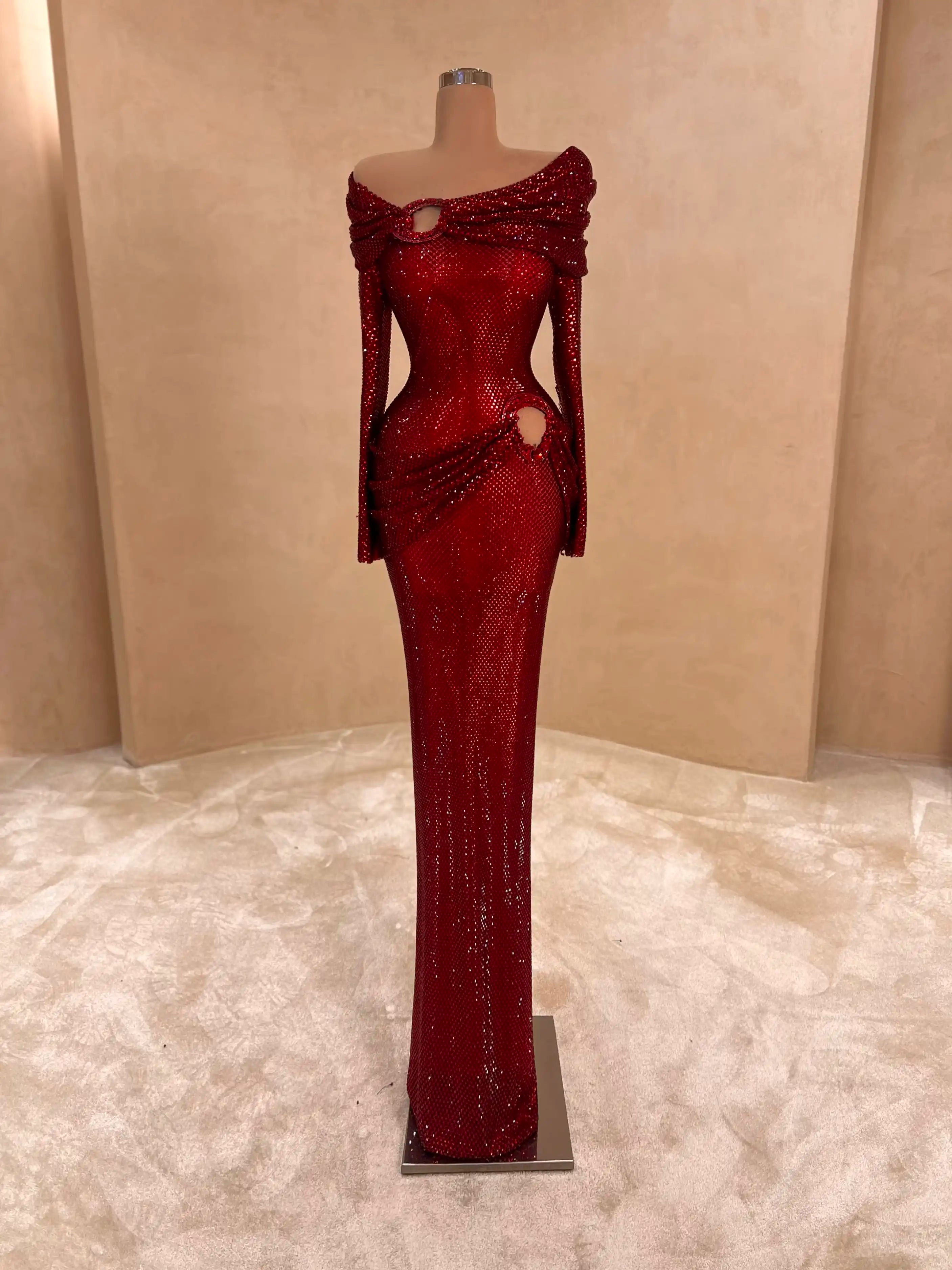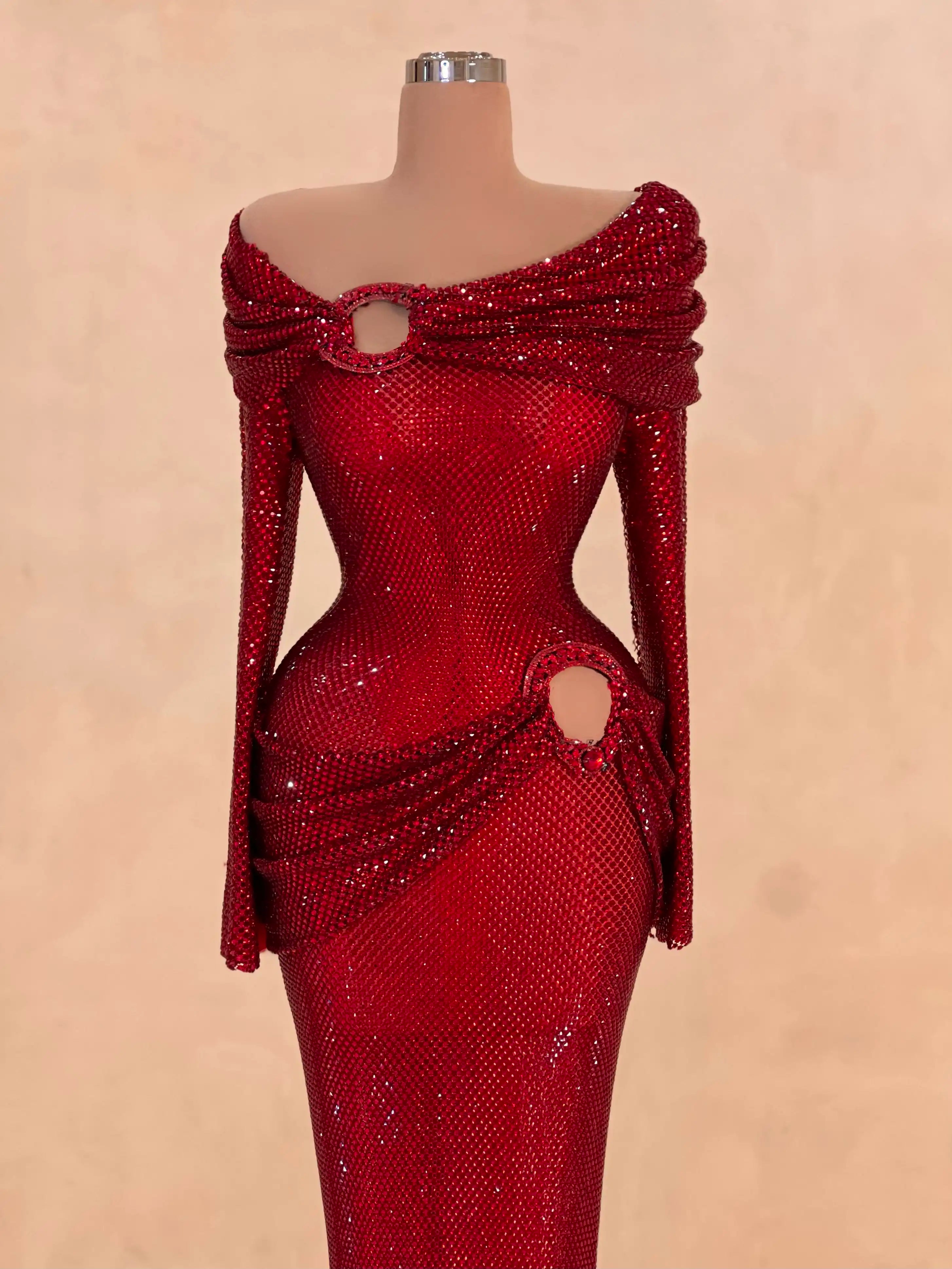 Fierce yet elegant, this ruby red gown features dramatic cut-outs, off-shoulder draping, and all-over glitter embellishments. Perfect for the fashion-forward woman who wants to steal the spotlight.