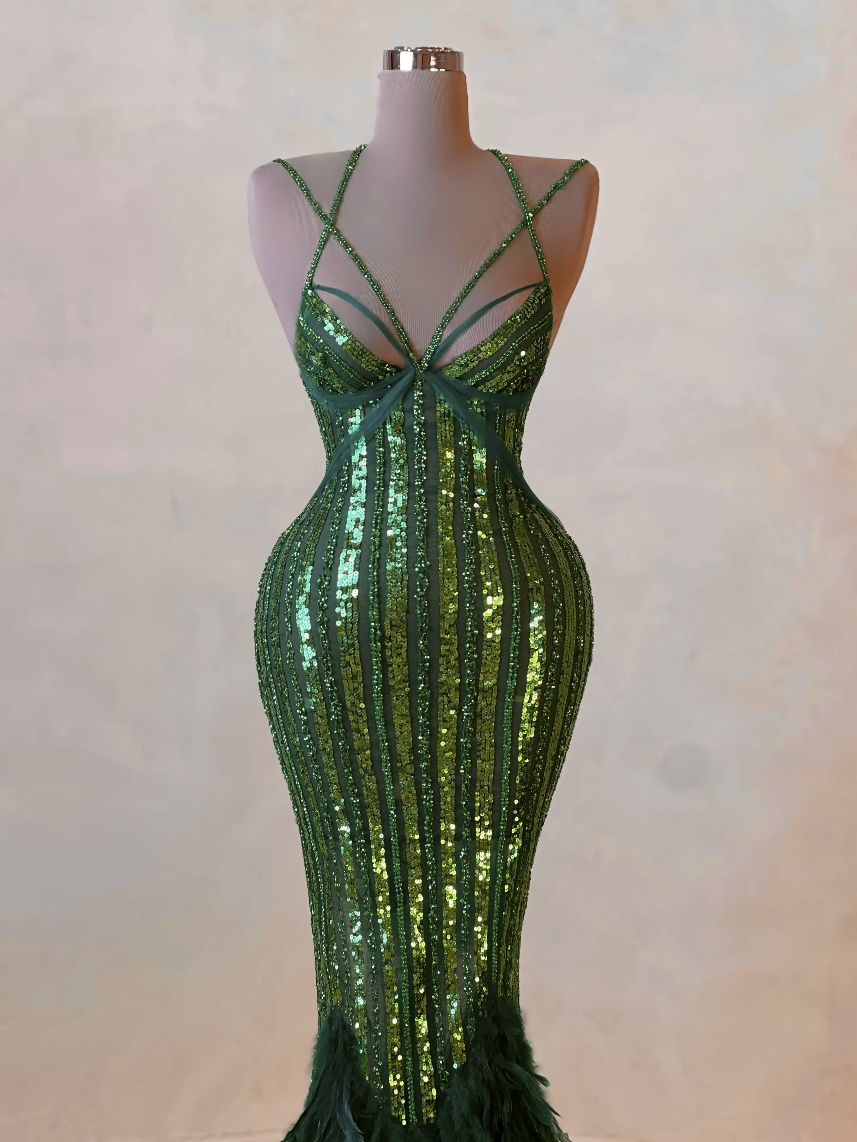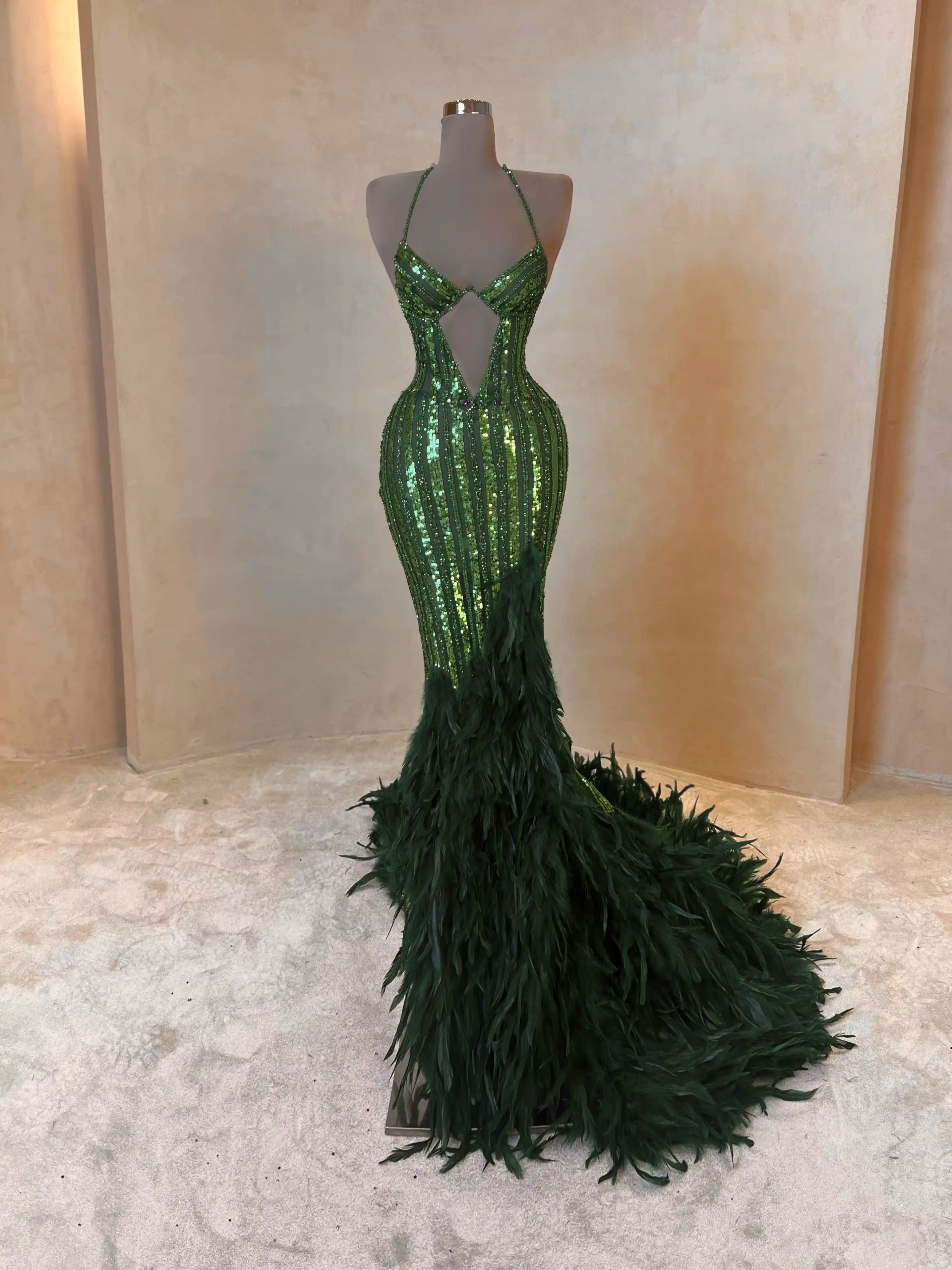 A vibrant emerald gown that blends bold glamour with elegance. Featuring a sculpted bodice, sheer paneling, and sparkling embellishments throughout, it’s finished with dramatic cape sleeves and a voluminous feathered train for a look that’s unapologetically powerful.