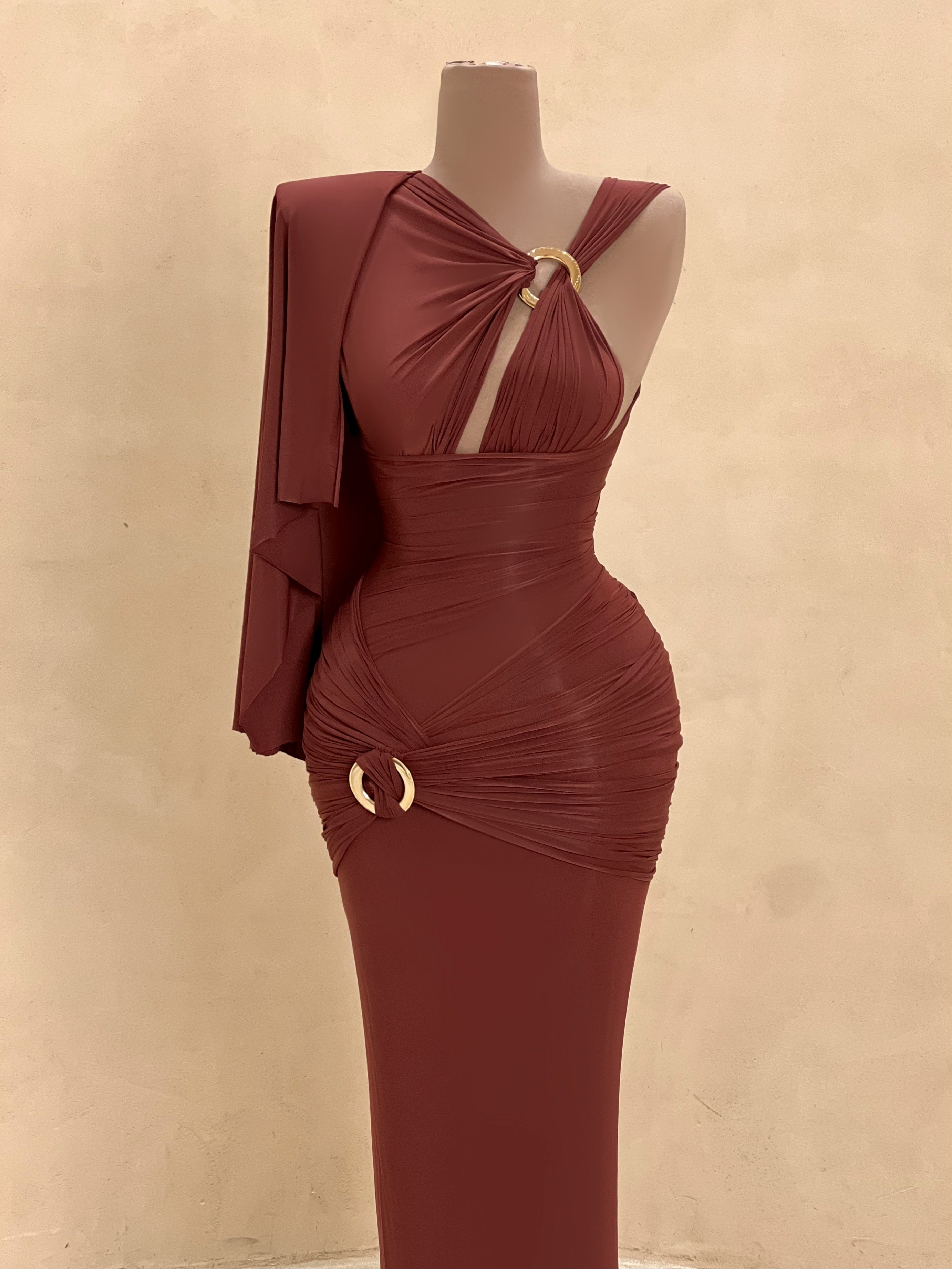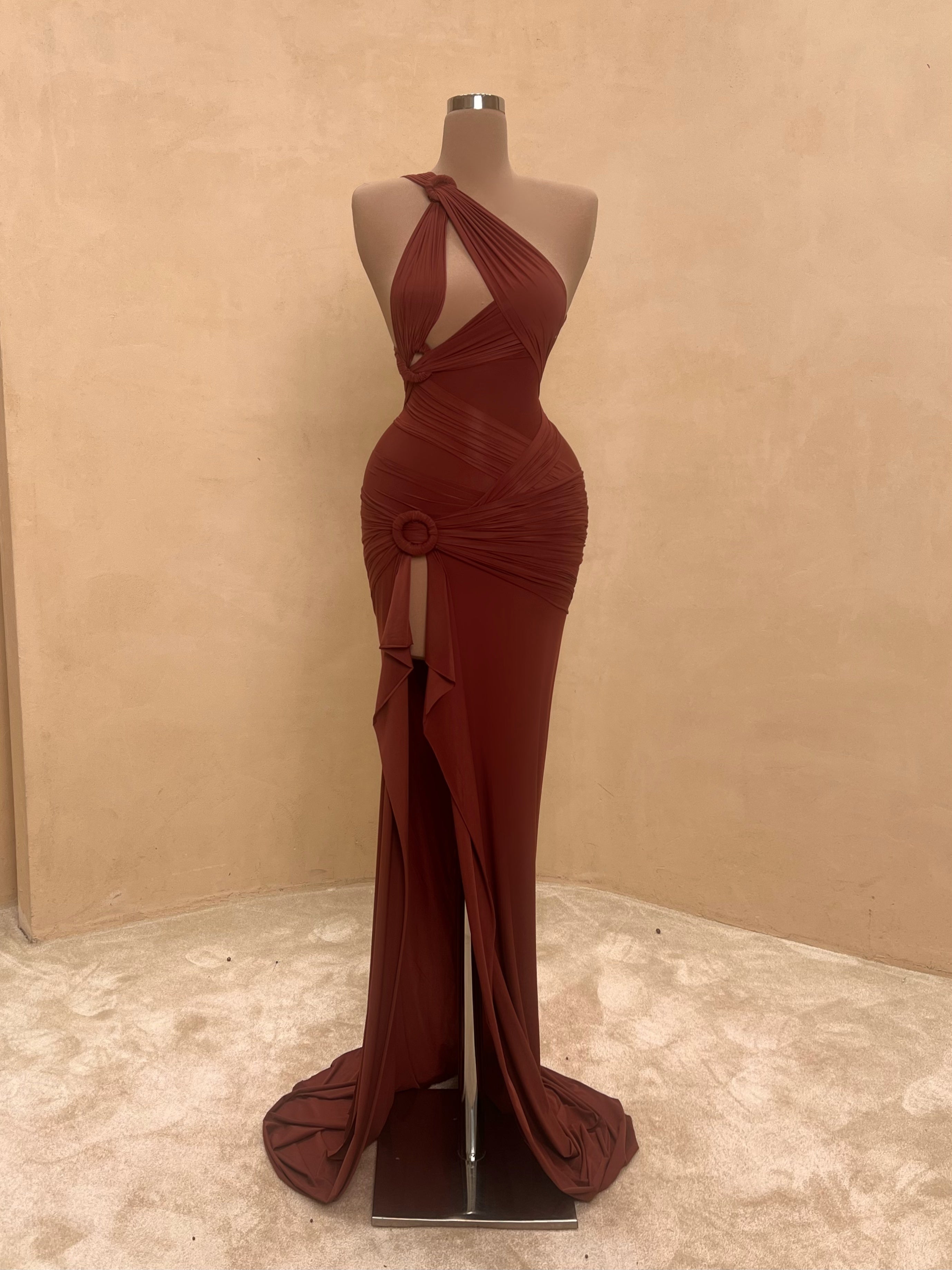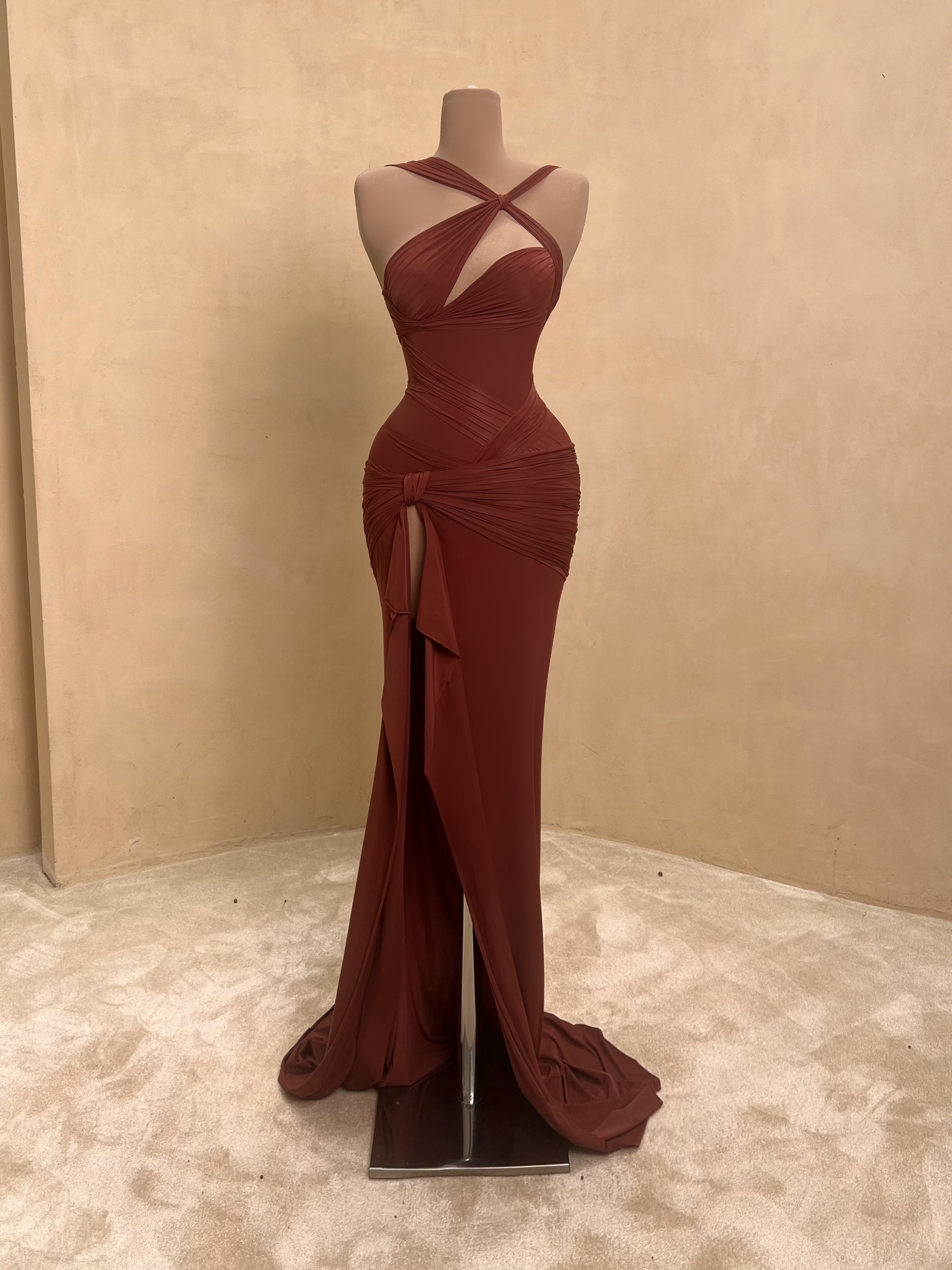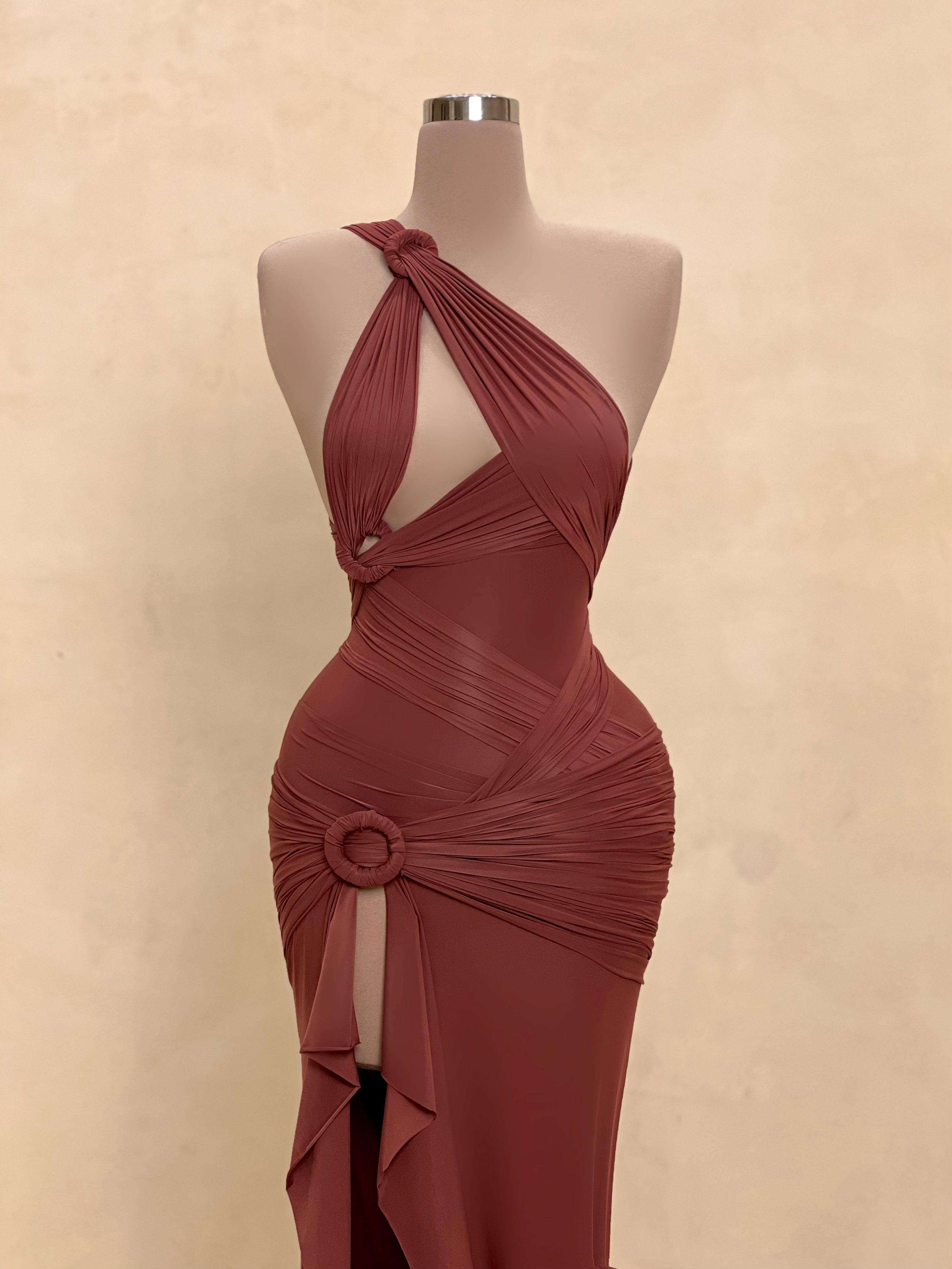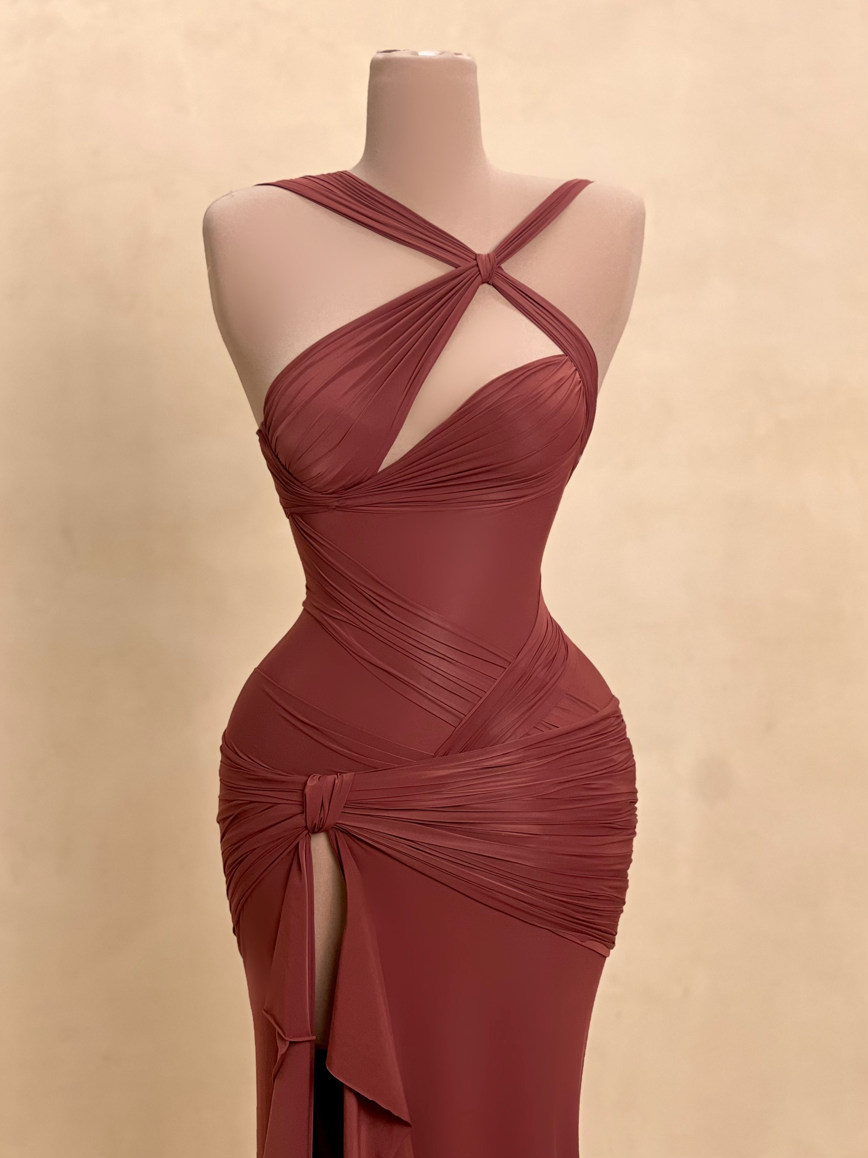 Step into effortless elegance with our Sculpted Burgundy Gown – a masterpiece of versatility and allure. Designed for the modern muse, this convertible gown features multiple styling options to transform your look with ease: from single-shoulder sophistication to cross-strap seduction and daring thigh-high slits.