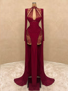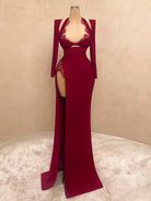 This listing features two stunning red evening gowns designed for modern glamour and bold sophistication.
