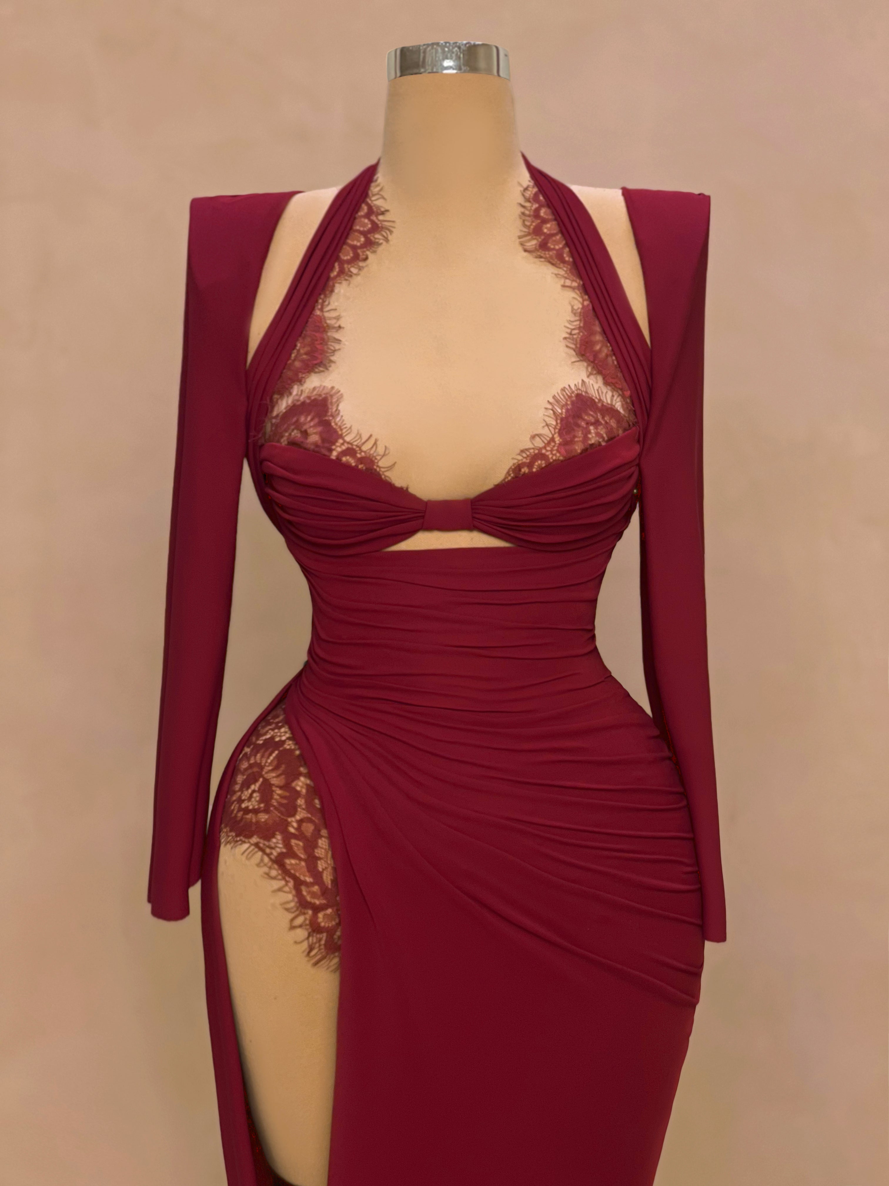 Dress 1: A fitted gown with daring side cut-outs, delicate lace detailing, and a sleek silhouette. Perfect for making a statement at any formal occasion.
