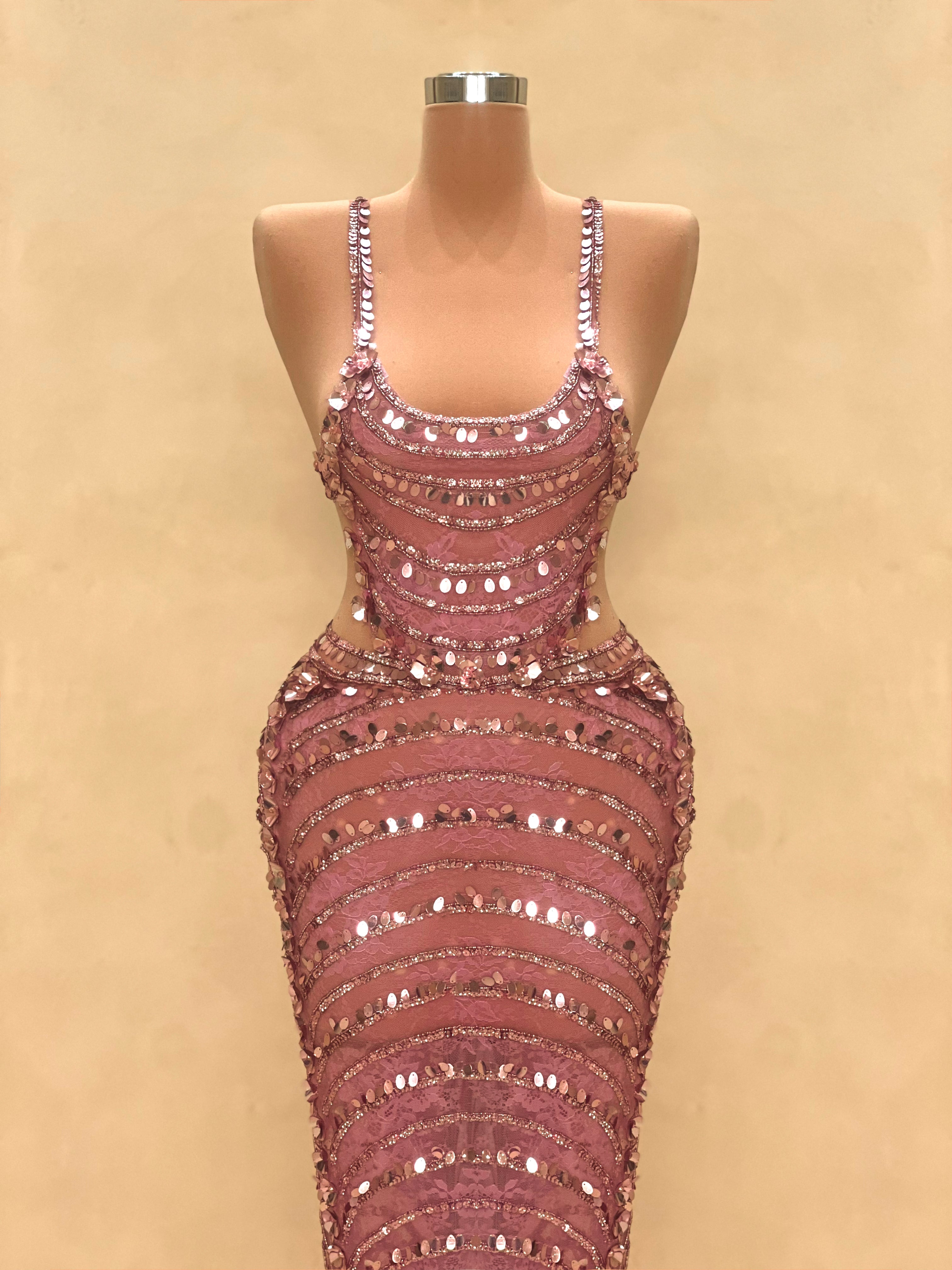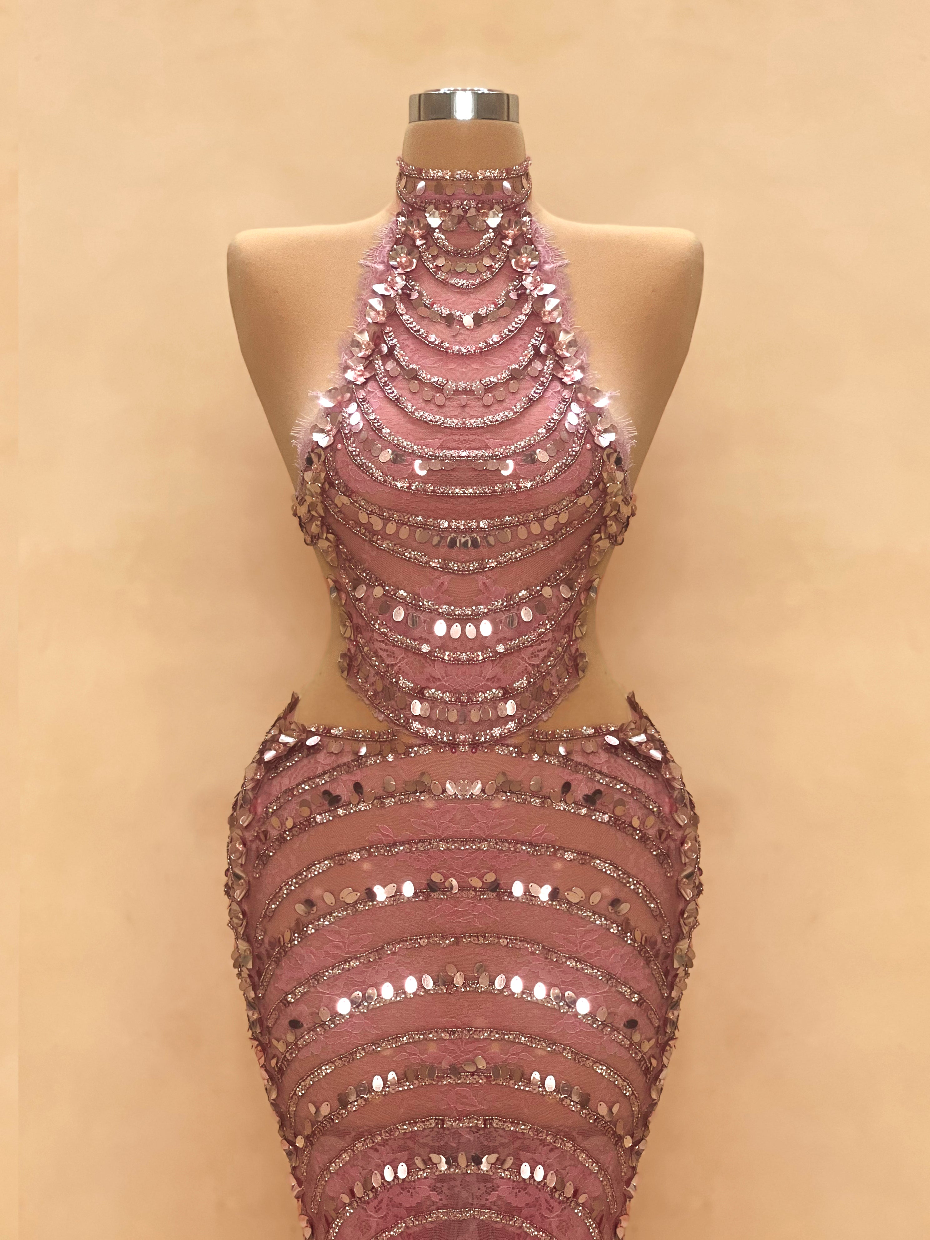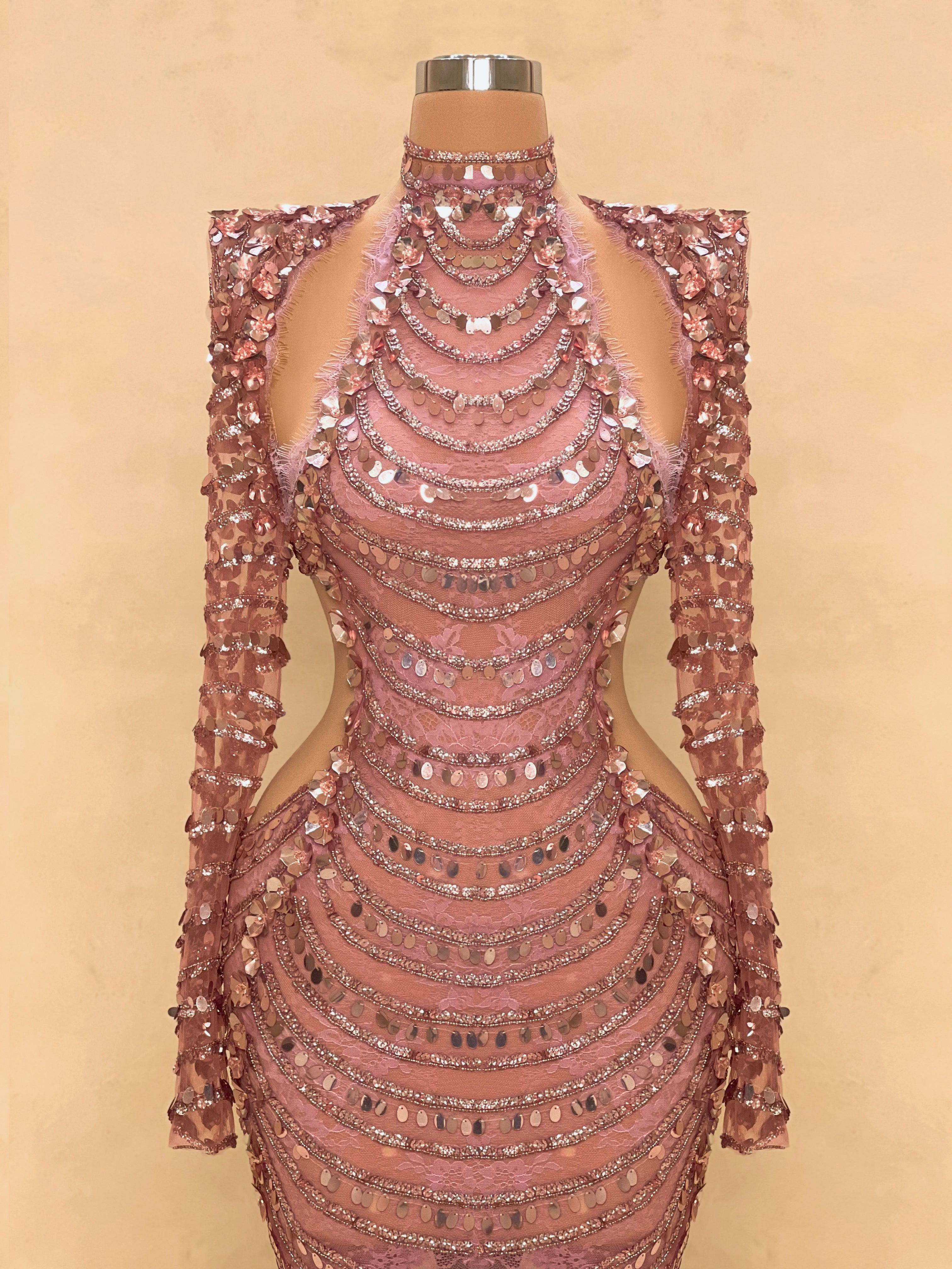 Command attention in this breathtaking rosewood evening gown, featuring a sculpted silhouette and intricate crystal embellishments from top to bottom. The sheer long sleeves are adorned with layered sequin detailing that cascade down for a show-stopping effect, while the figure-hugging bodice enhances your curves with precision. With a high neckline and dramatic cut-outs, this dress combines elegance with seductive confidence, ideal for red carpet events, galas, or exclusive celebrations. A true couture moment.