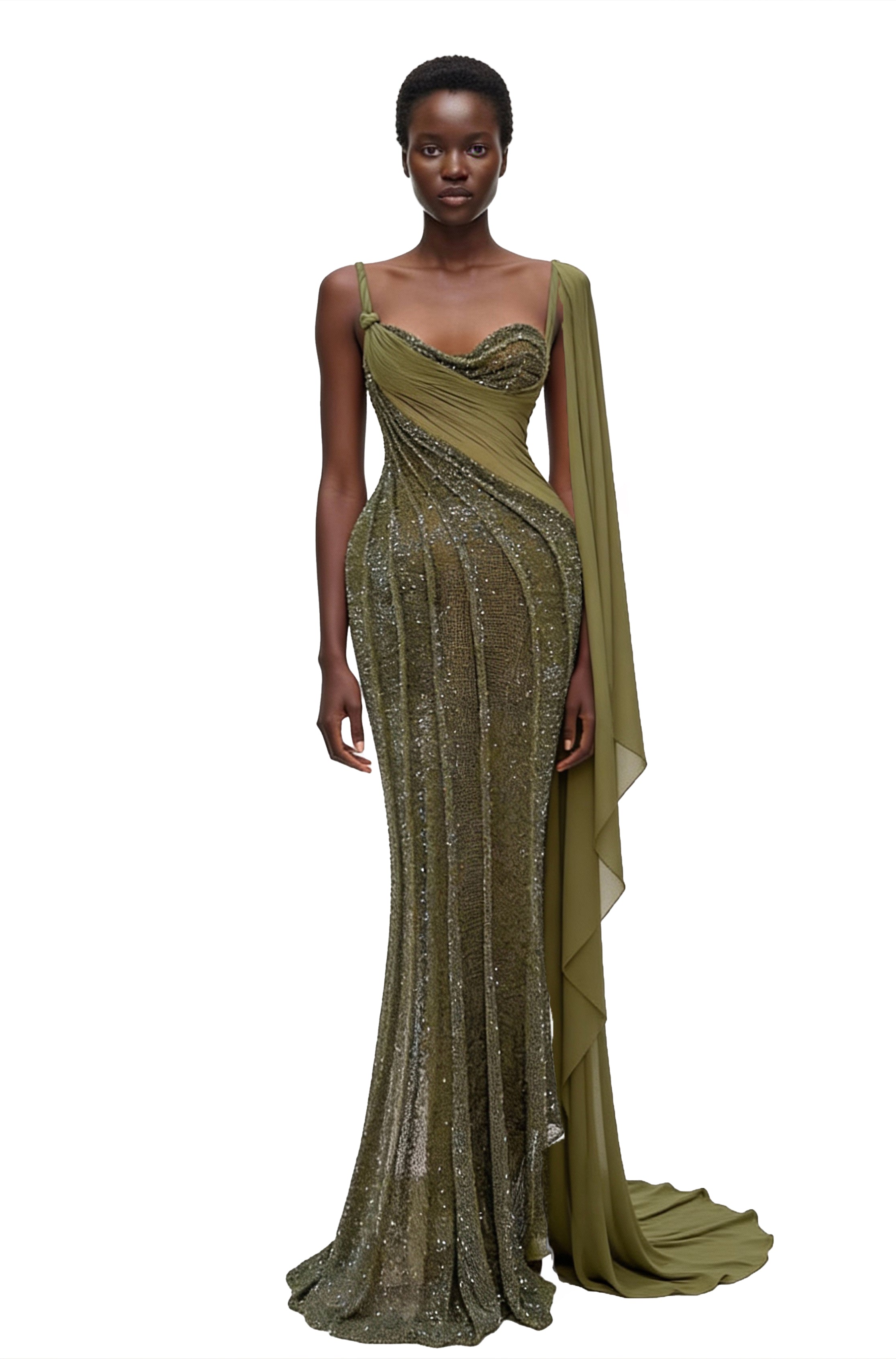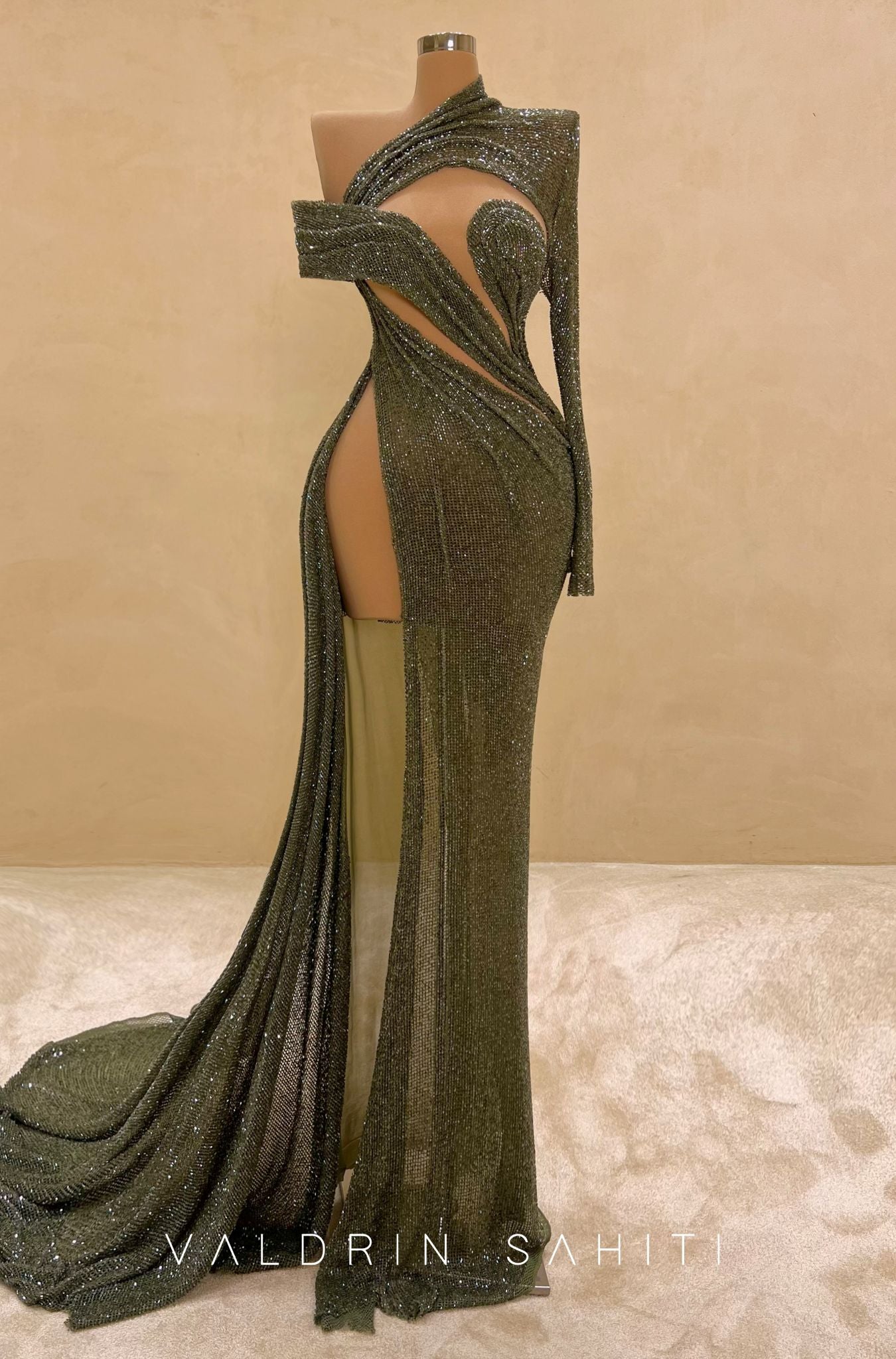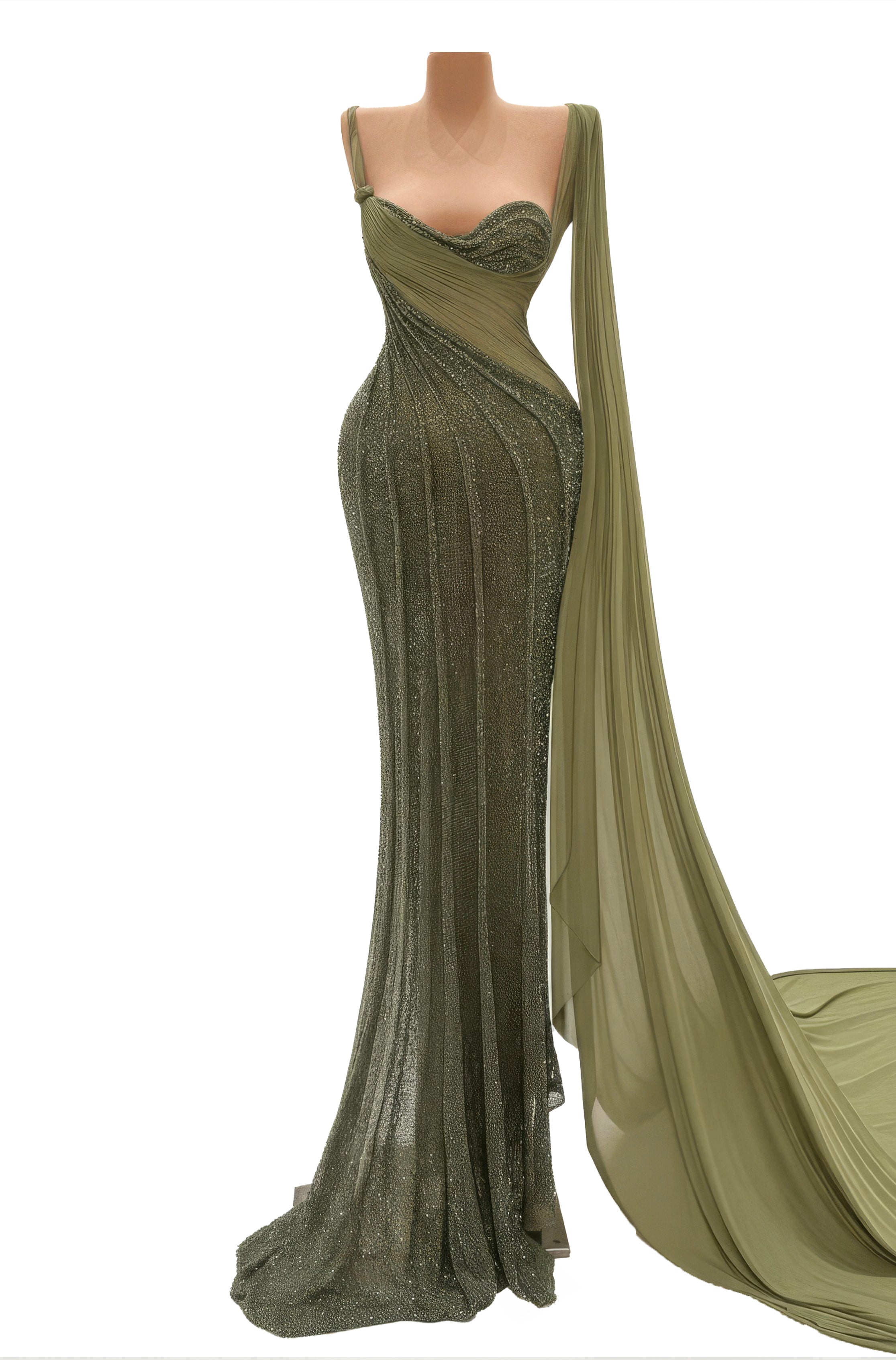 A sculptural statement of sensuality and sophistication, this emerald green couture gown is crafted to captivate. The asymmetrical silhouette embraces the body with precision draping and a single-sleeve design, artfully revealing skin through daring cutouts that celebrate the female form.