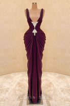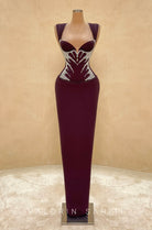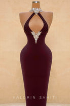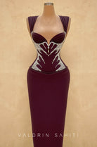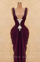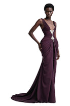 The striking plunging V-neckline is anchored by two magnificent hand-placed crystal brooches, adding a high-jewelry finish to the bodice.With its heavy-weight fabric and sleek, body-contouring fit, this gown is the ultimate choice for Red Carpet events, Galas, and Black-Tie occasions.