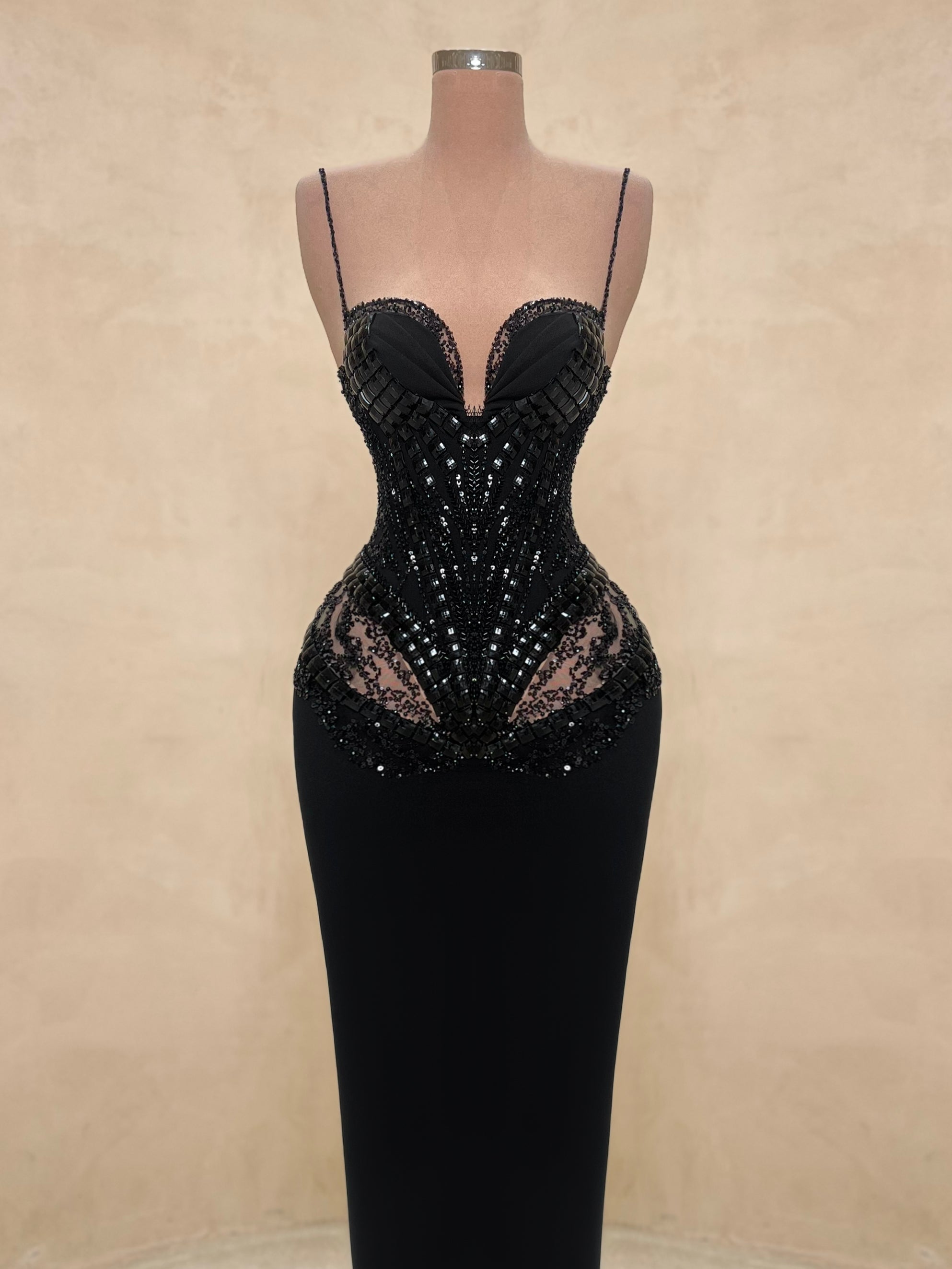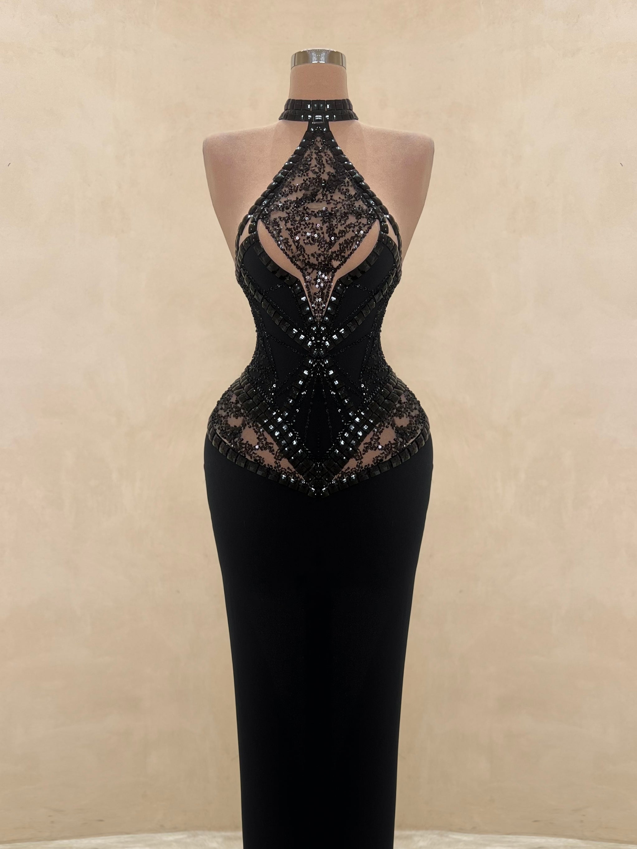 • Hand-applied black sequins and crystal beading