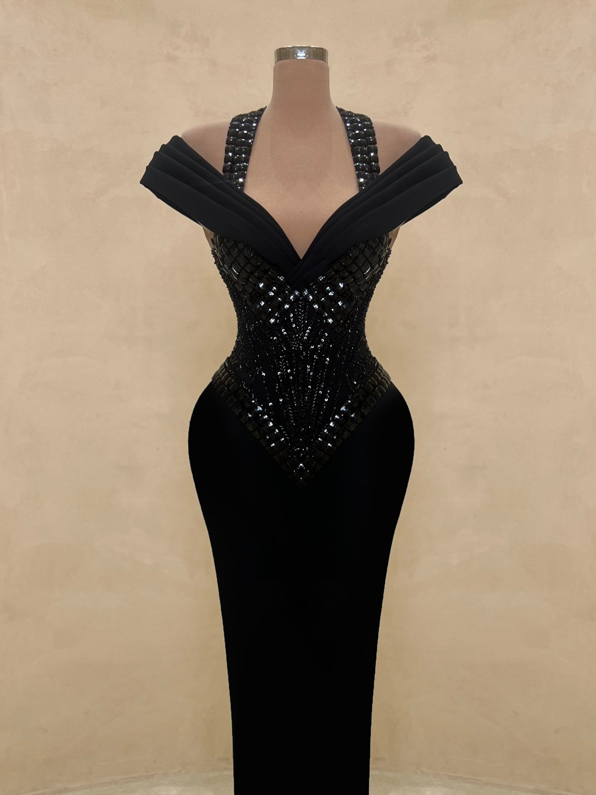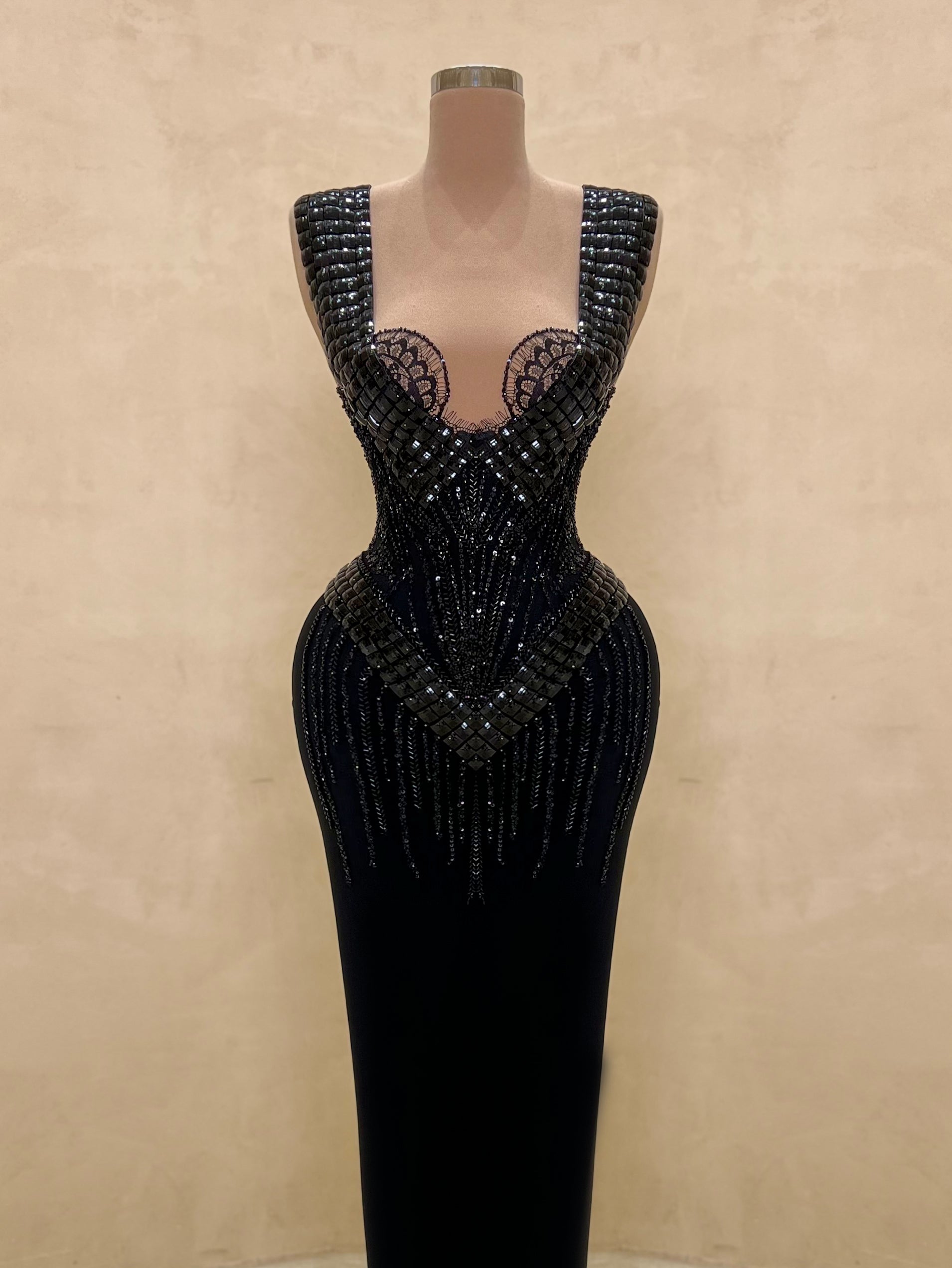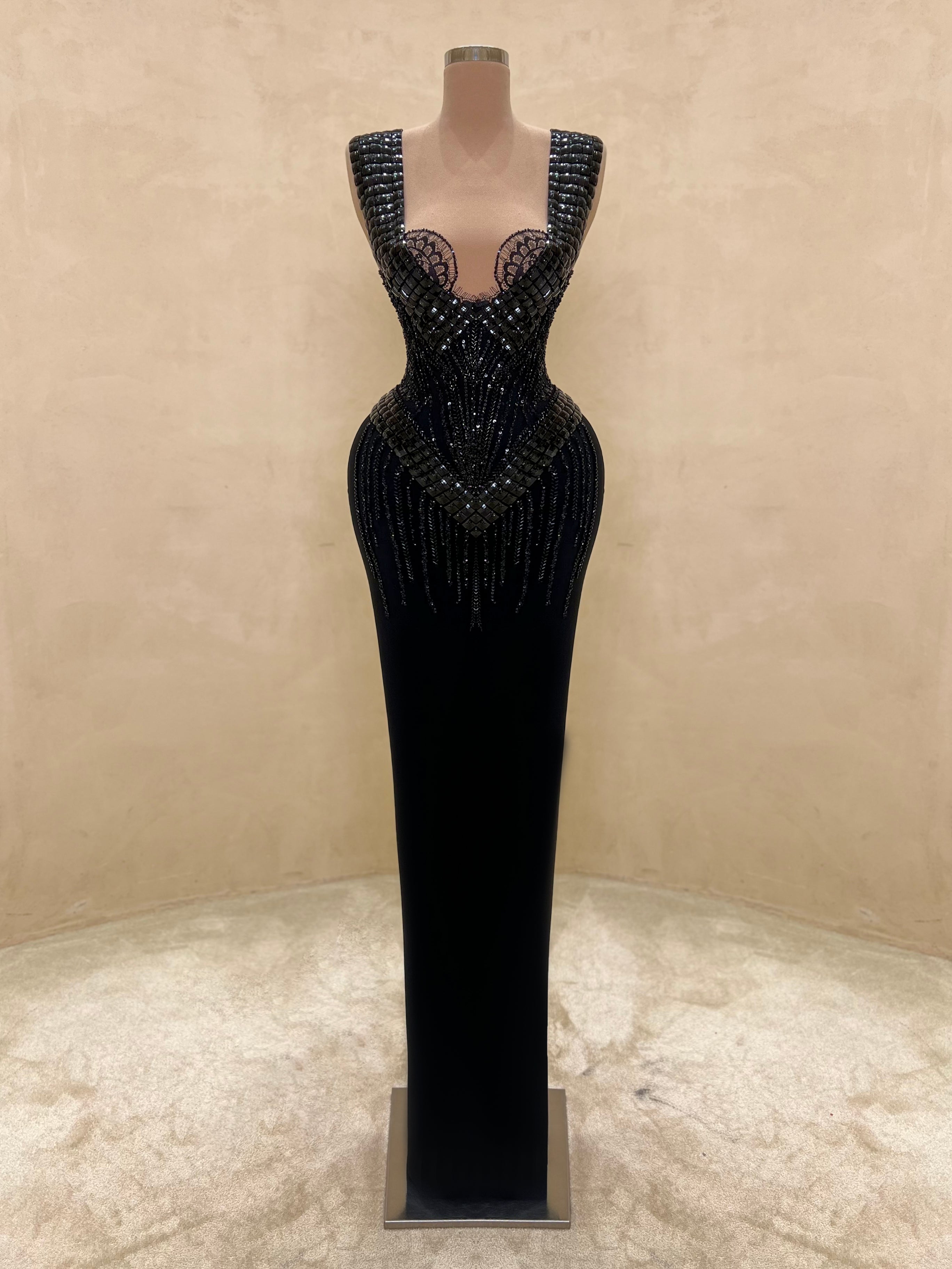 • Dense black sequin and crystal embellishment