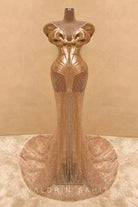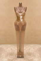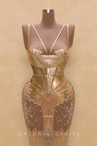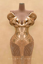 Unveil a masterpiece of couture with this gold embellished evening gown. Sculpted like a second skin, the dress features an architectural bodice with fluid, armor-like curves that highlight the feminine form with bold artistry. Intricate crystal embroidery cascades seamlessly into a sheer, figure-contouring skirt, creating a breathtaking illusion of light and movement.