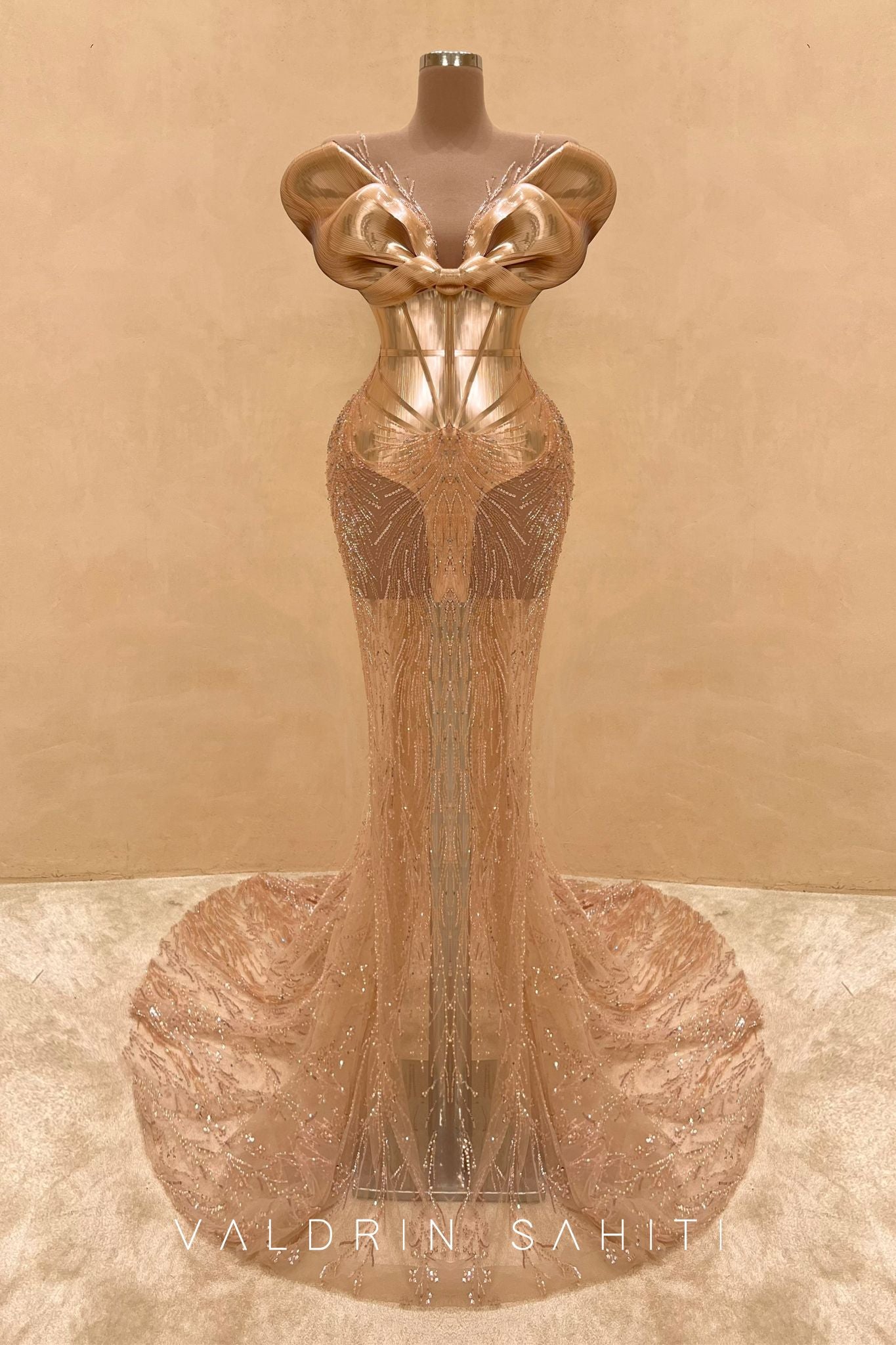 This design embodies Sahiti’s signature fusion of seduction, craftsmanship, and modern regality, making it an unforgettable choice for gala events, high-fashion editorials, or red-carpet appearances. A gown that transforms every step into a statement, it is the epitome of couture glamour.