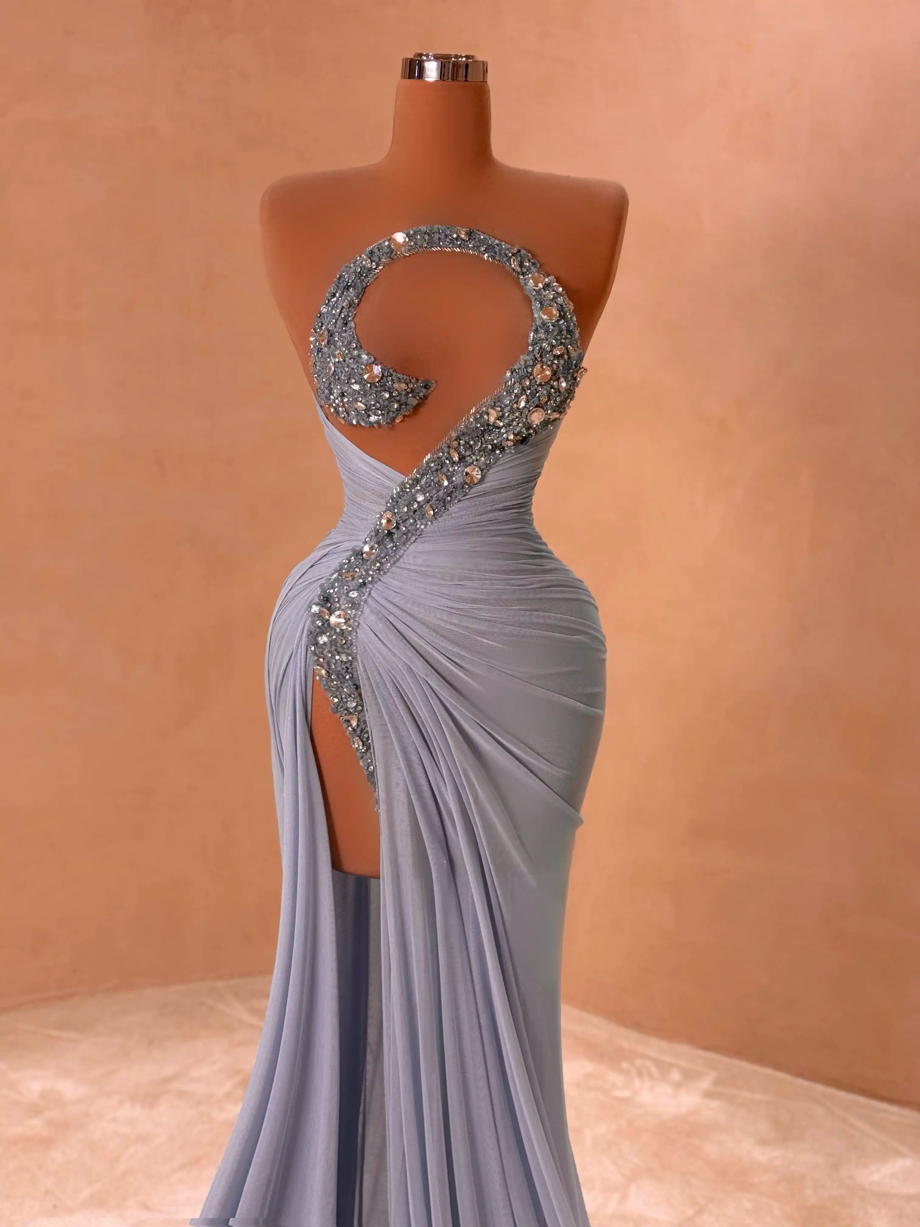 Command attention in this icy lavender gown, detailed with crystal-encrusted bust cups, bold front cutout, and flowing shoulder capes. The fitted silhouette and starburst waistline create an unforgettable red carpet moment.