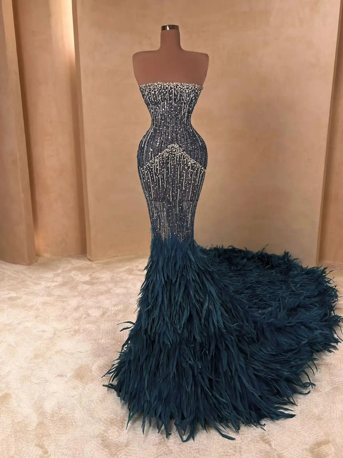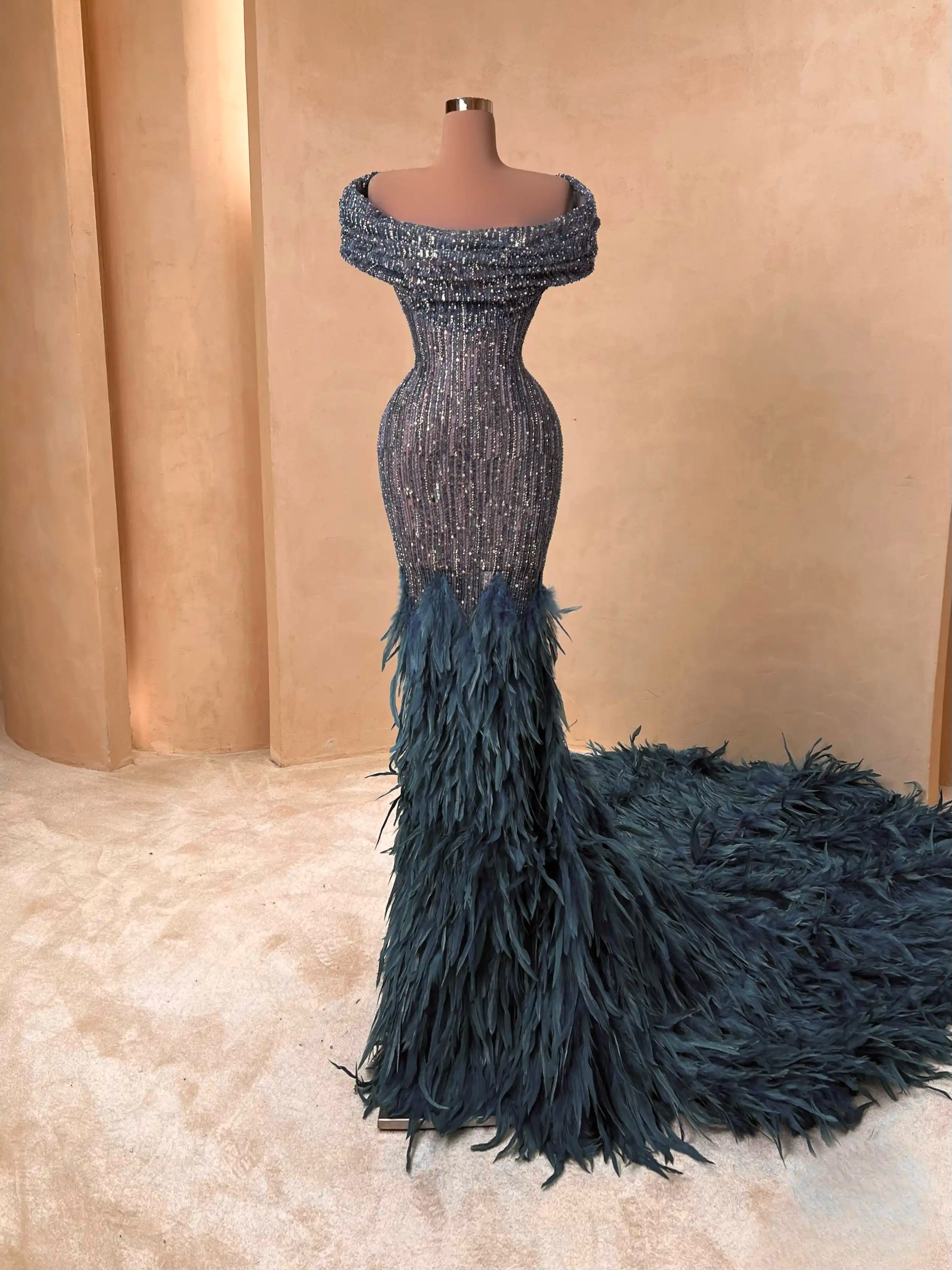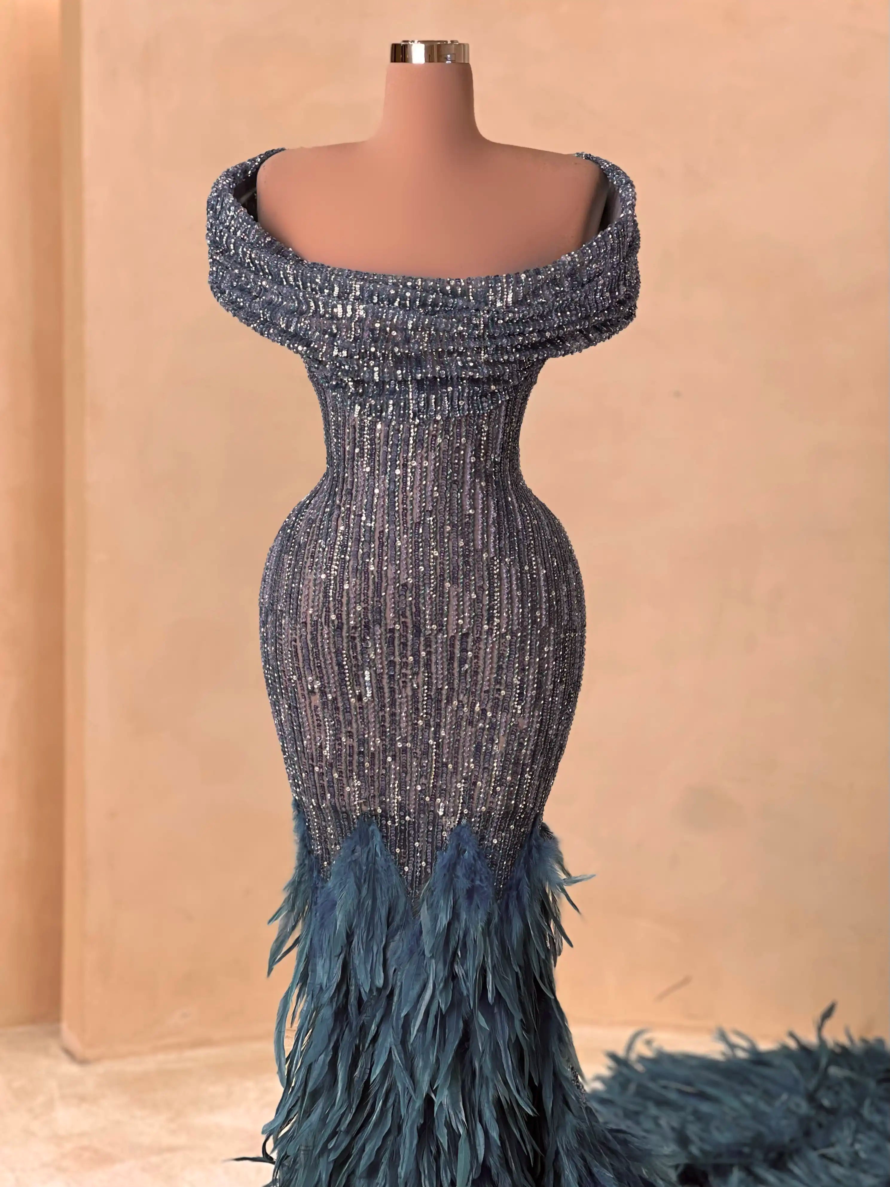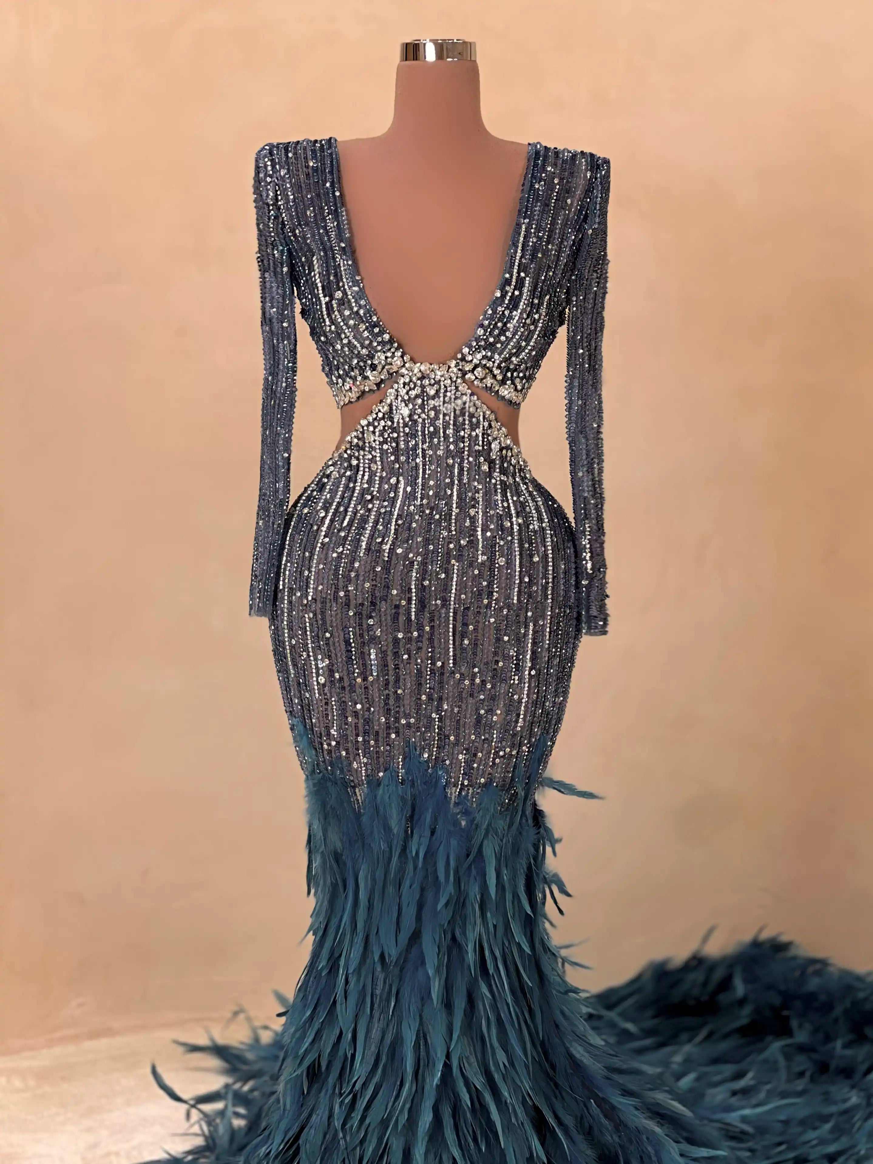 A breathtaking mermaid silhouette adorned with dazzling silver beading and dramatic feather embellishments. This metallic gunmetal gown features a plunging neckline and illusion mesh detailing that sculpts the figure beautifully. Finished with a feathered train that adds red carpet-worthy flair.