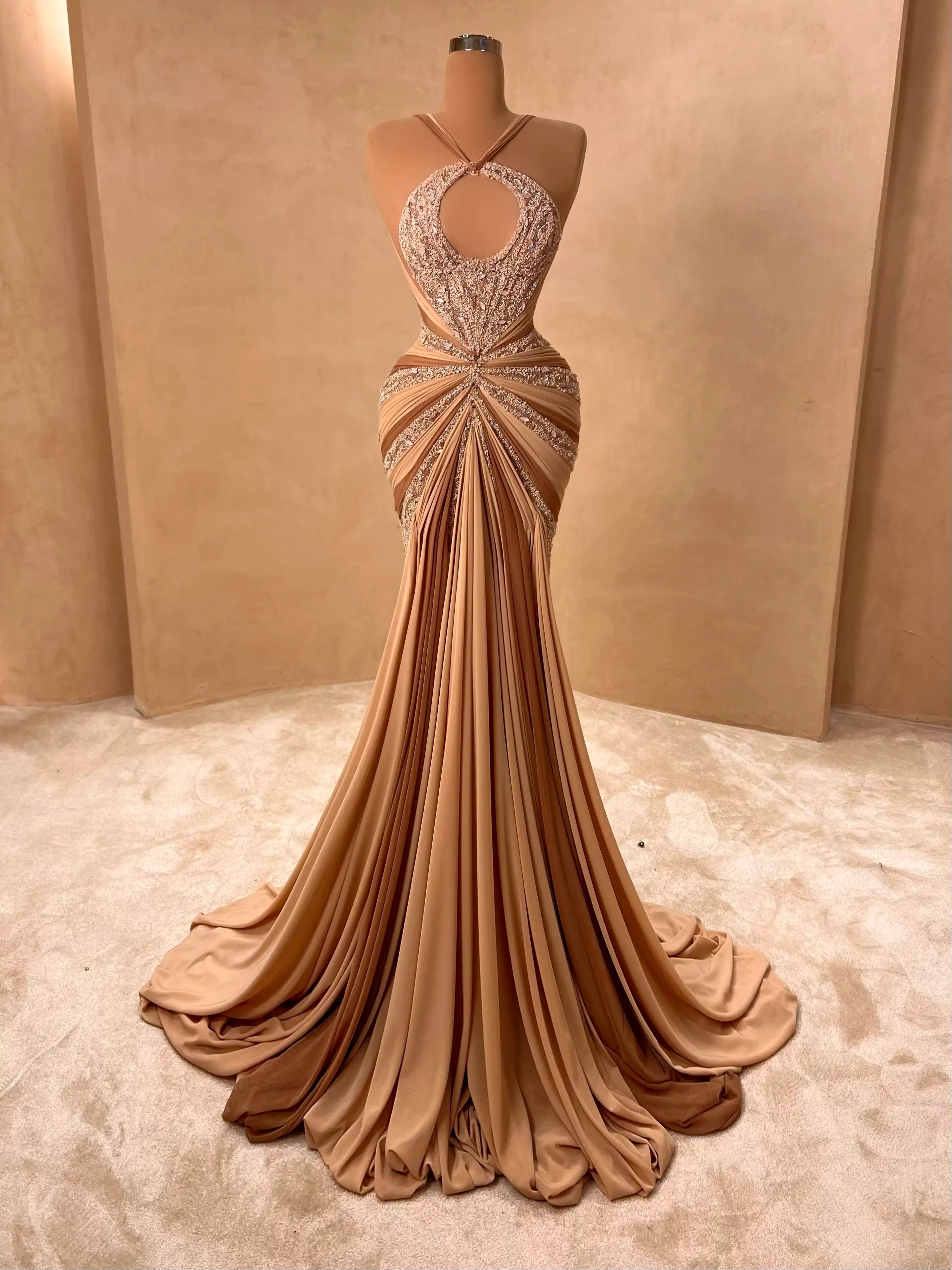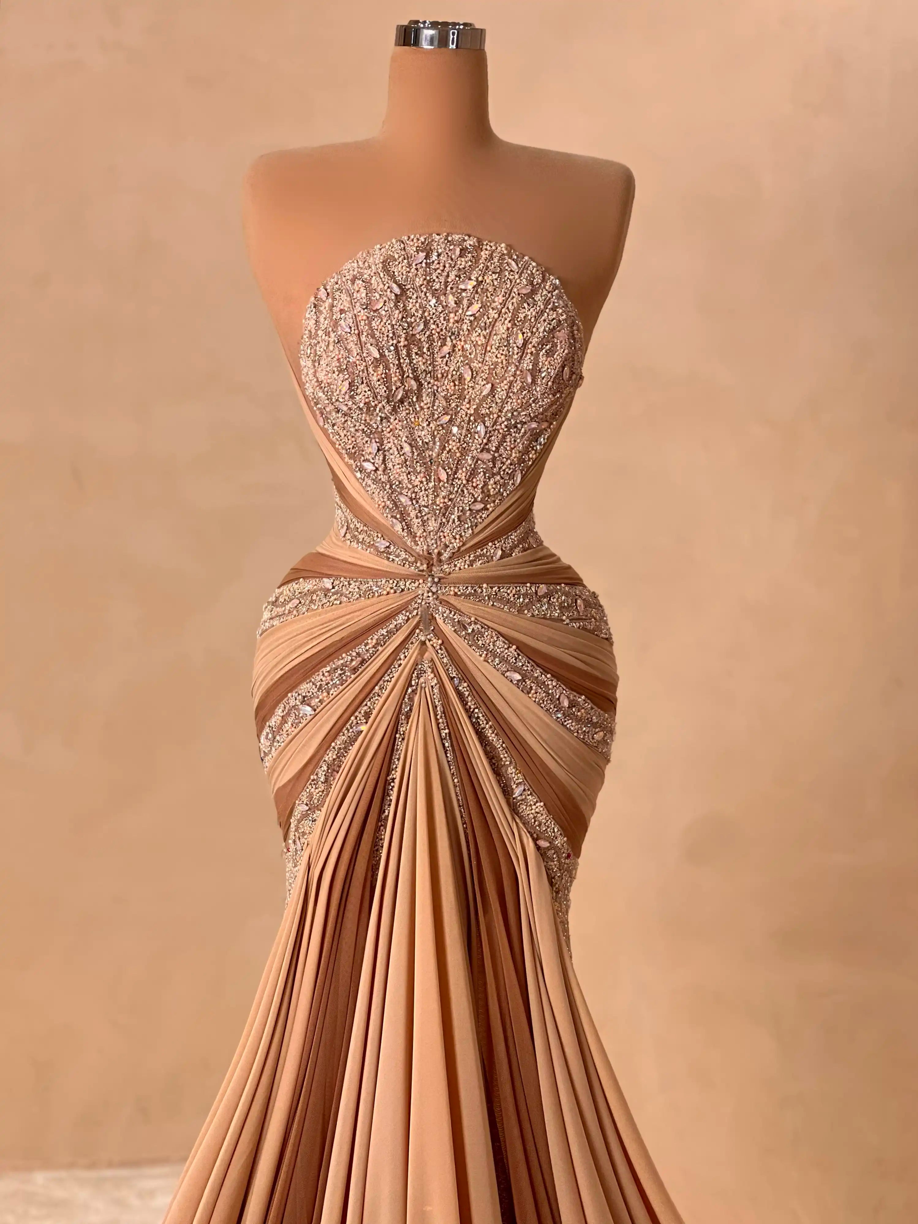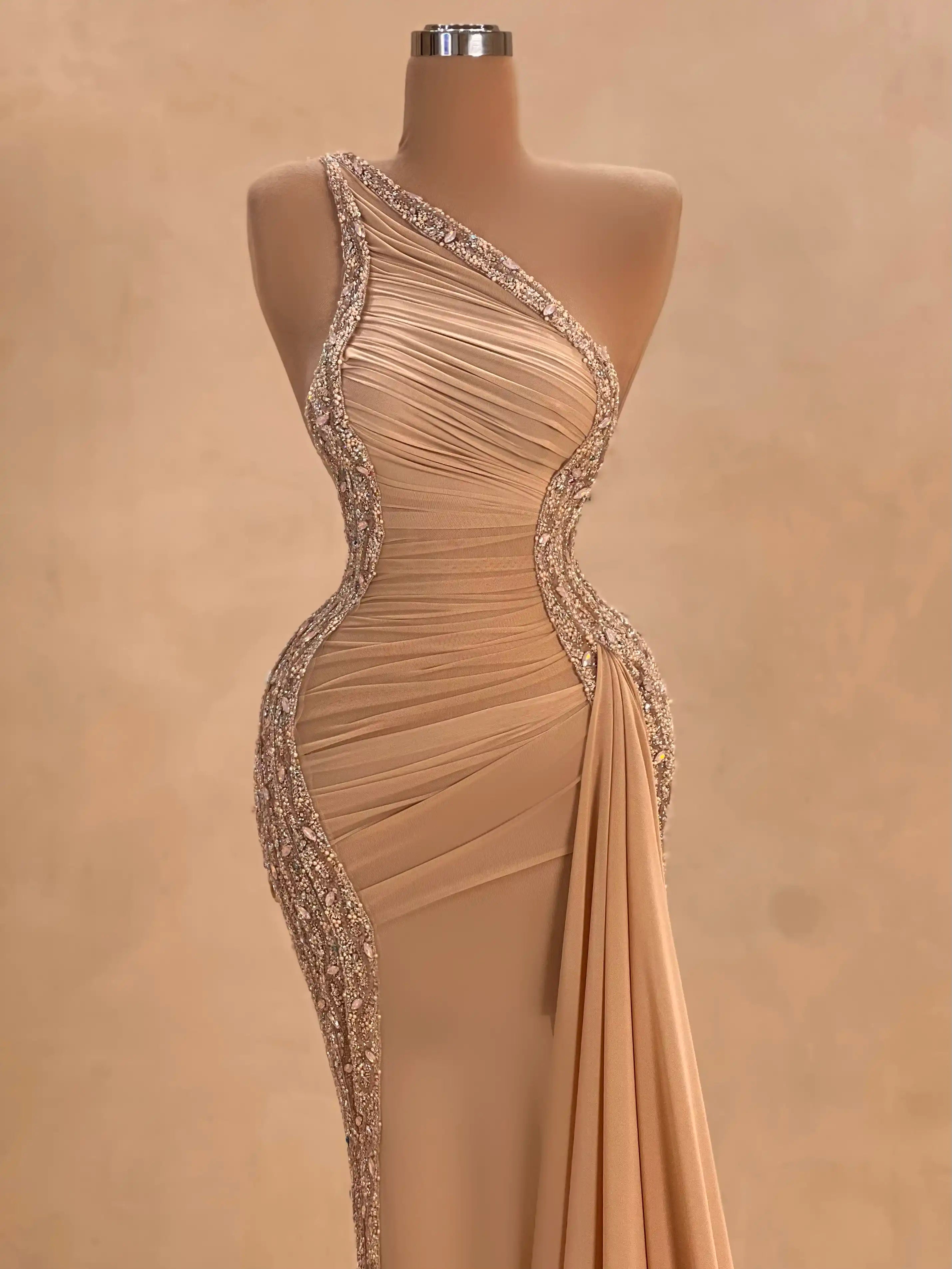 Make a lasting impression with this glamorous nude evening gown. Designed with intricate embellishments and elegant draping, it contours the body beautifully while the flowing silhouette adds movement and grace. Perfect for upscale galas, red carpet events, or high-profile weddings.