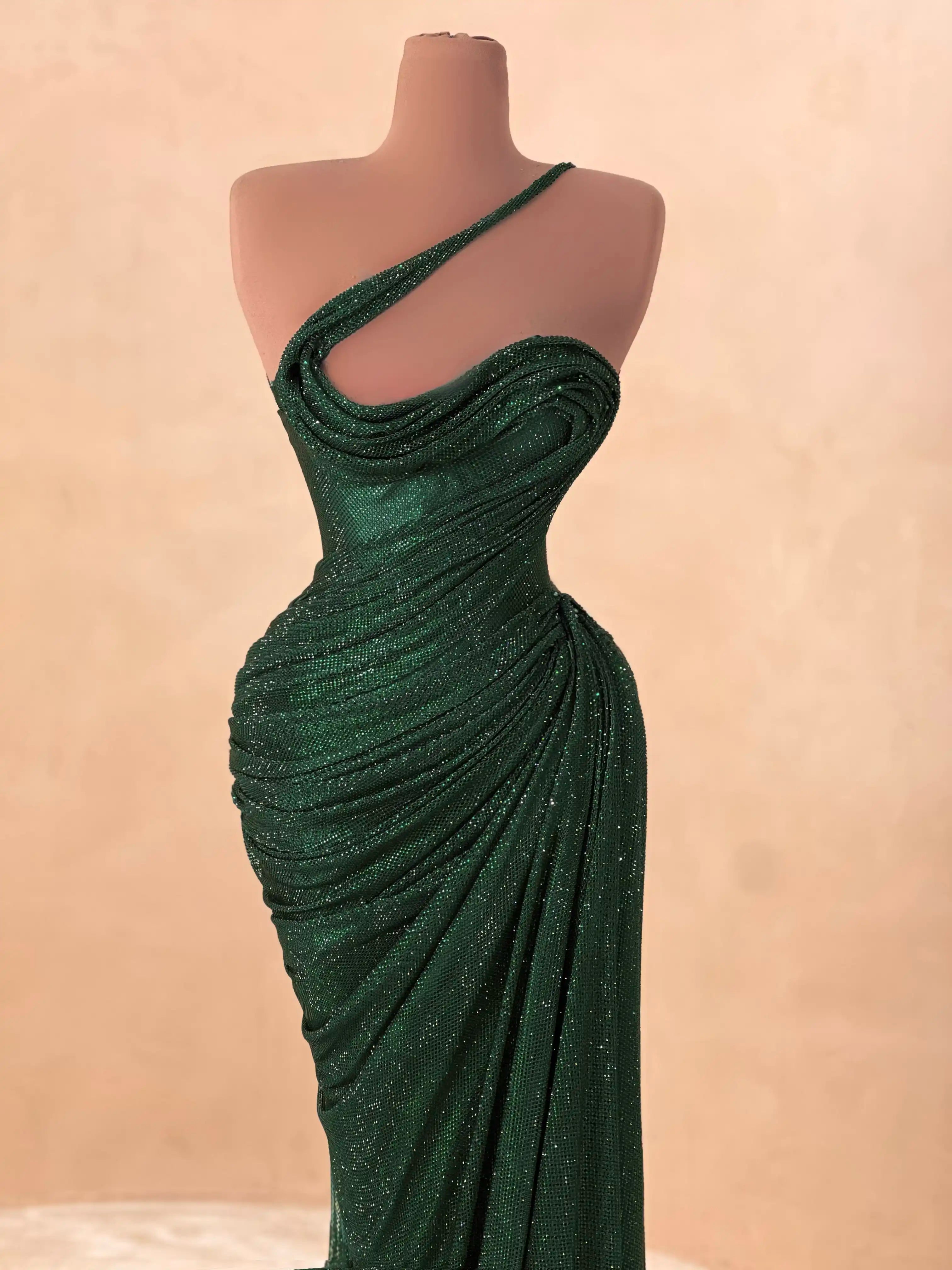 Grace meets grandeur in this deep emerald gown, designed with asymmetrical draping and a single shoulder neckline. The gathered waist and fitted silhouette sculpt the figure for a timeless, statuesque effect.