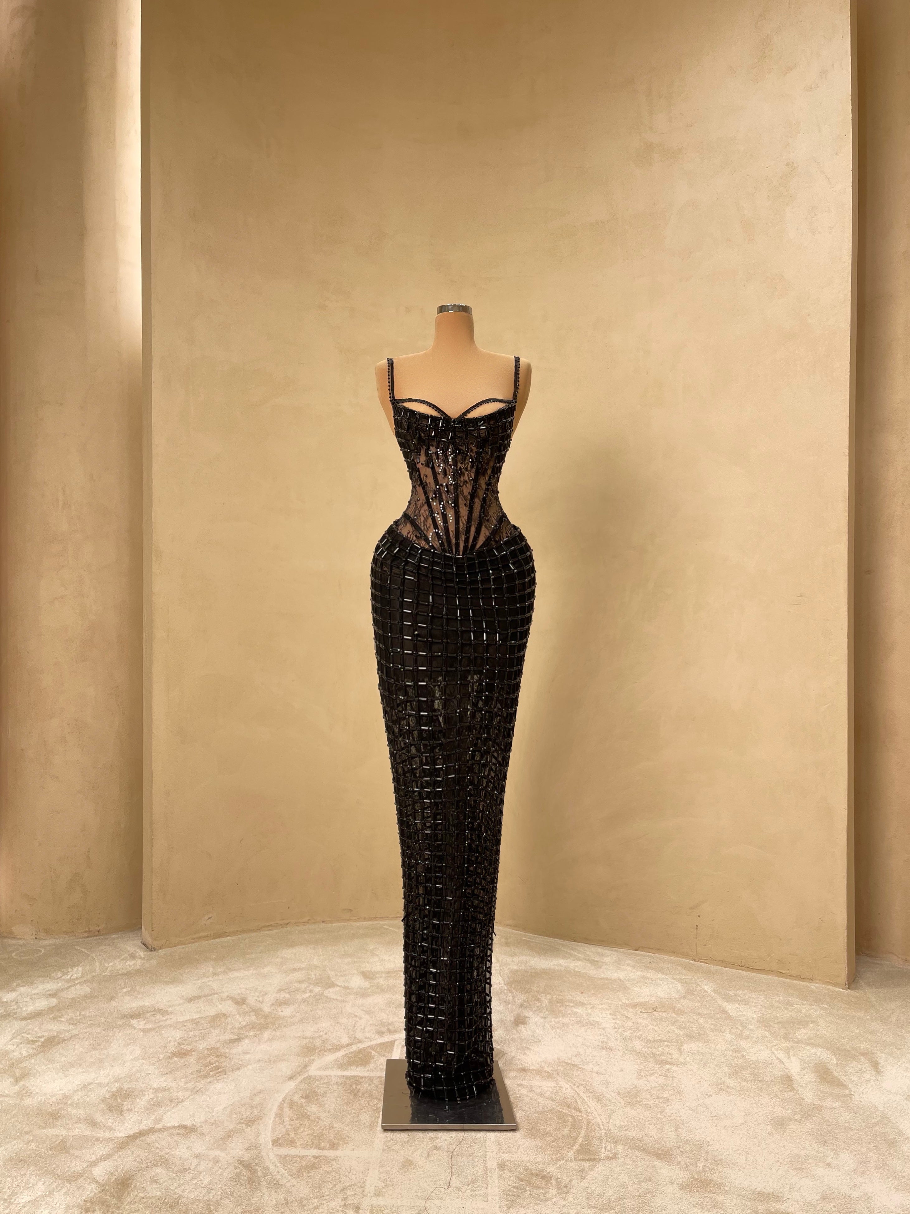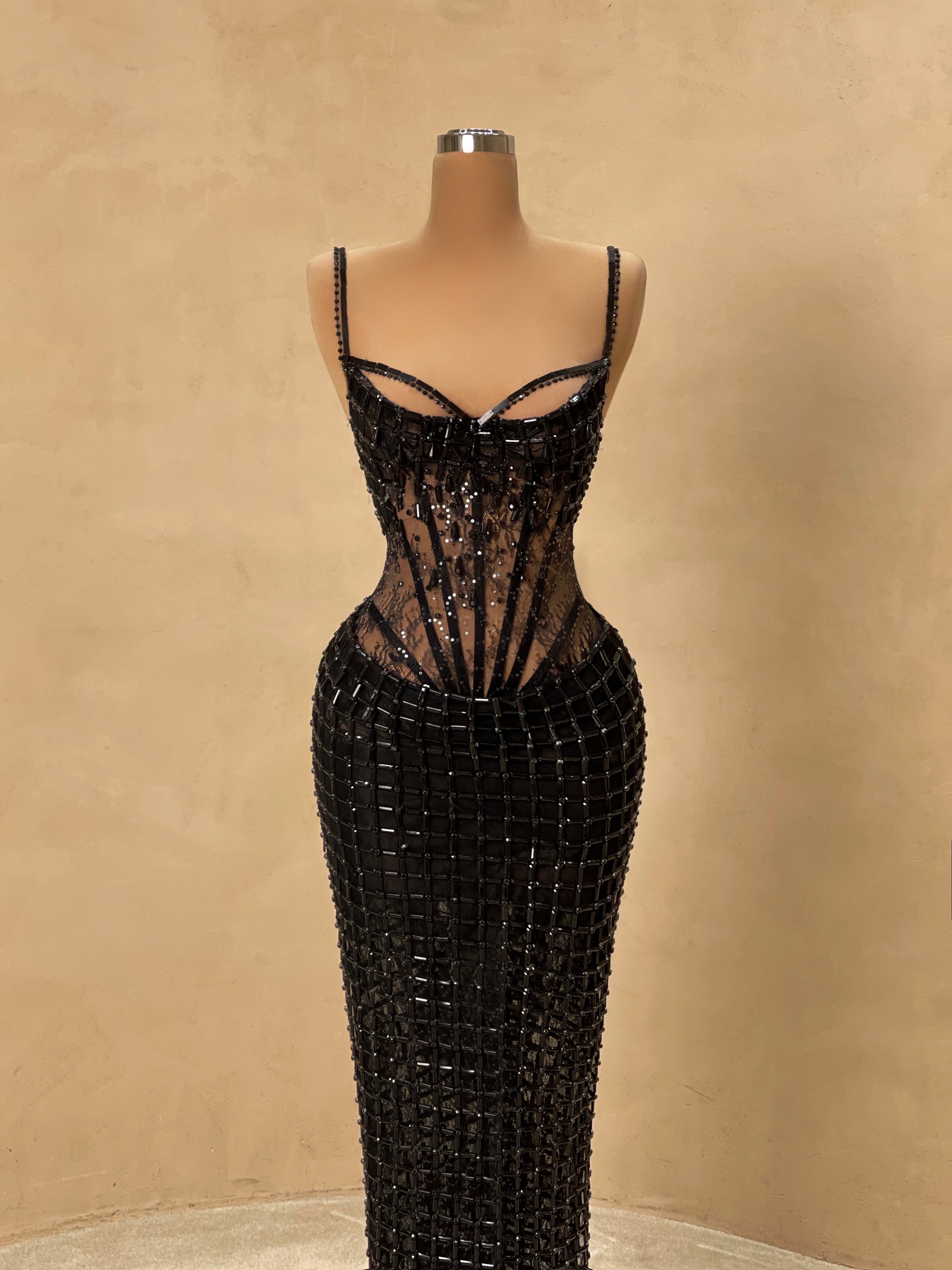 Sensual and structured, this black gown features a sheer corset bodice adorned with geometric crystal embellishments. The body-hugging silhouette, paired with a deep neckline and bold design, makes this a daring pick for red carpets, upscale parties, or evening fashion shows.