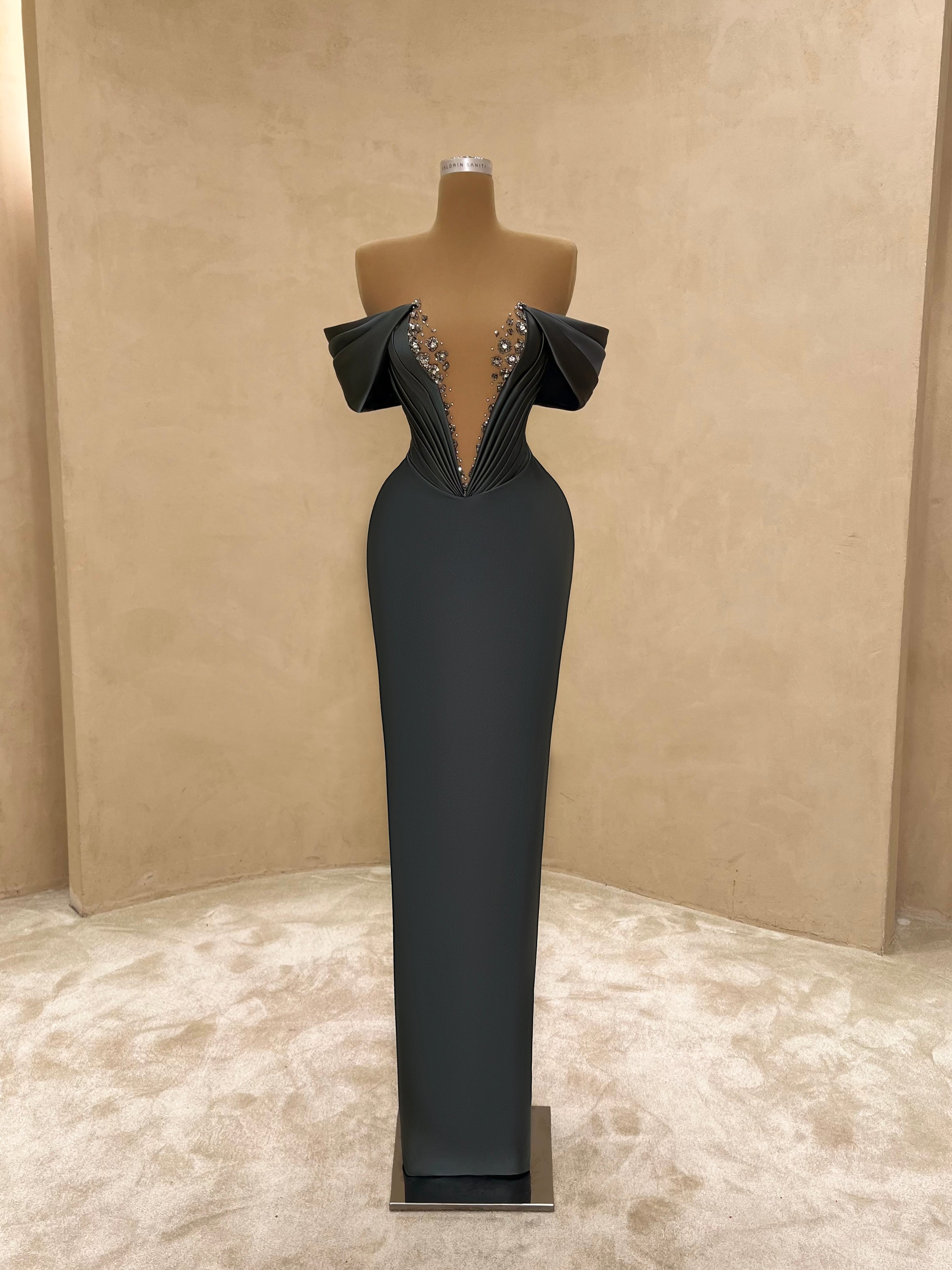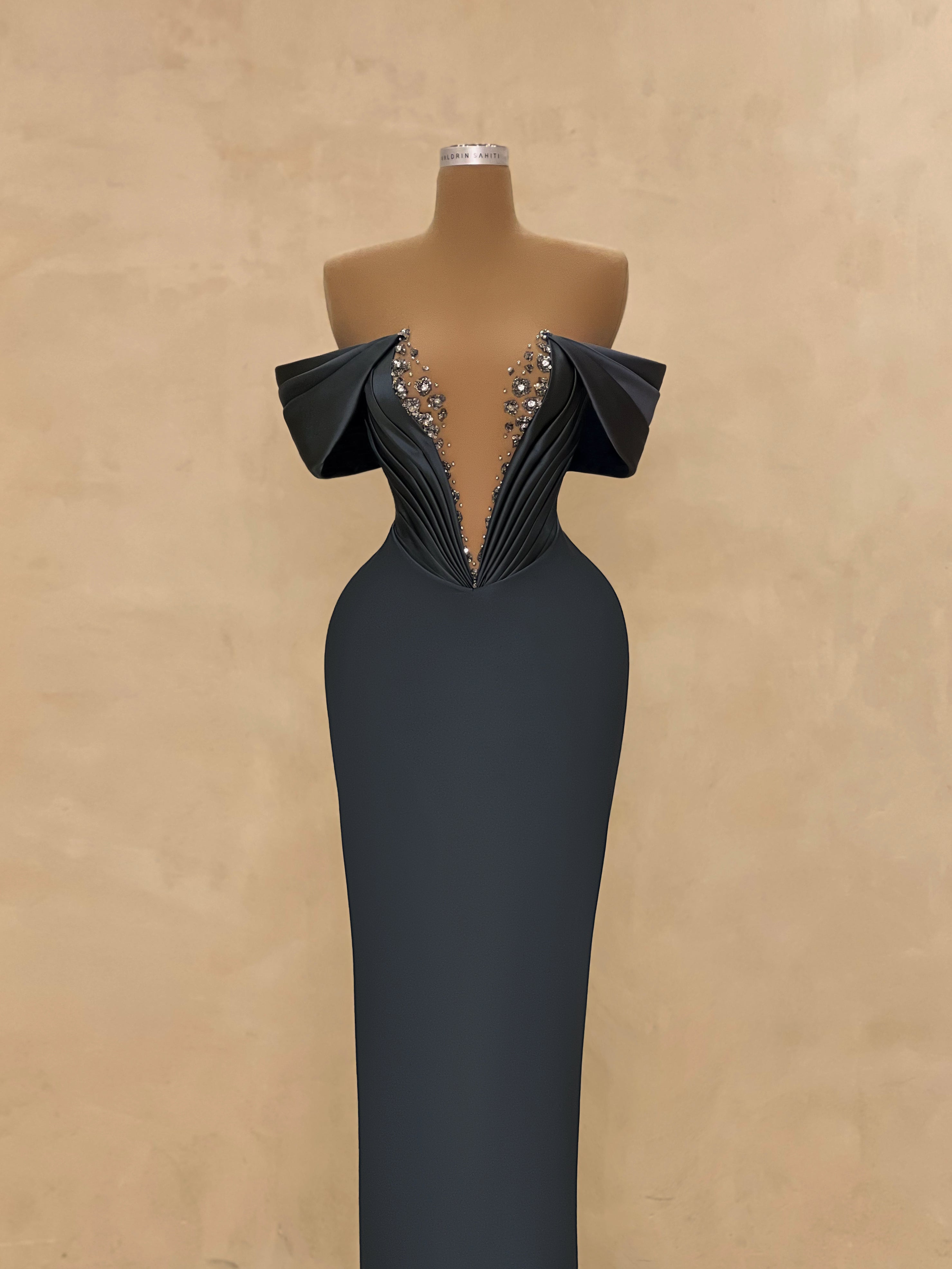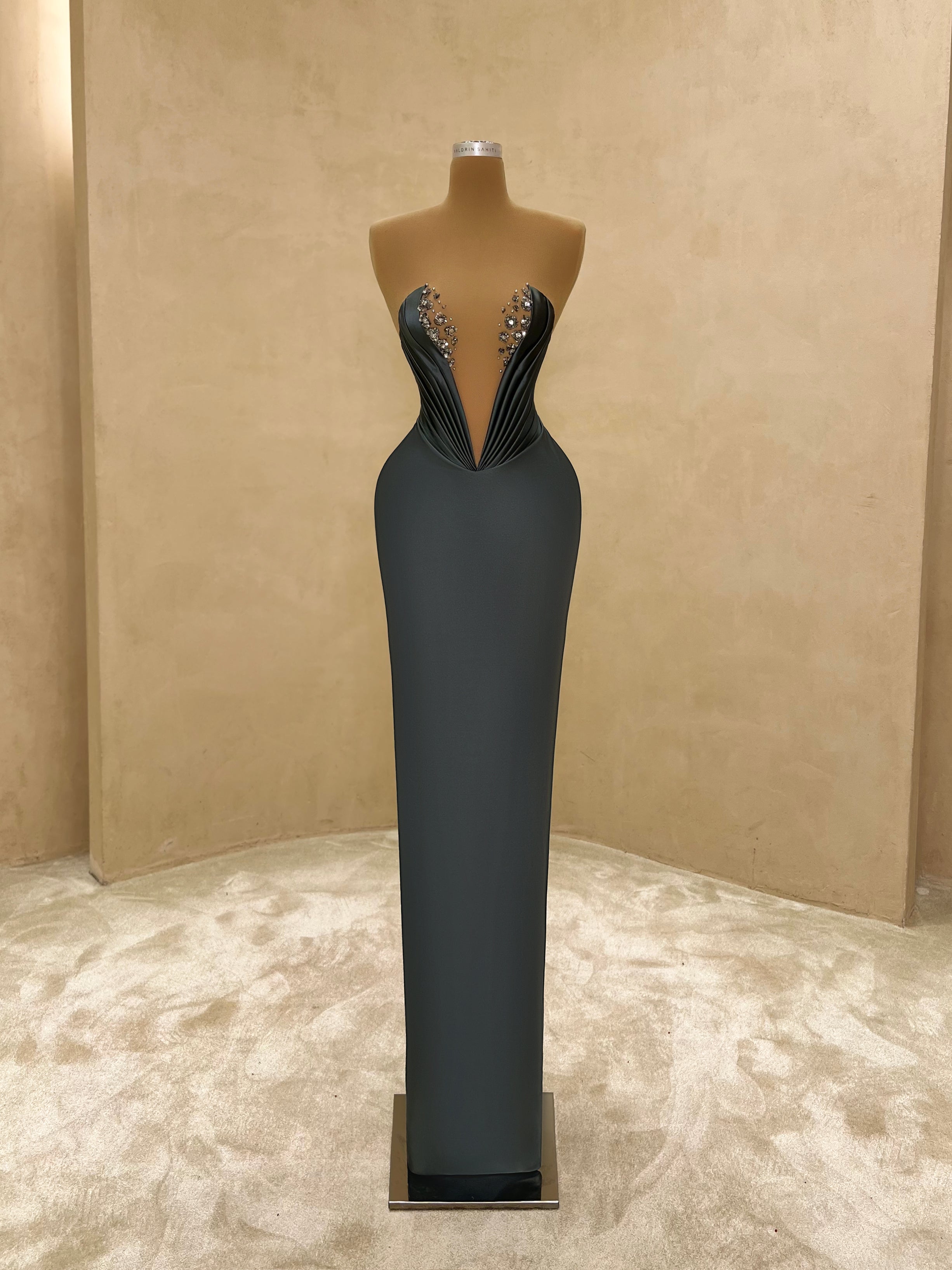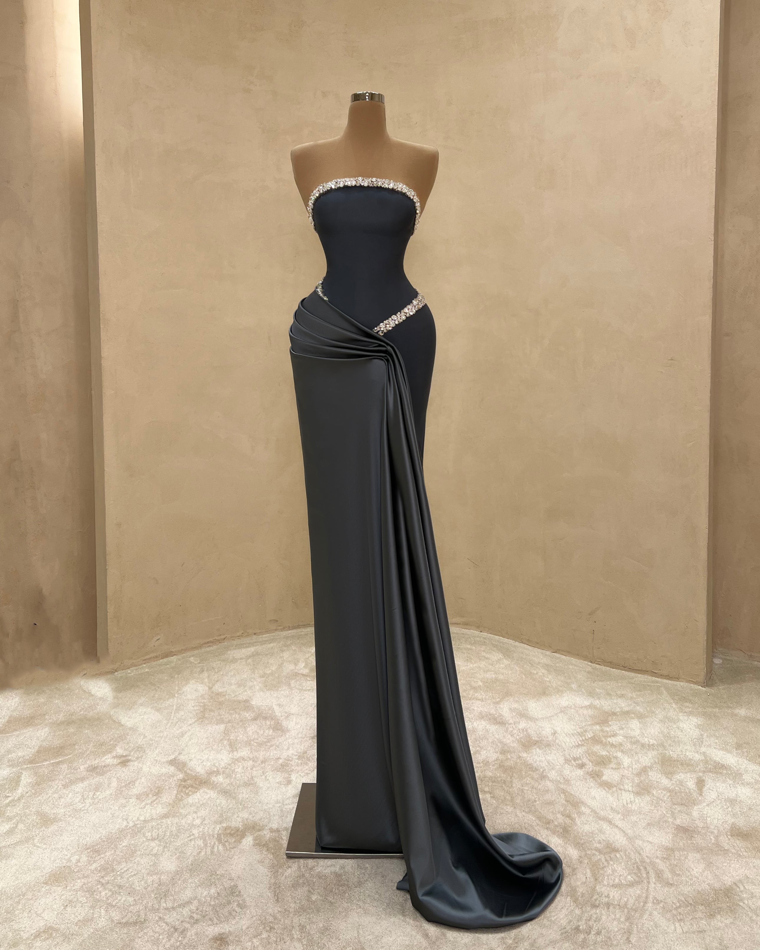 Sleek and sophisticated, this strapless gown features a crystal-lined sweetheart neckline and a dazzling crystal swirl across the bodice and waist. The structured fit accentuates your curves, while the dramatic detail adds a high-fashion touch. Perfect for evening galas, red carpet events, or upscale soirées.