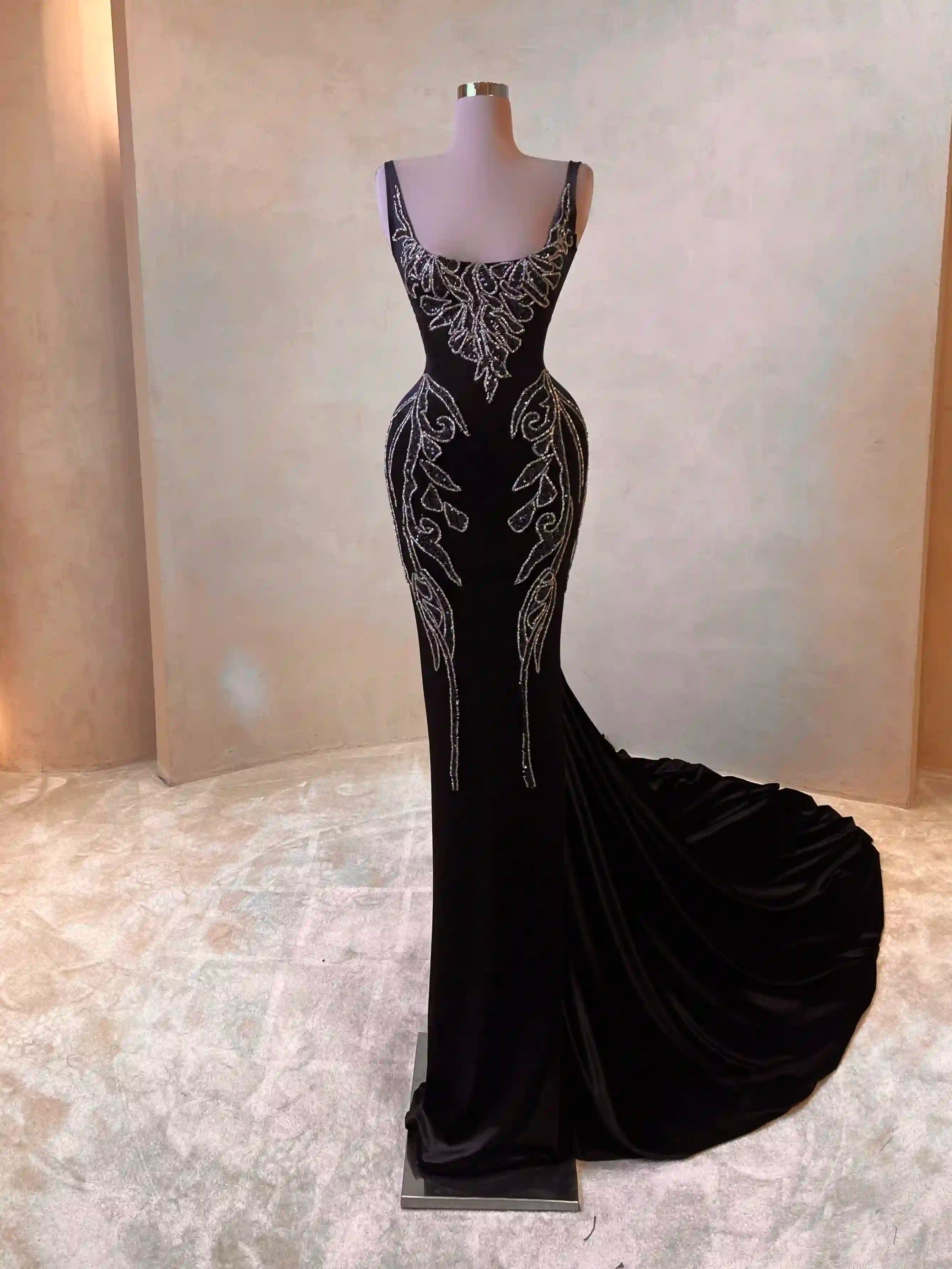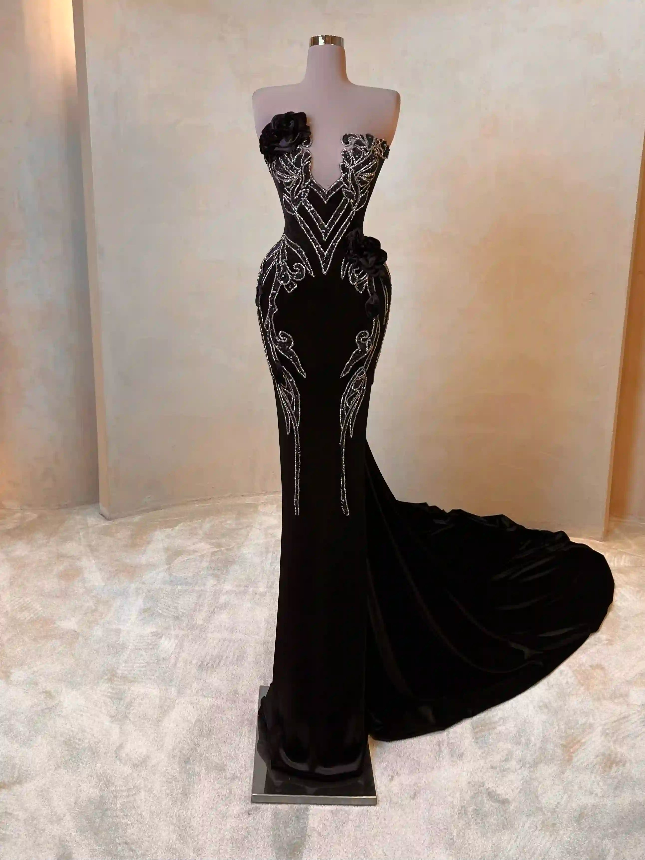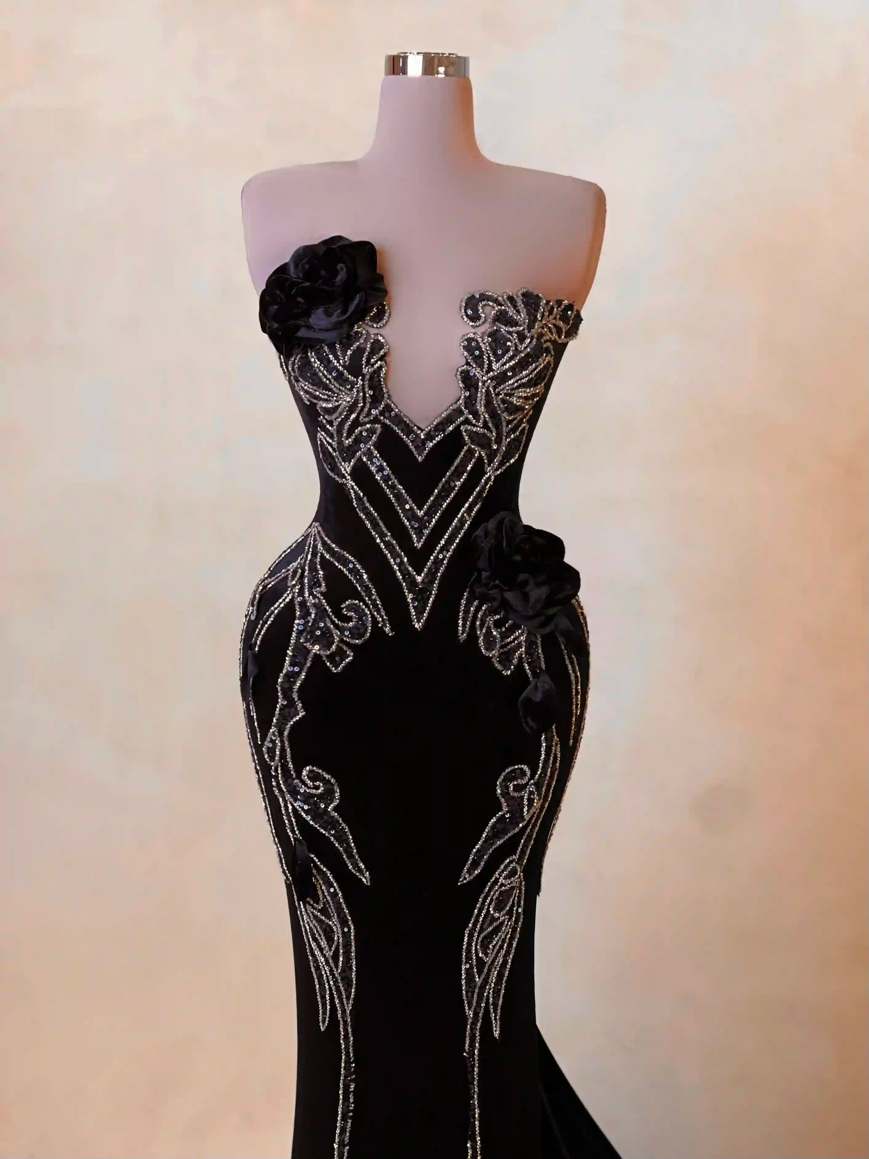 Classic black with a twist. This figure-hugging gown features silver embroidery that gracefully wraps around the bodice and hips. With a deep neckline and curve-enhancing structure, this look combines timeless elegance with red carpet appeal.