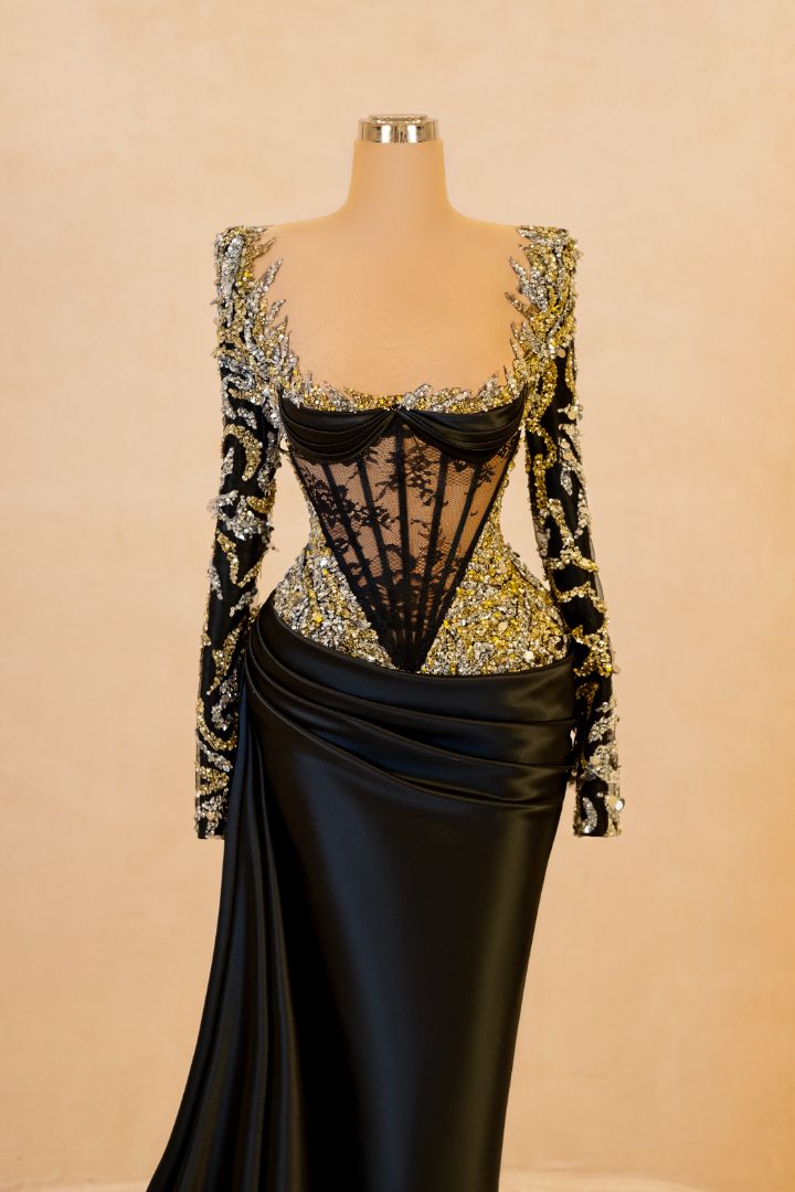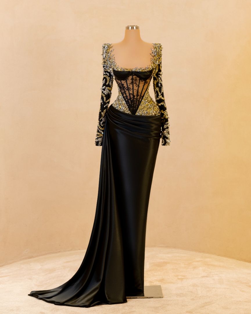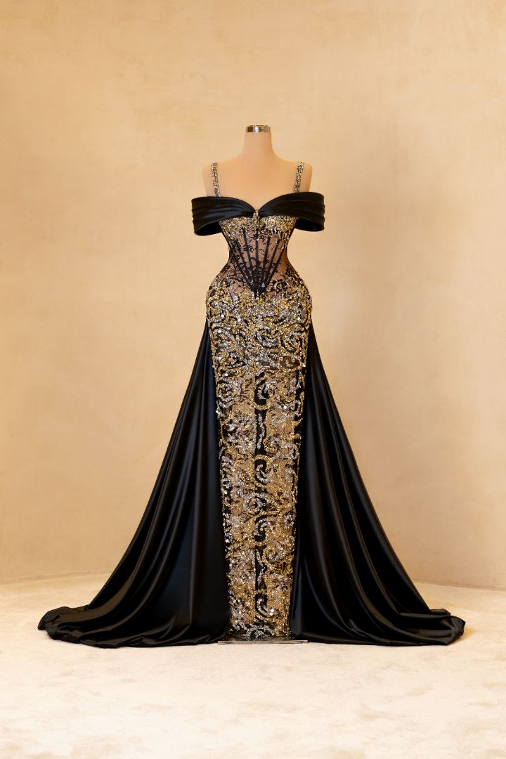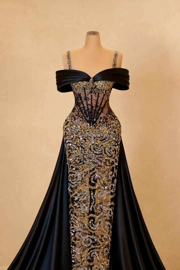This regal black and gold gown stuns with its hand-beaded embroidery, sheer corset detailing, and detachable cape. The off-shoulder design adds a luxurious flair while the body-hugging silhouette offers dramatic elegance. A true showstopper for red carpets and upscale galas.