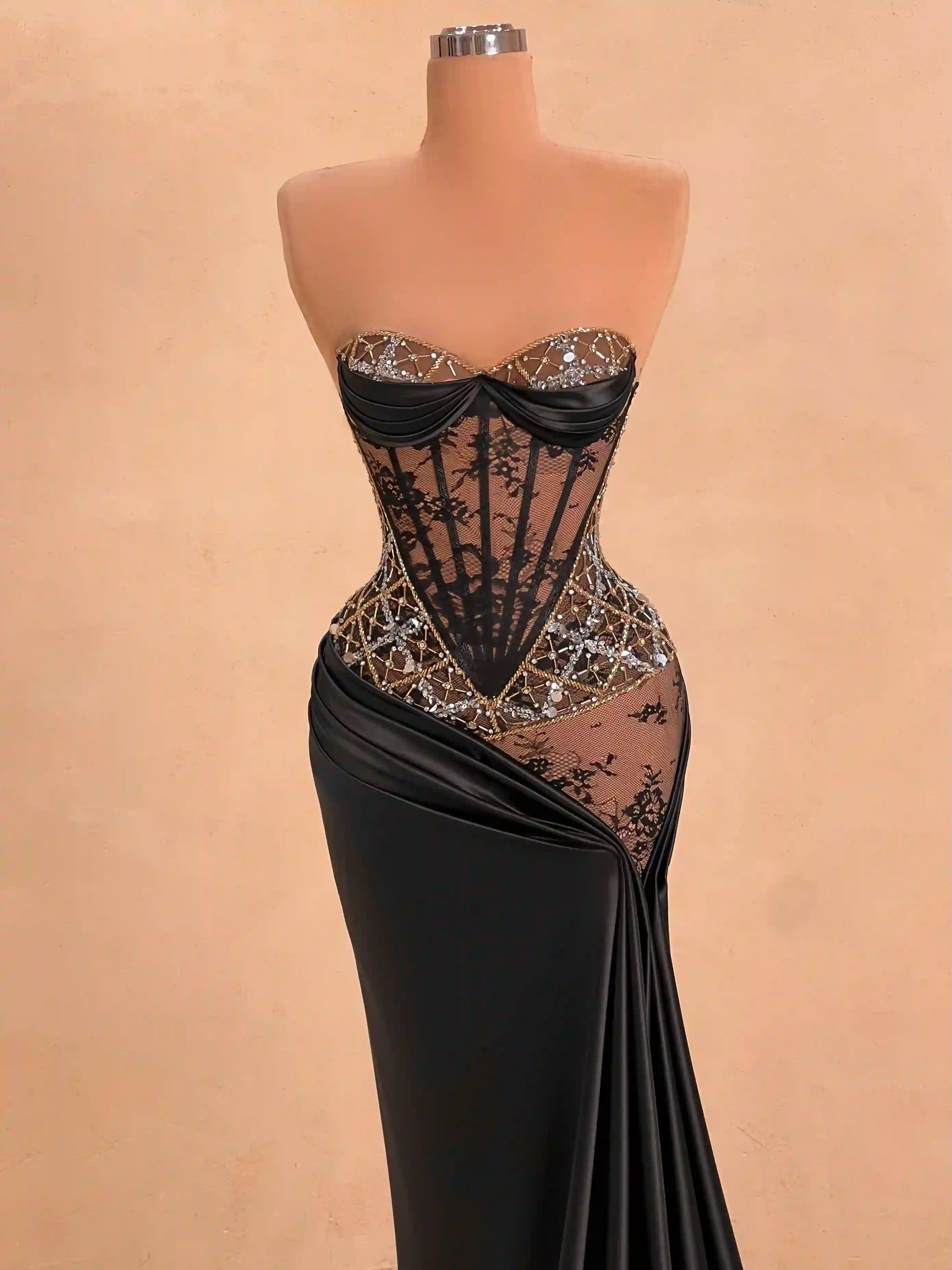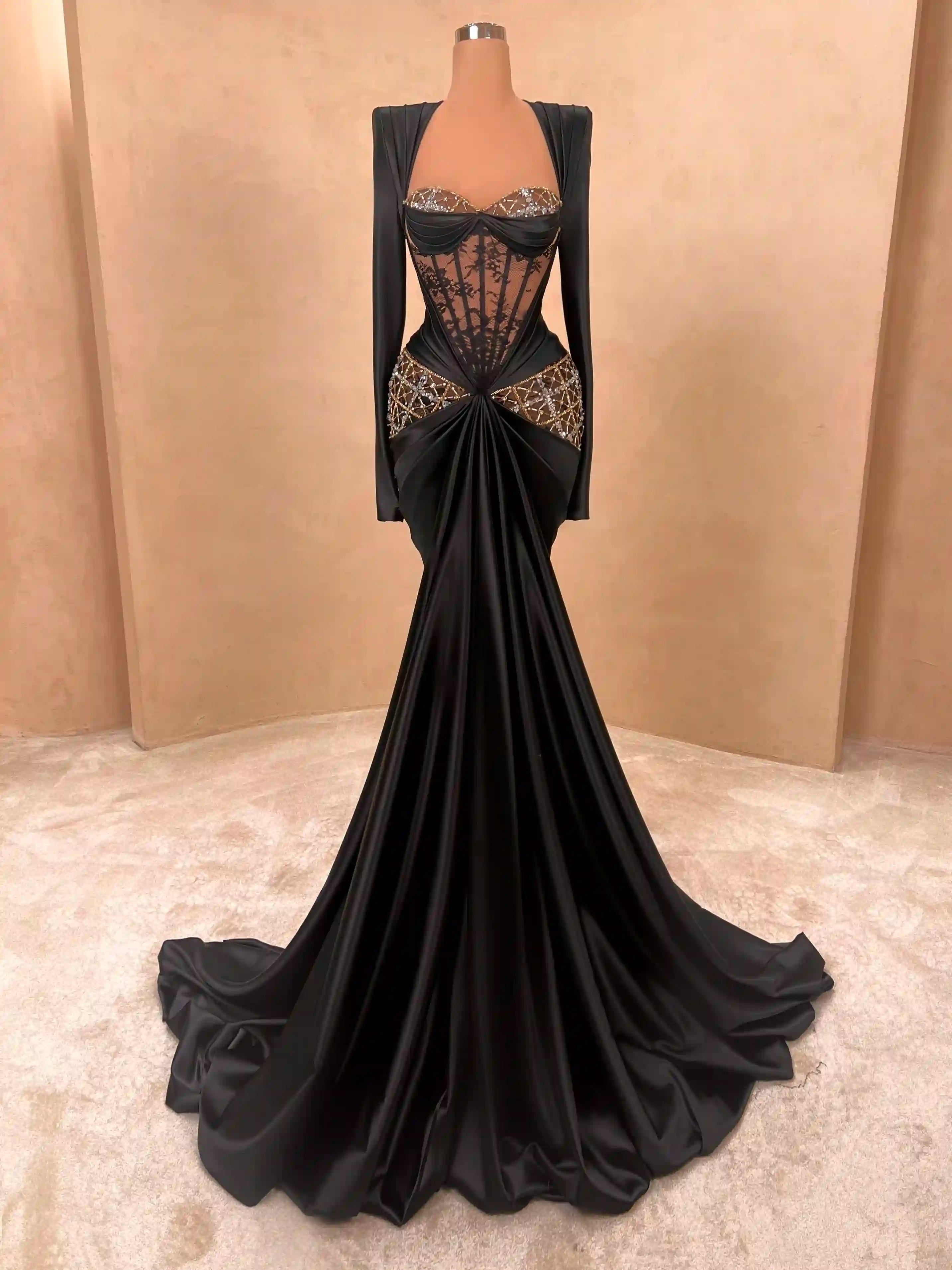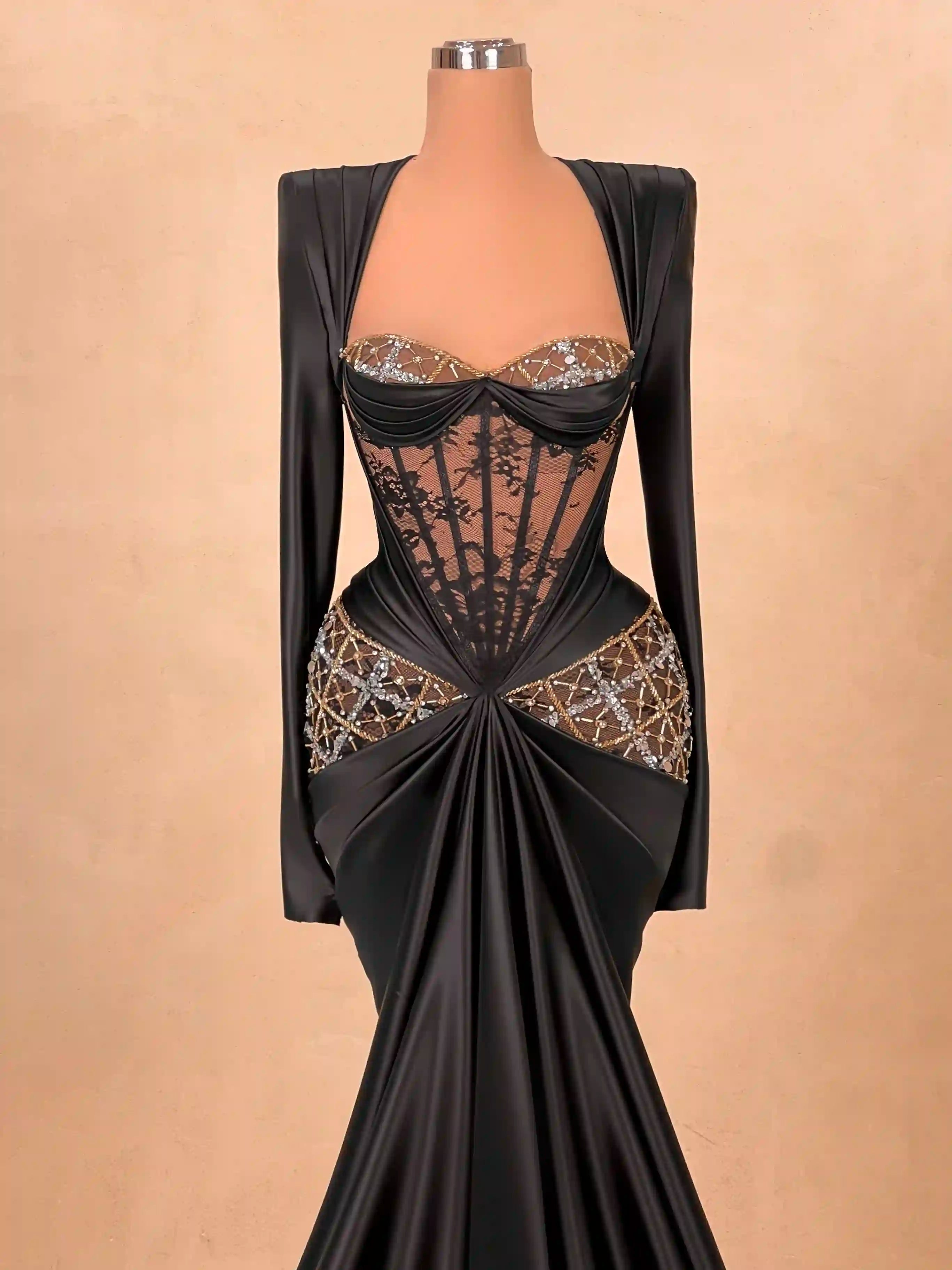 This regal black and gold gown stuns with its hand-beaded embroidery, sheer corset detailing, and detachable cape. The off-shoulder design adds a luxurious flair while the body-hugging silhouette offers dramatic elegance. A true showstopper for red carpets and upscale galas.