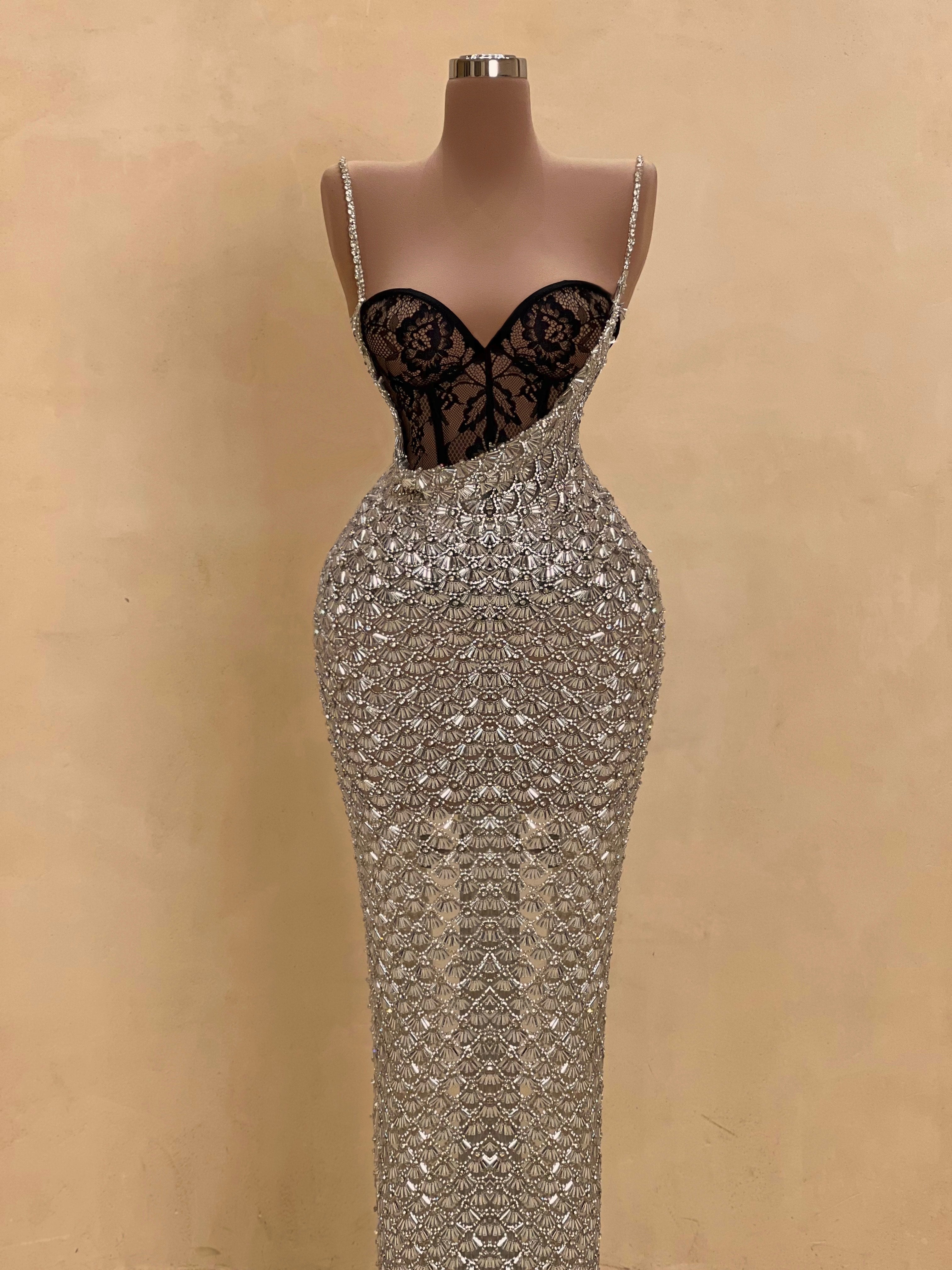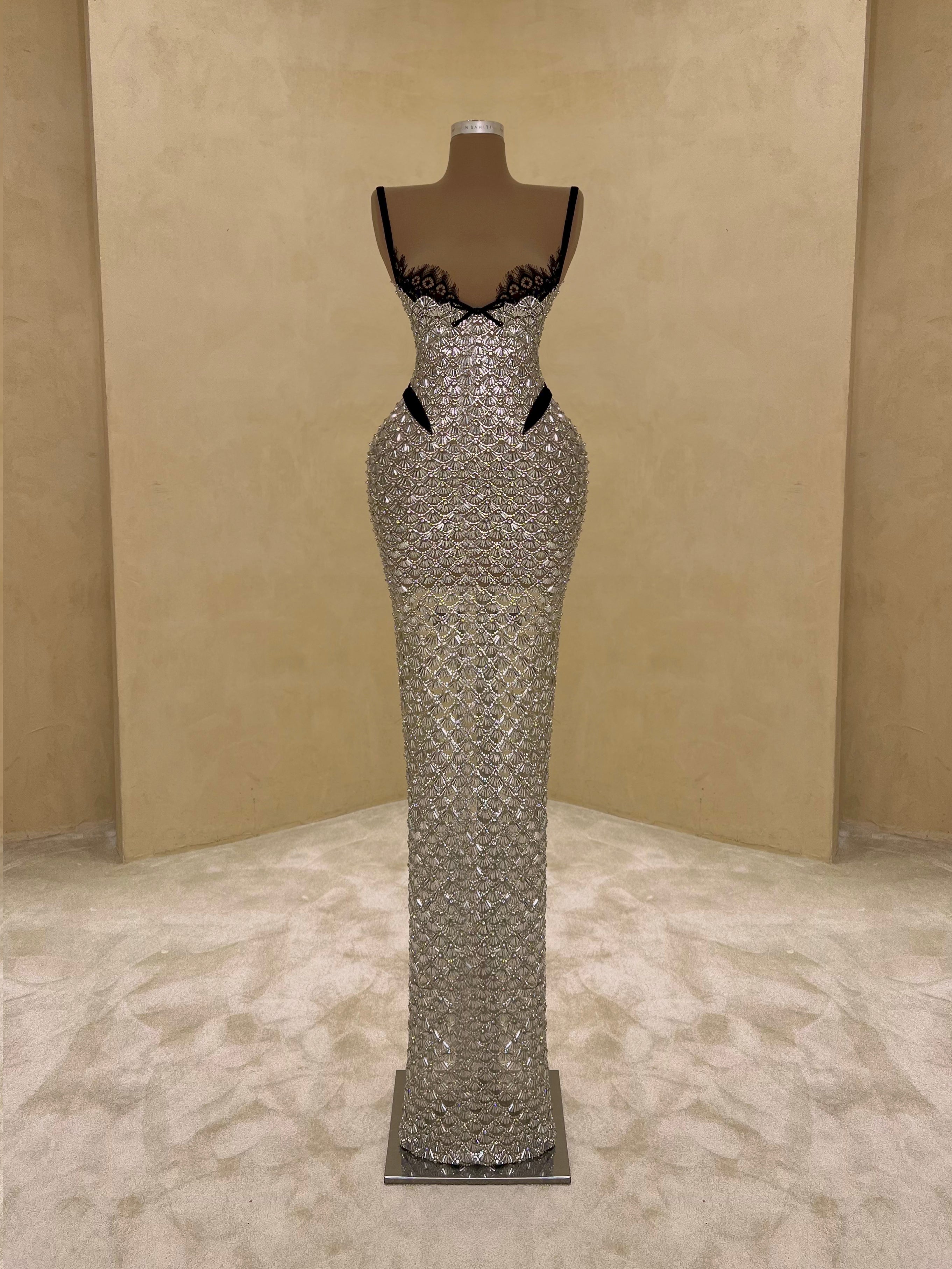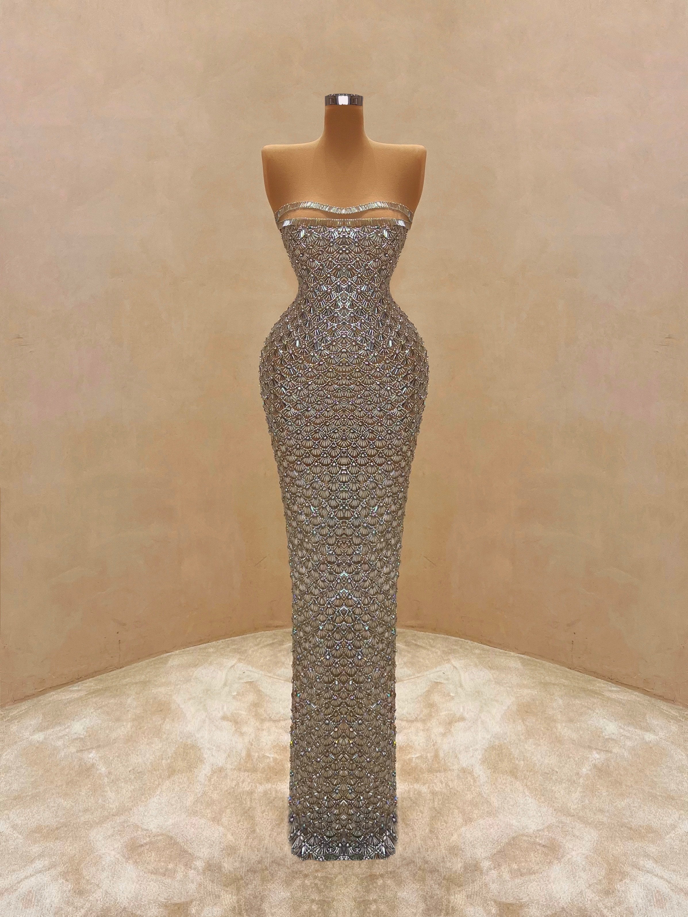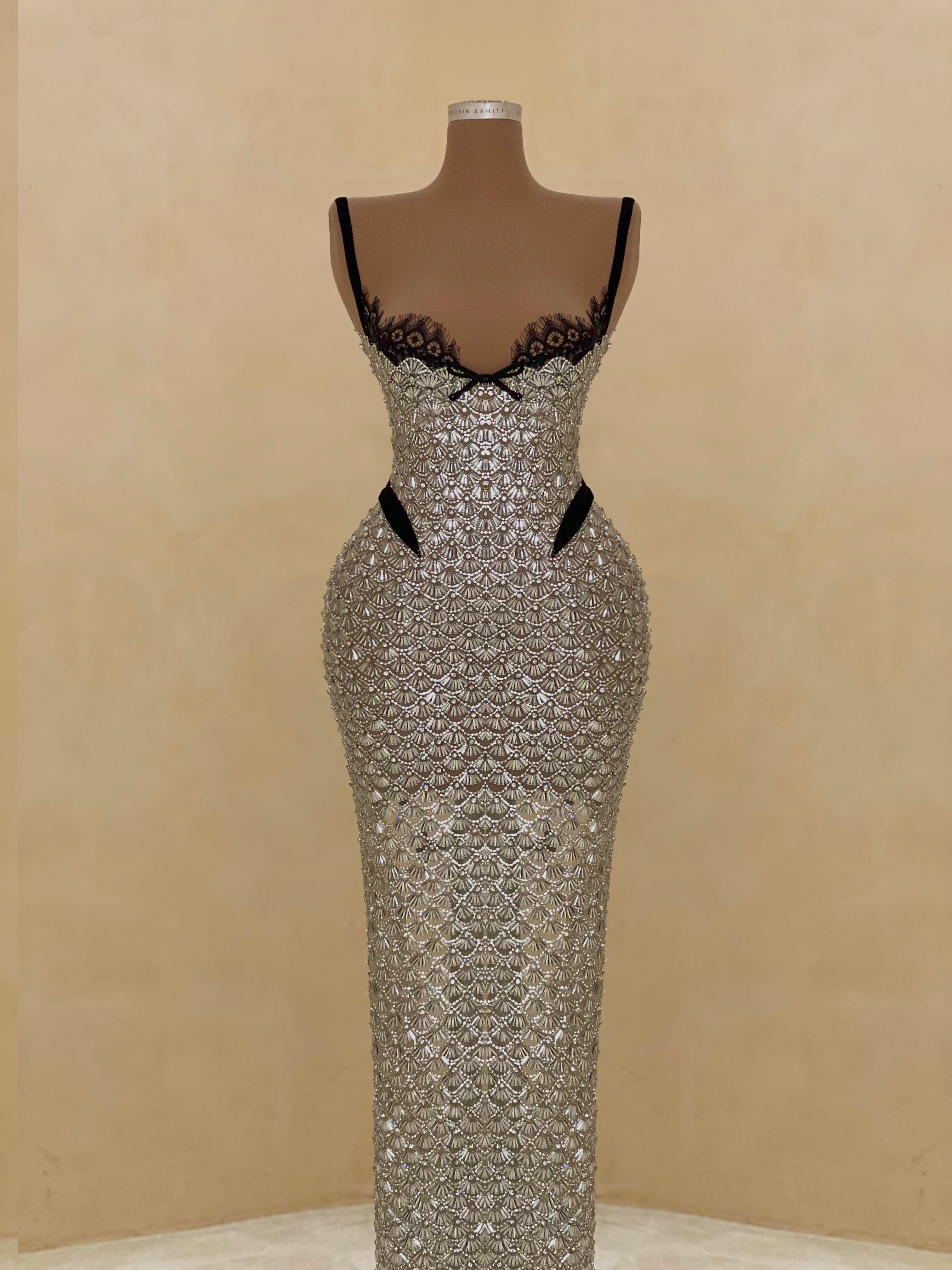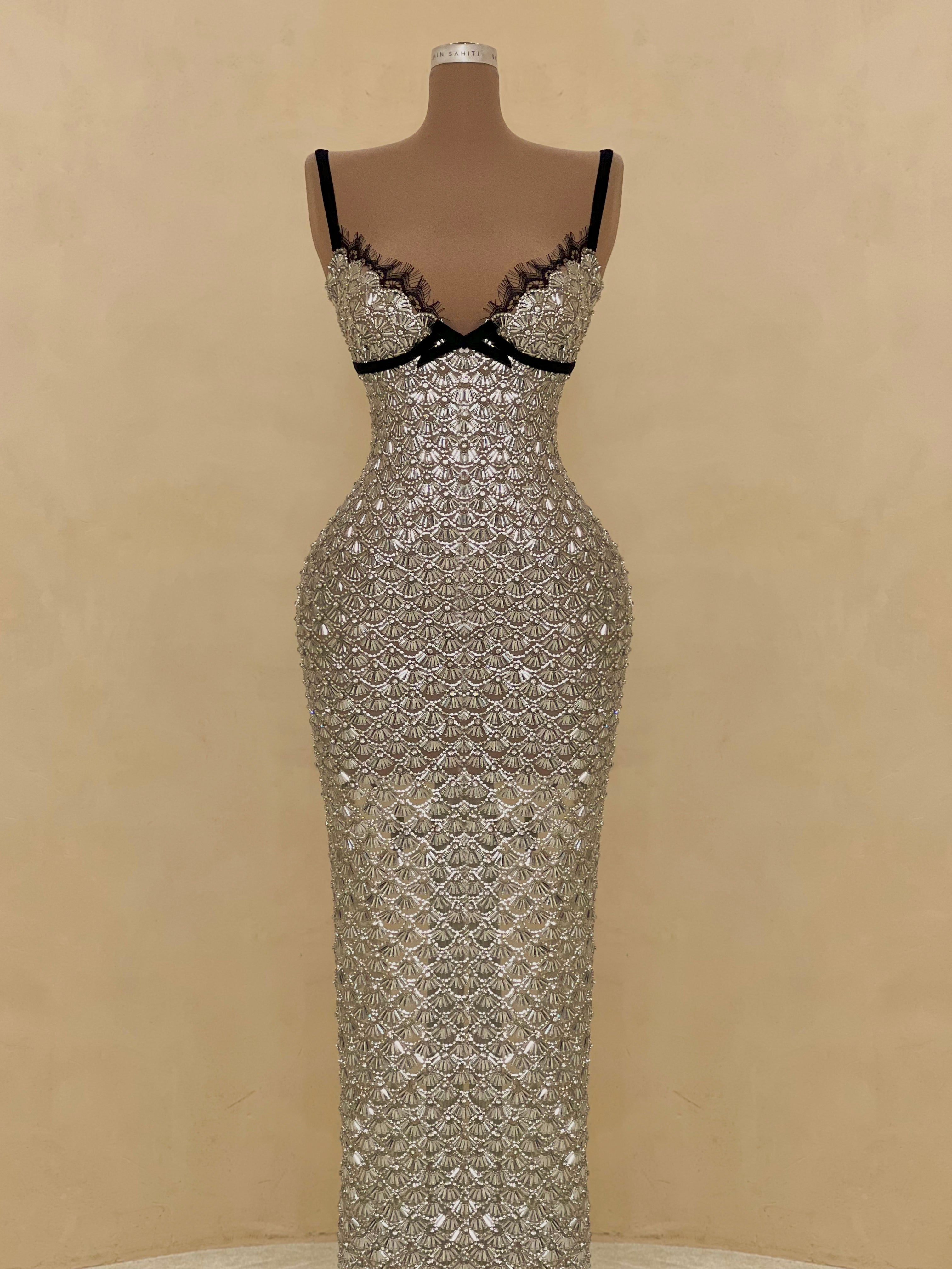 A sleek design with silver crystal embellishments gives this gown a statuesque feel. The intricate beading forms a subtle wave pattern that elongates the silhouette with just the right amount of allure. Best suited for black-tie events, receptions, or luxury fashion evenings.