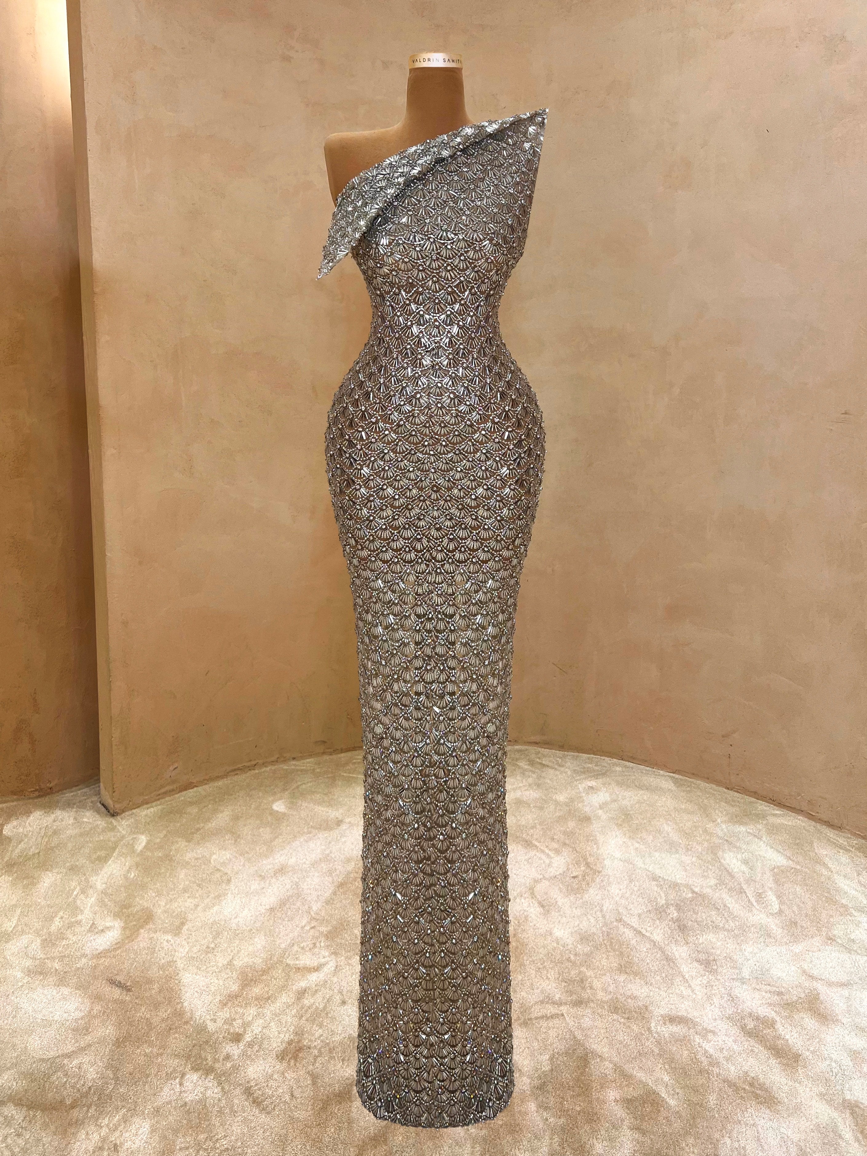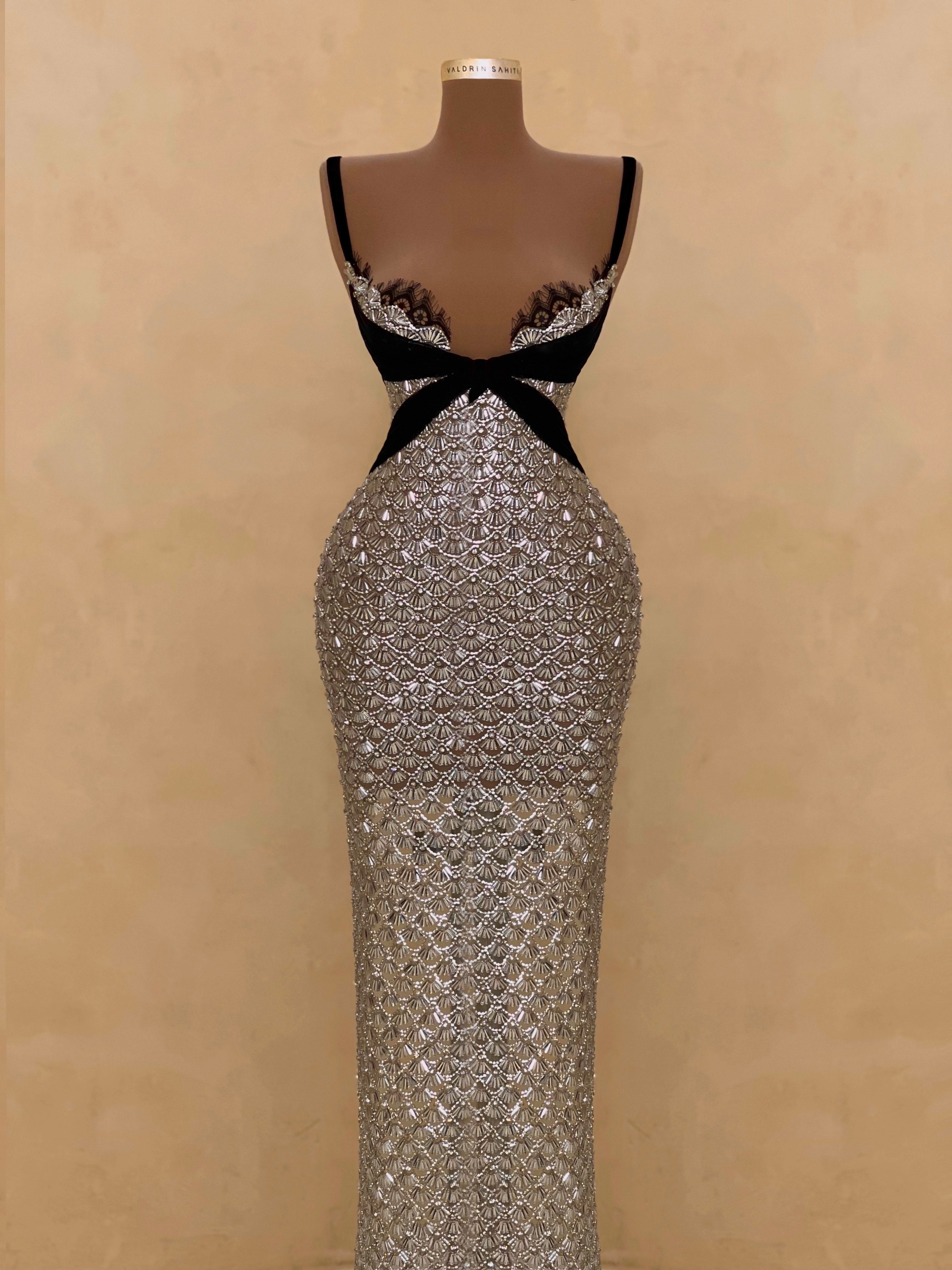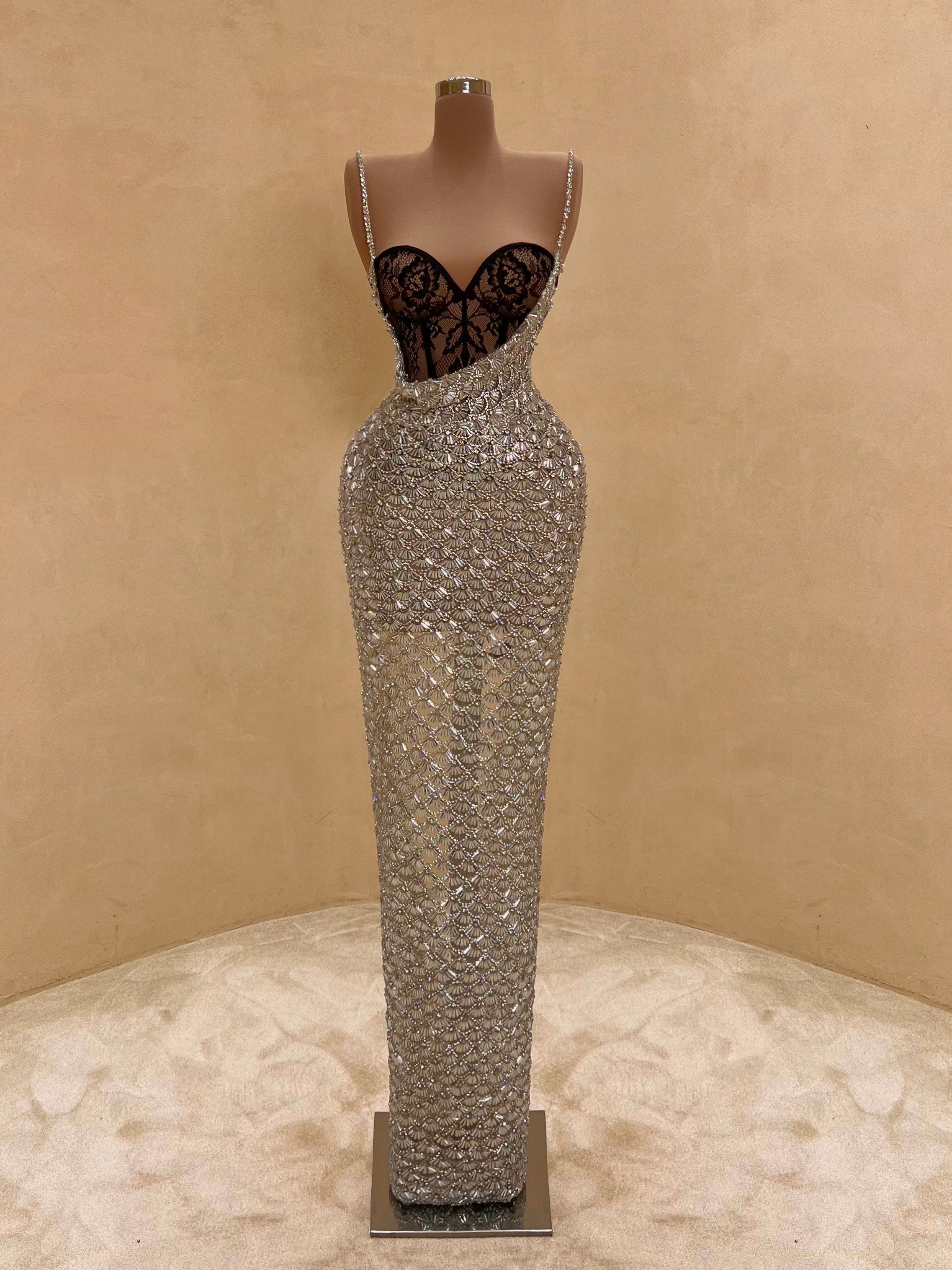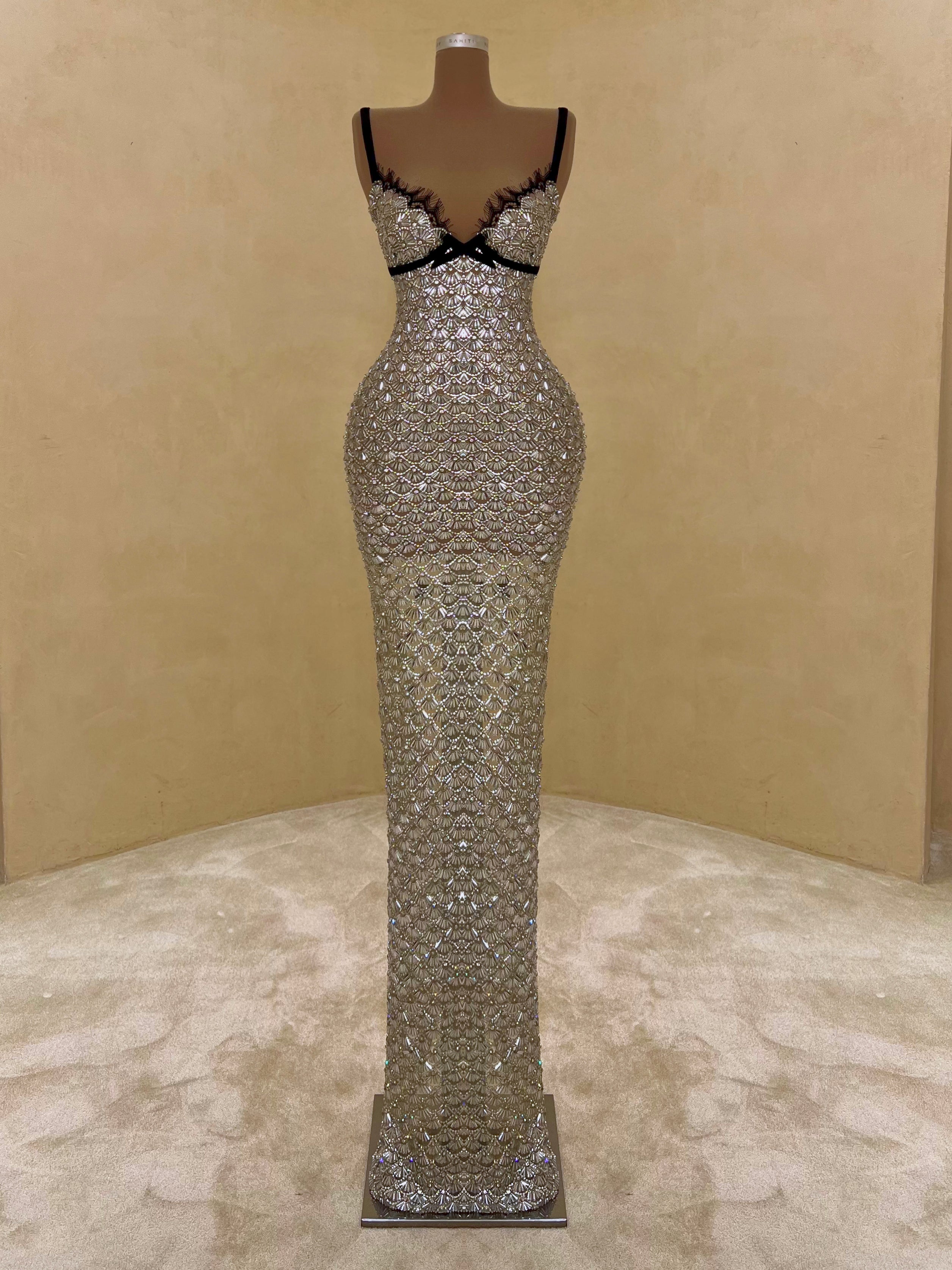 A sleek design with silver crystal embellishments gives this gown a statuesque feel. The intricate beading forms a subtle wave pattern that elongates the silhouette with just the right amount of allure. Best suited for black-tie events, receptions, or luxury fashion evenings.