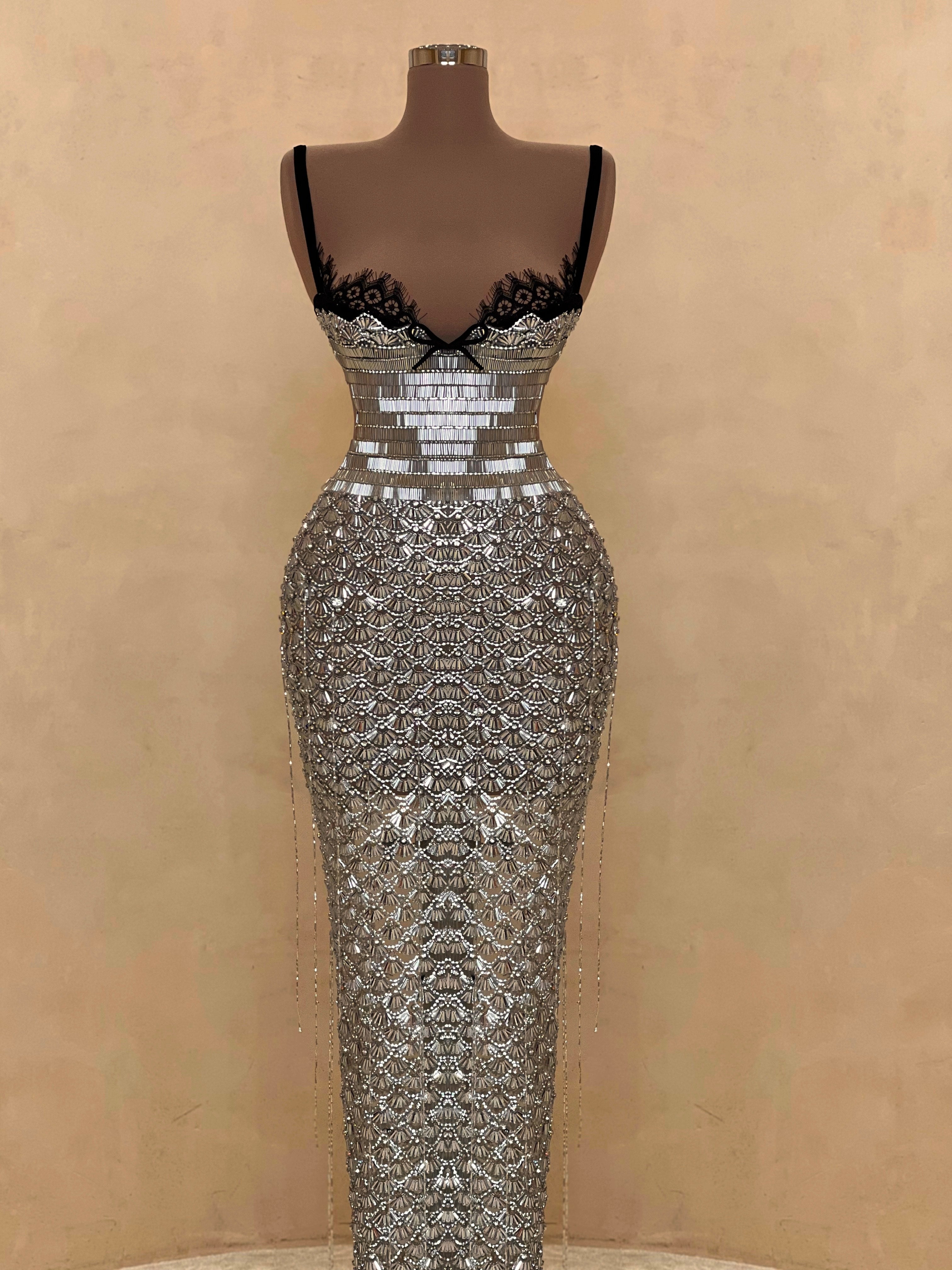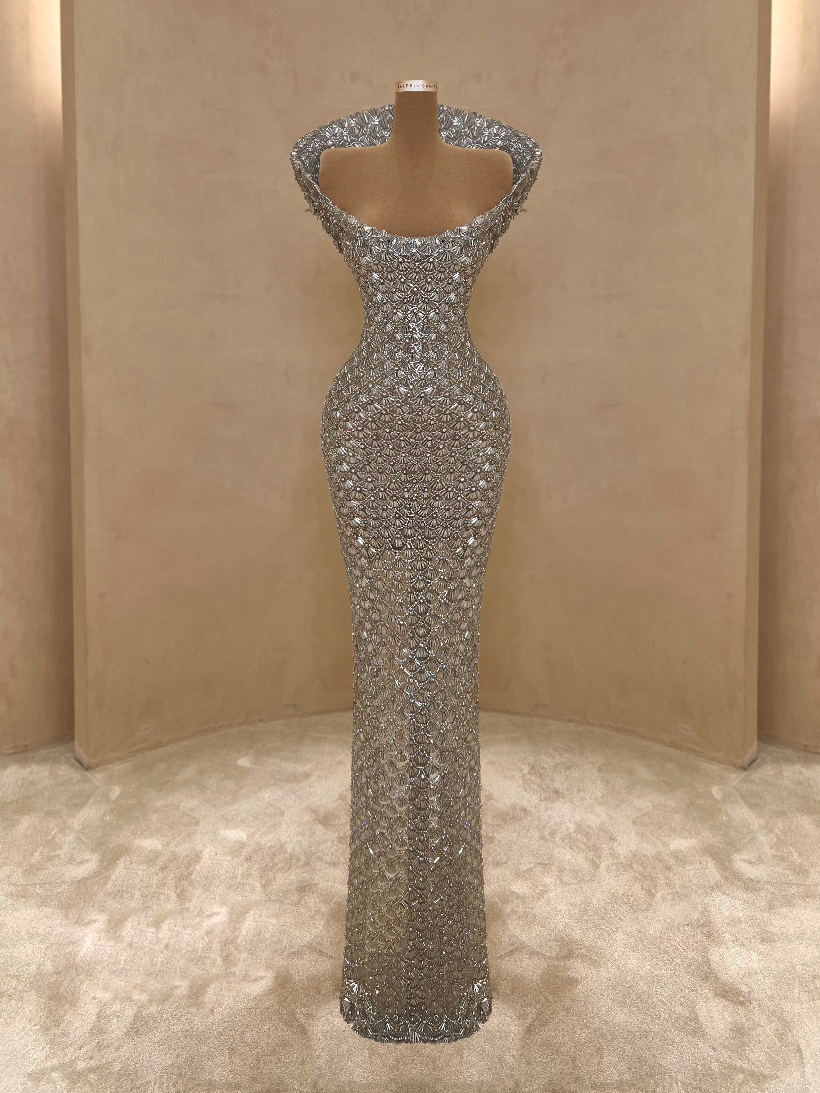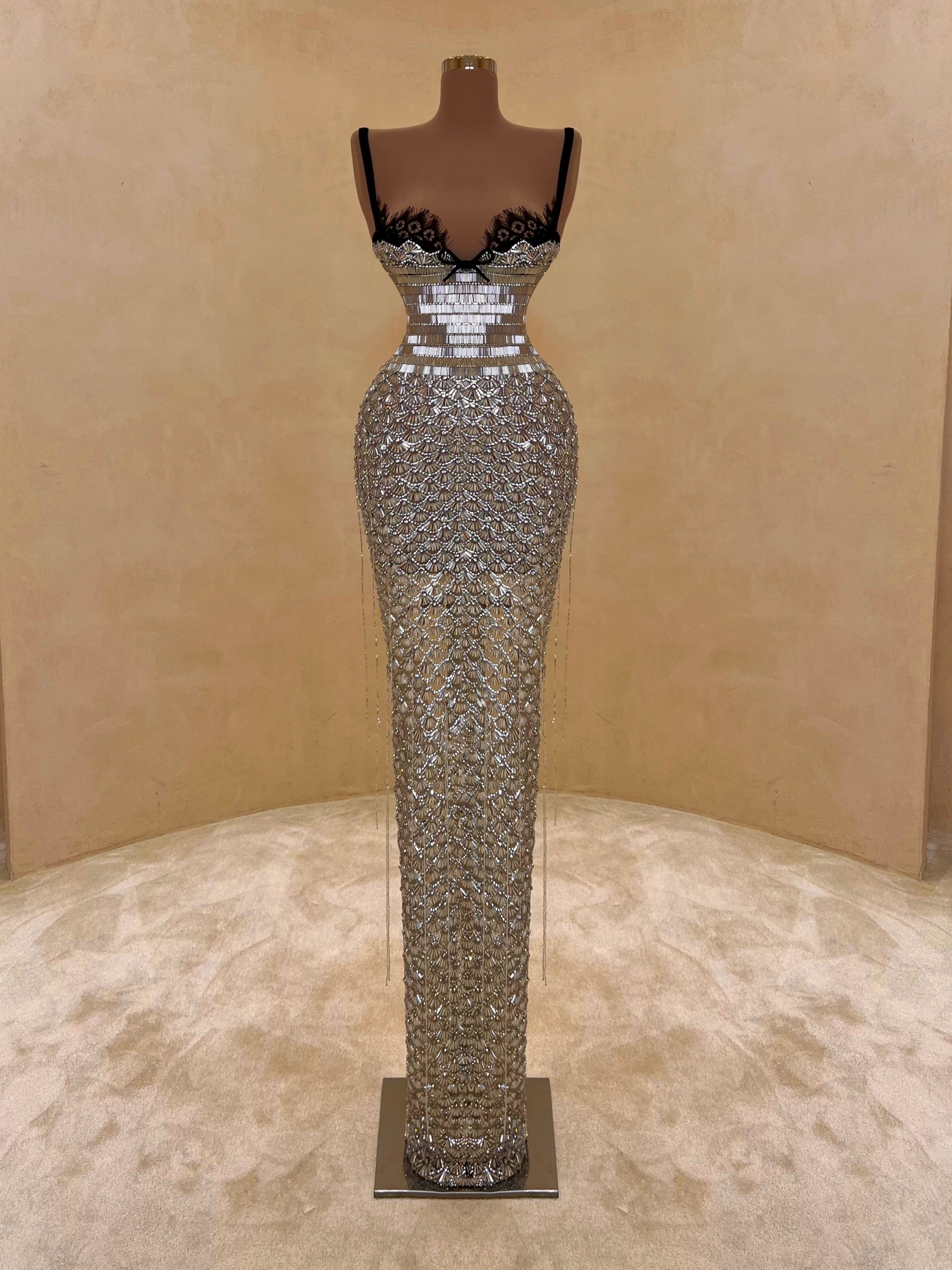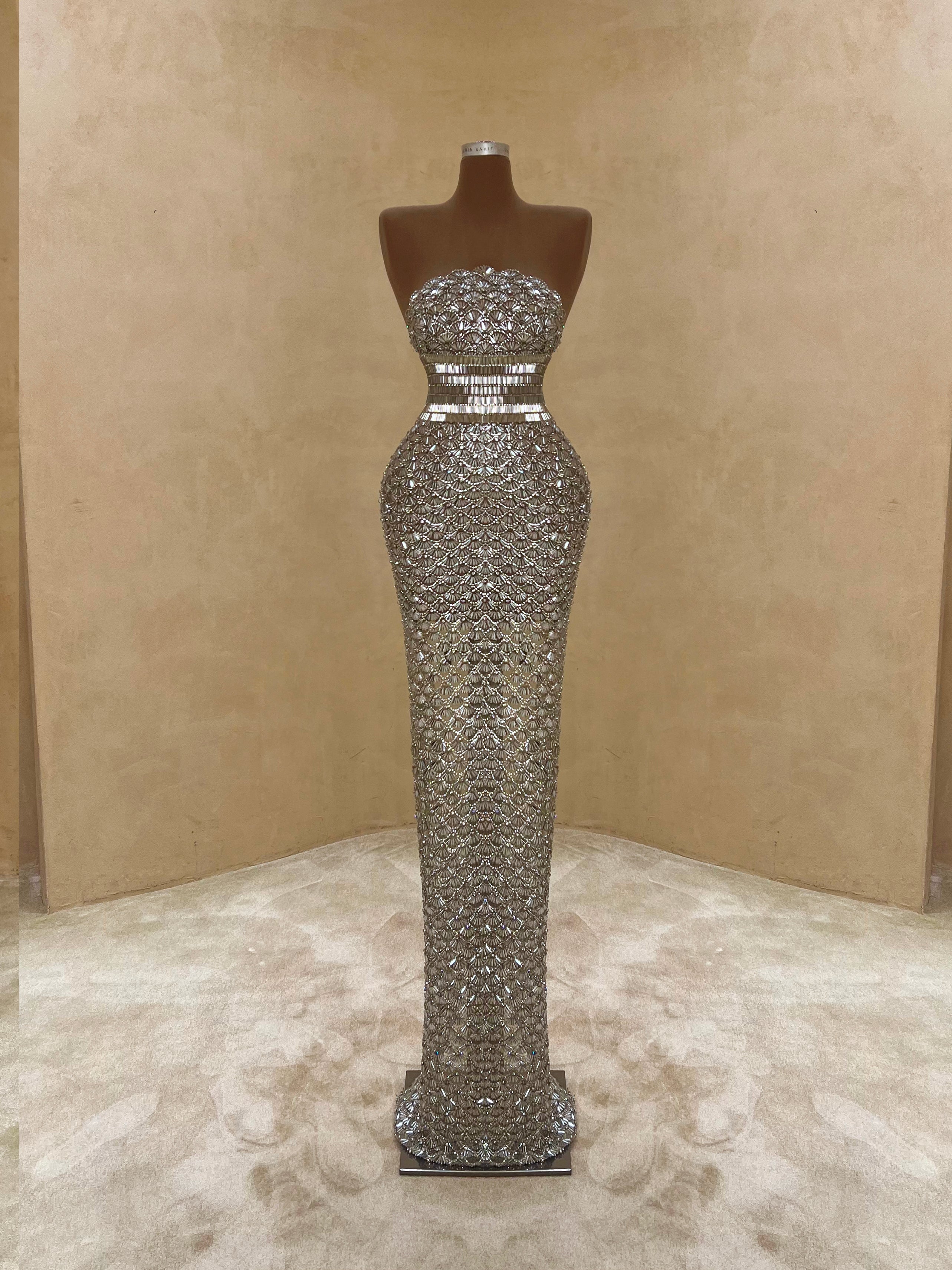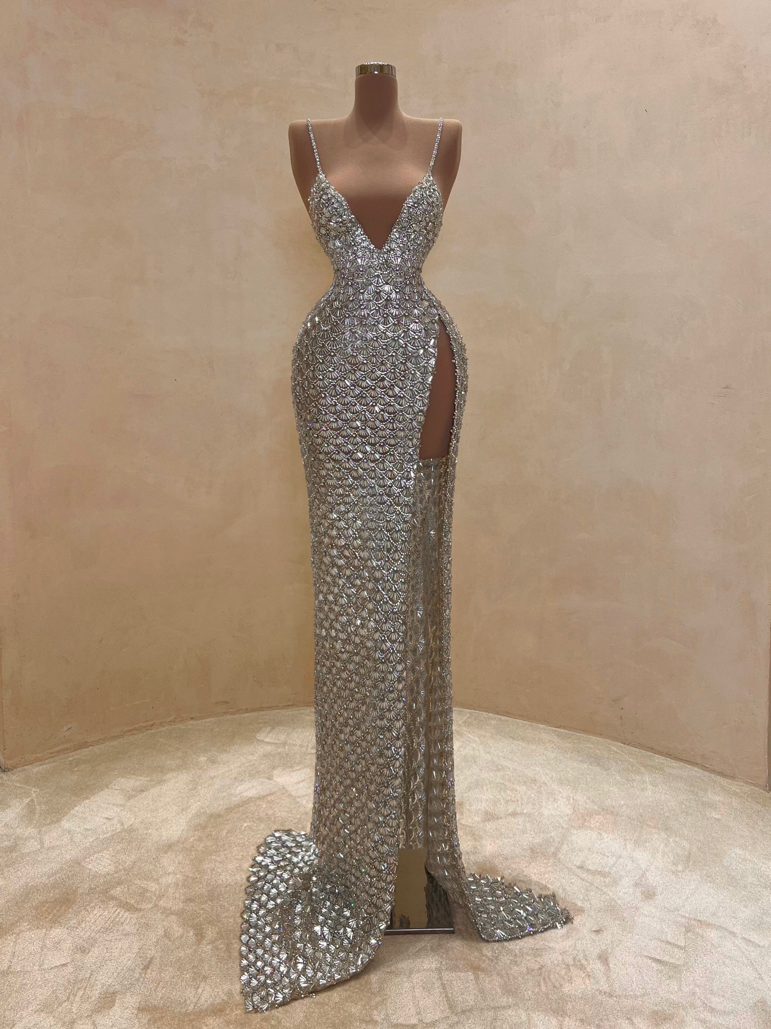 A sleek design with silver crystal embellishments gives this gown a statuesque feel. The intricate beading forms a subtle wave pattern that elongates the silhouette with just the right amount of allure. Best suited for black-tie events, receptions, or luxury fashion evenings.