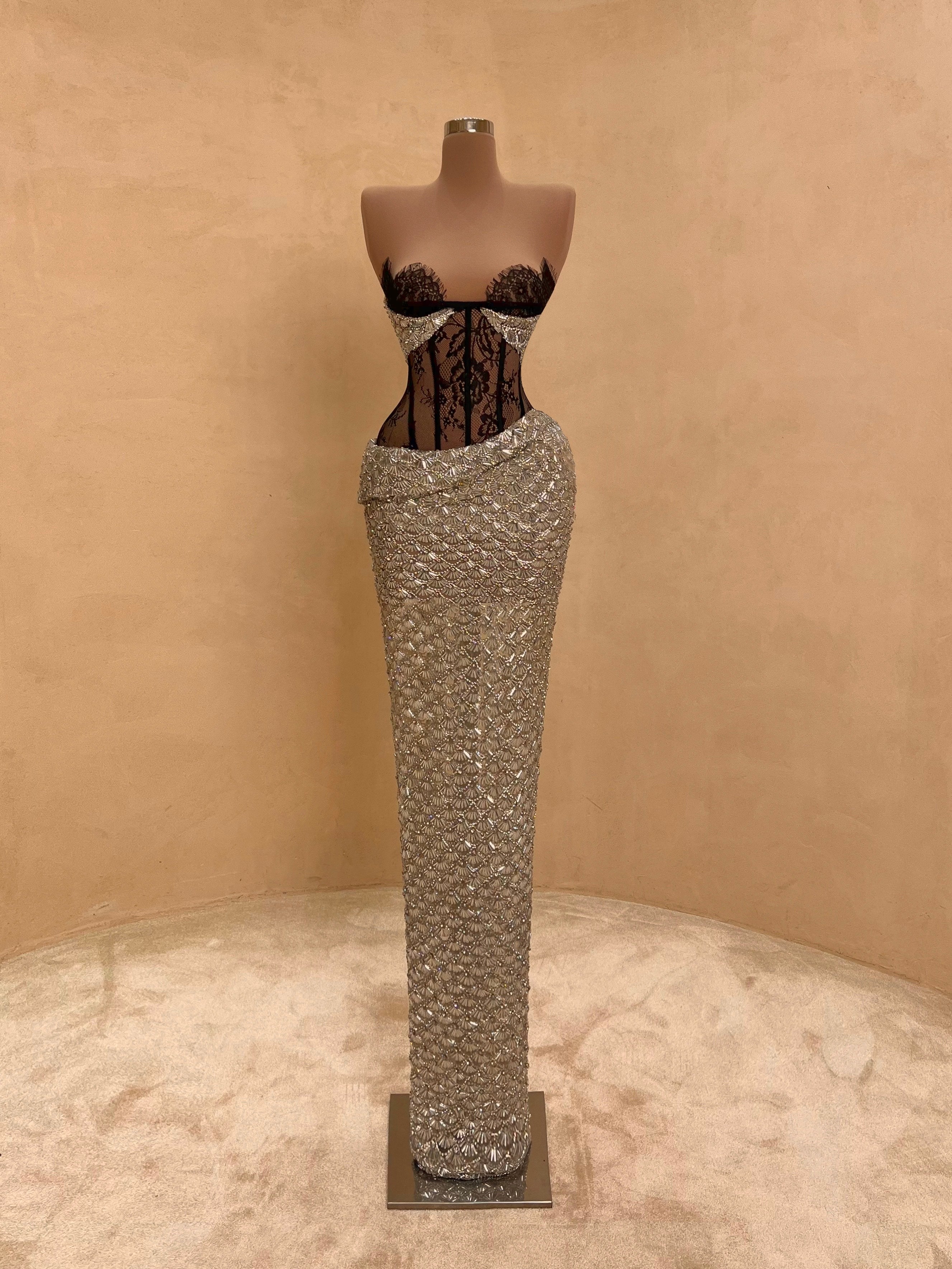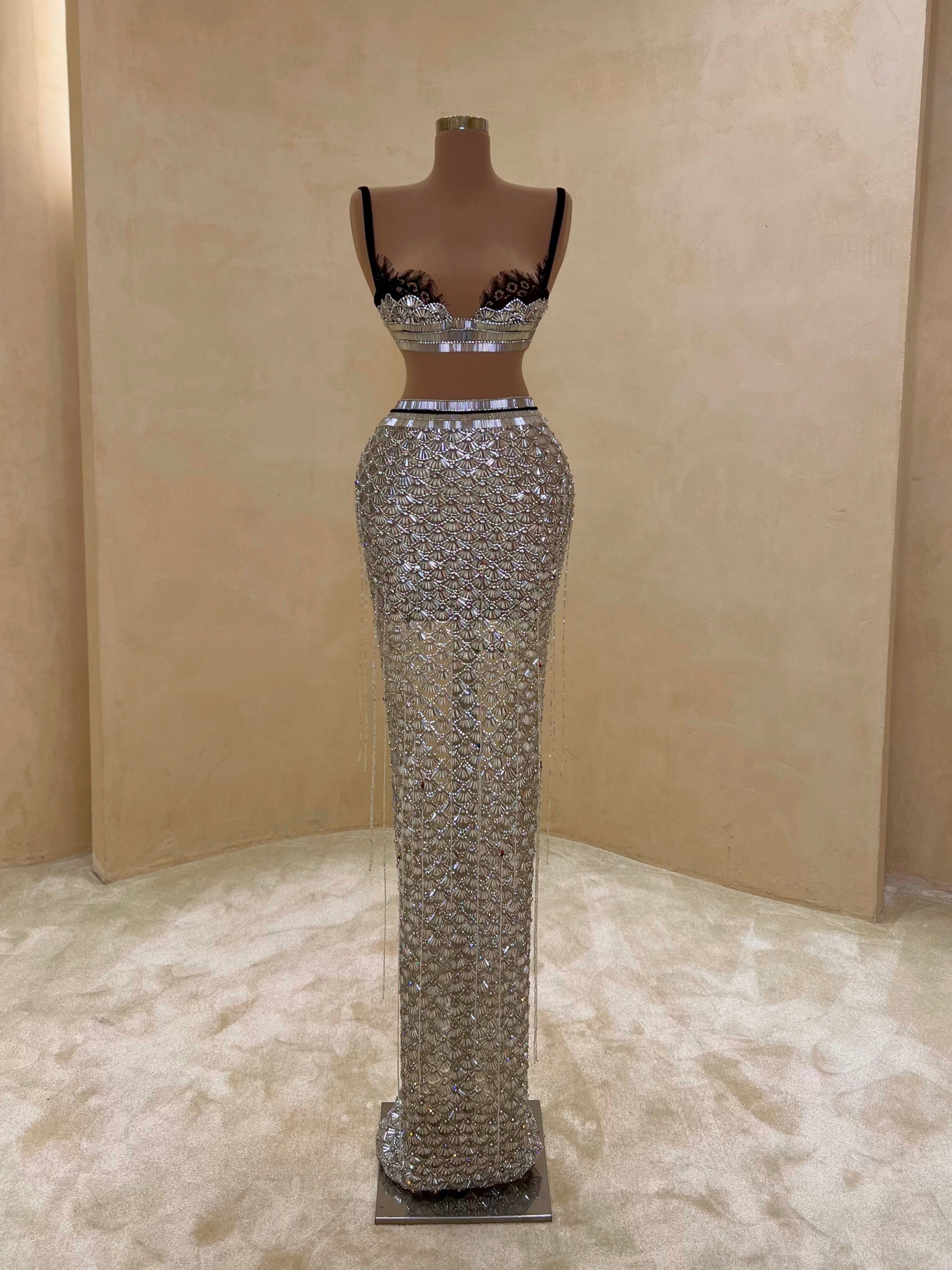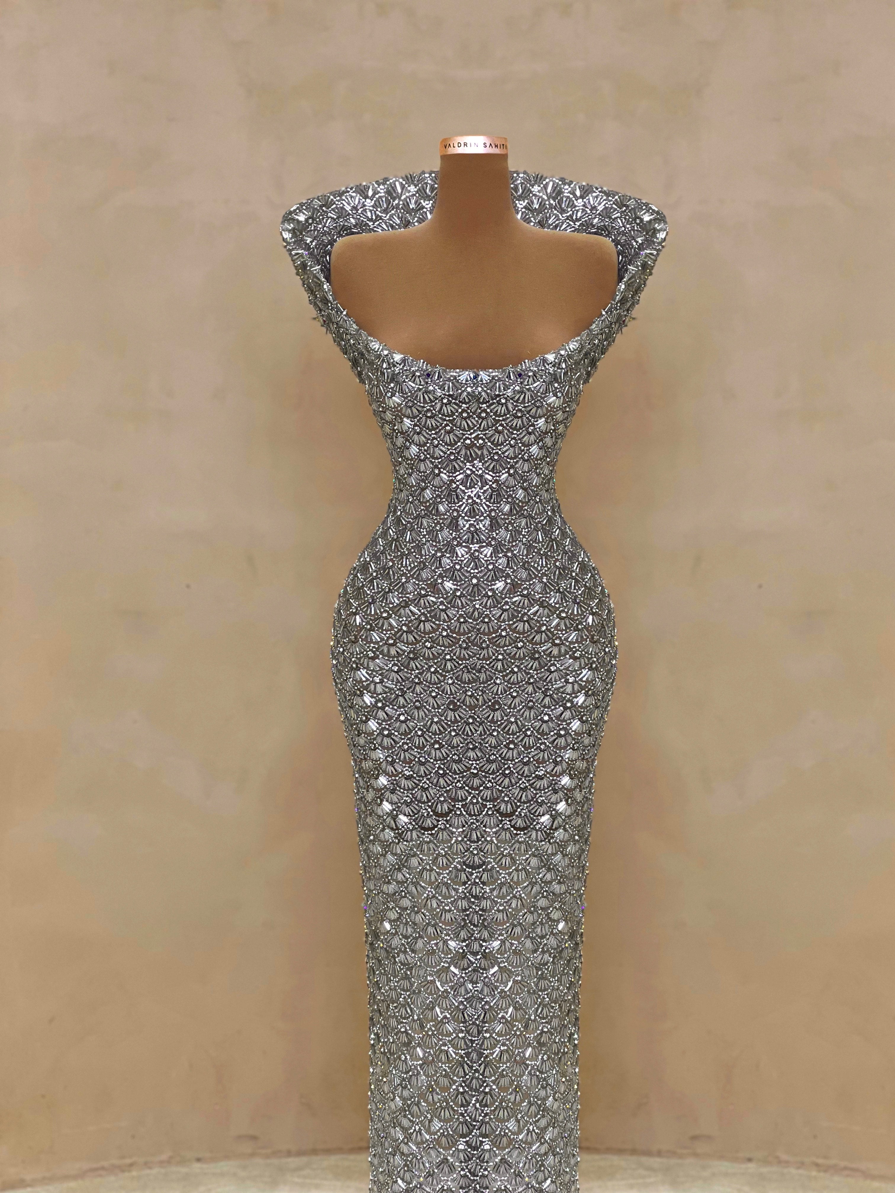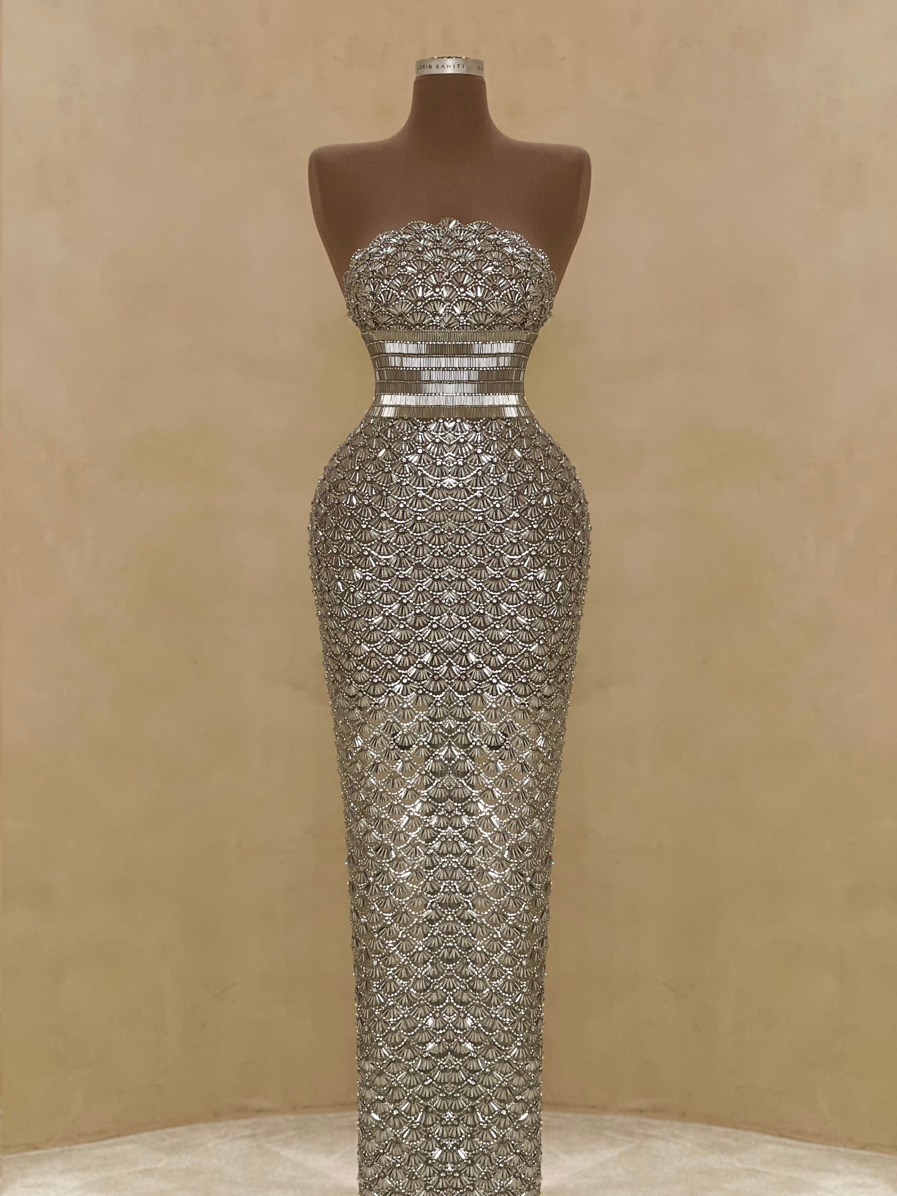 A sleek design with silver crystal embellishments gives this gown a statuesque feel. The intricate beading forms a subtle wave pattern that elongates the silhouette with just the right amount of allure. Best suited for black-tie events, receptions, or luxury fashion evenings.