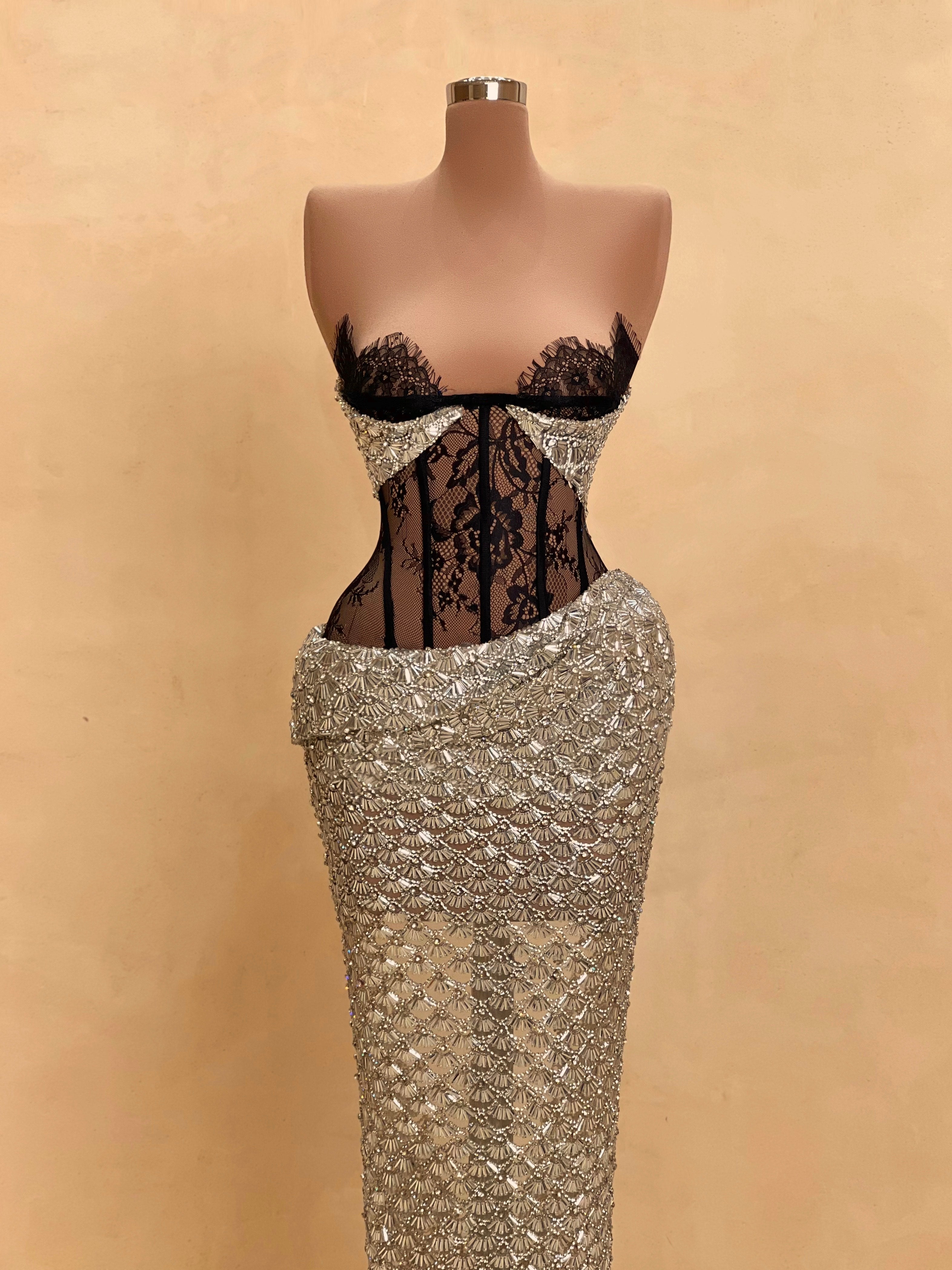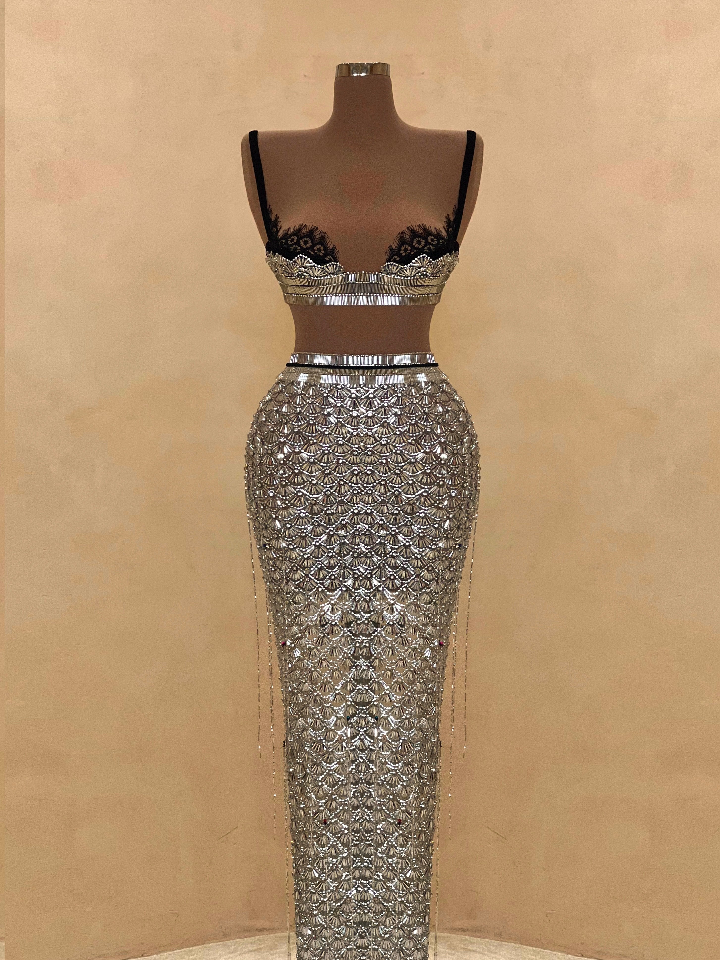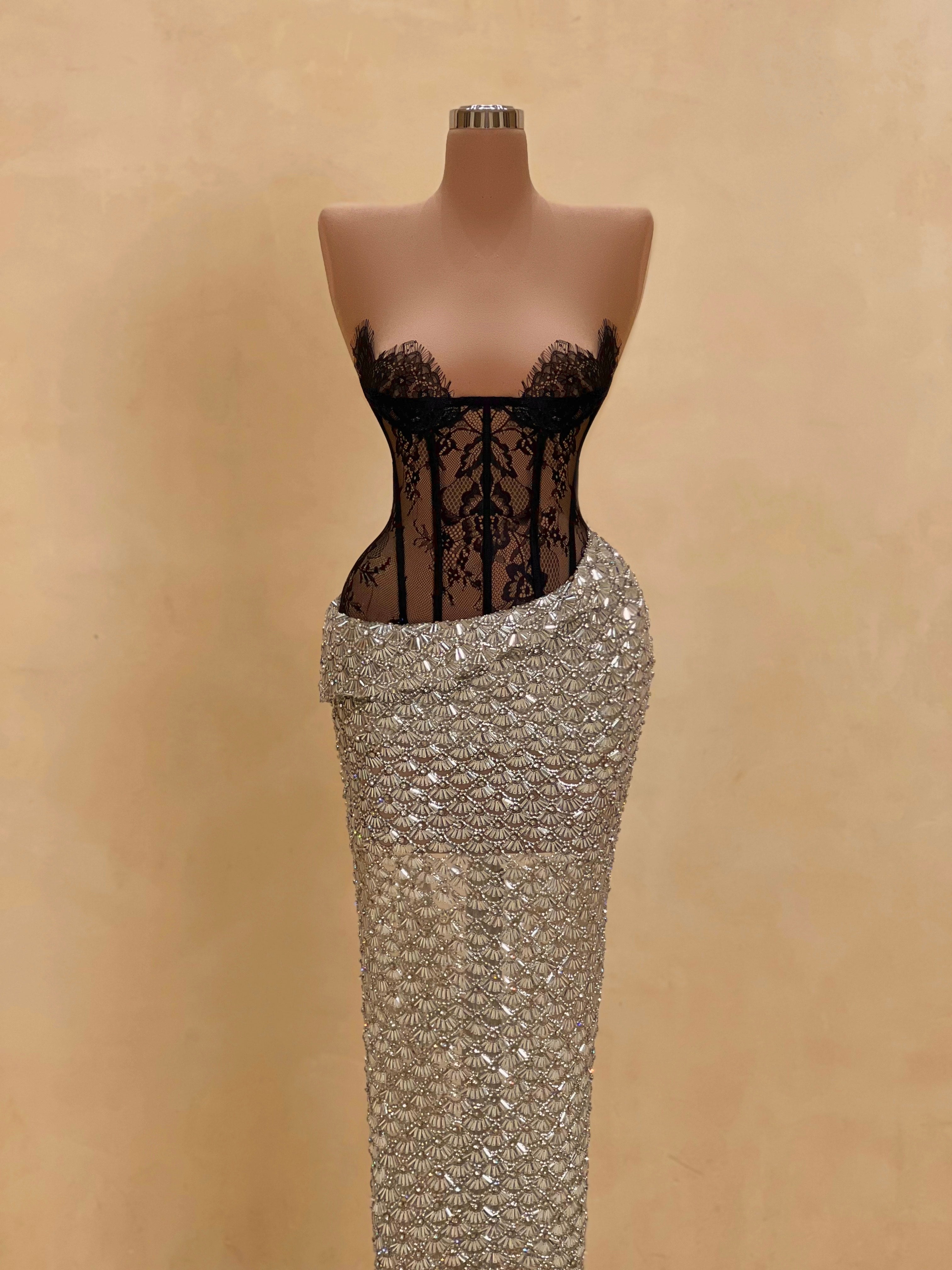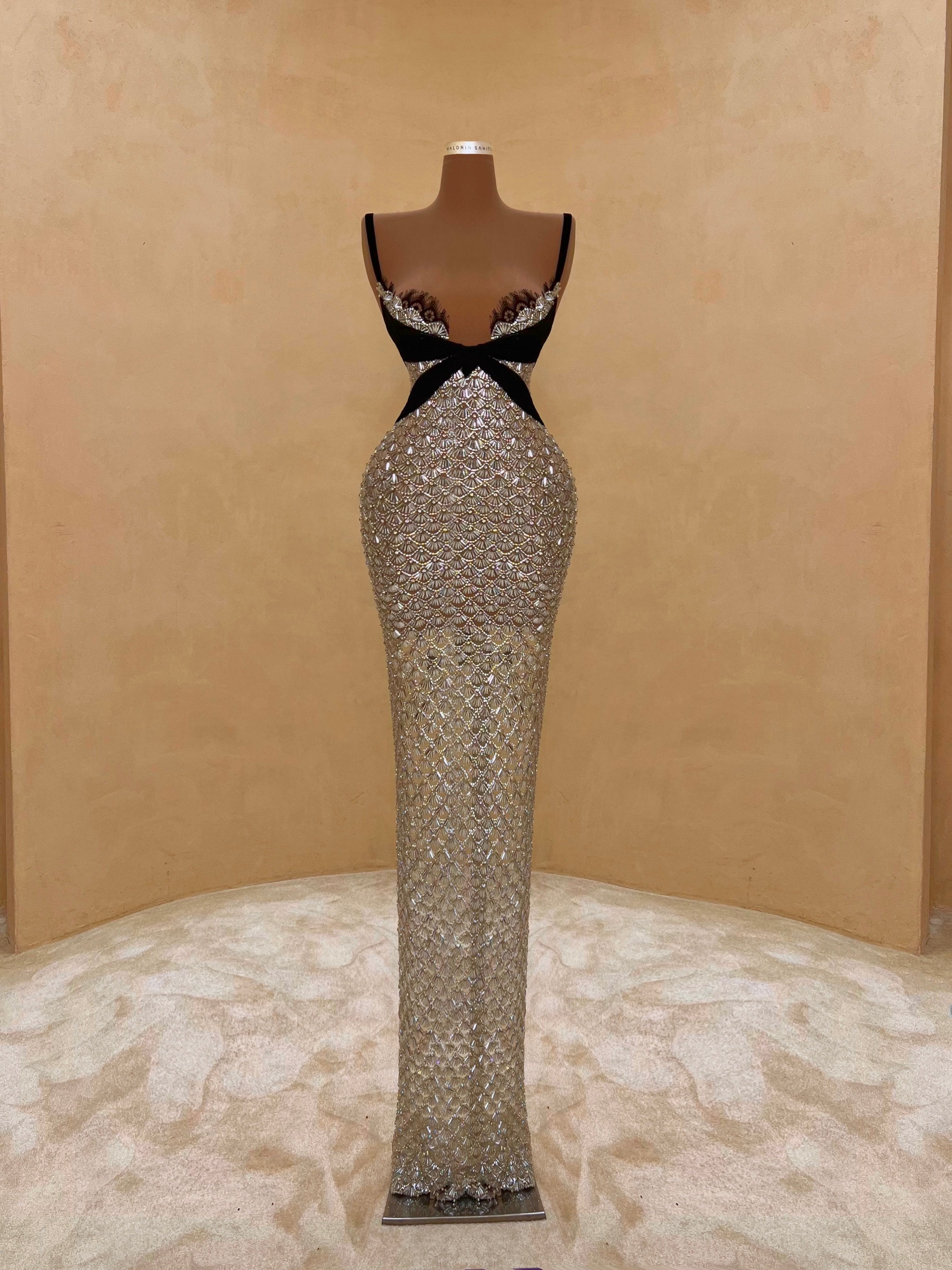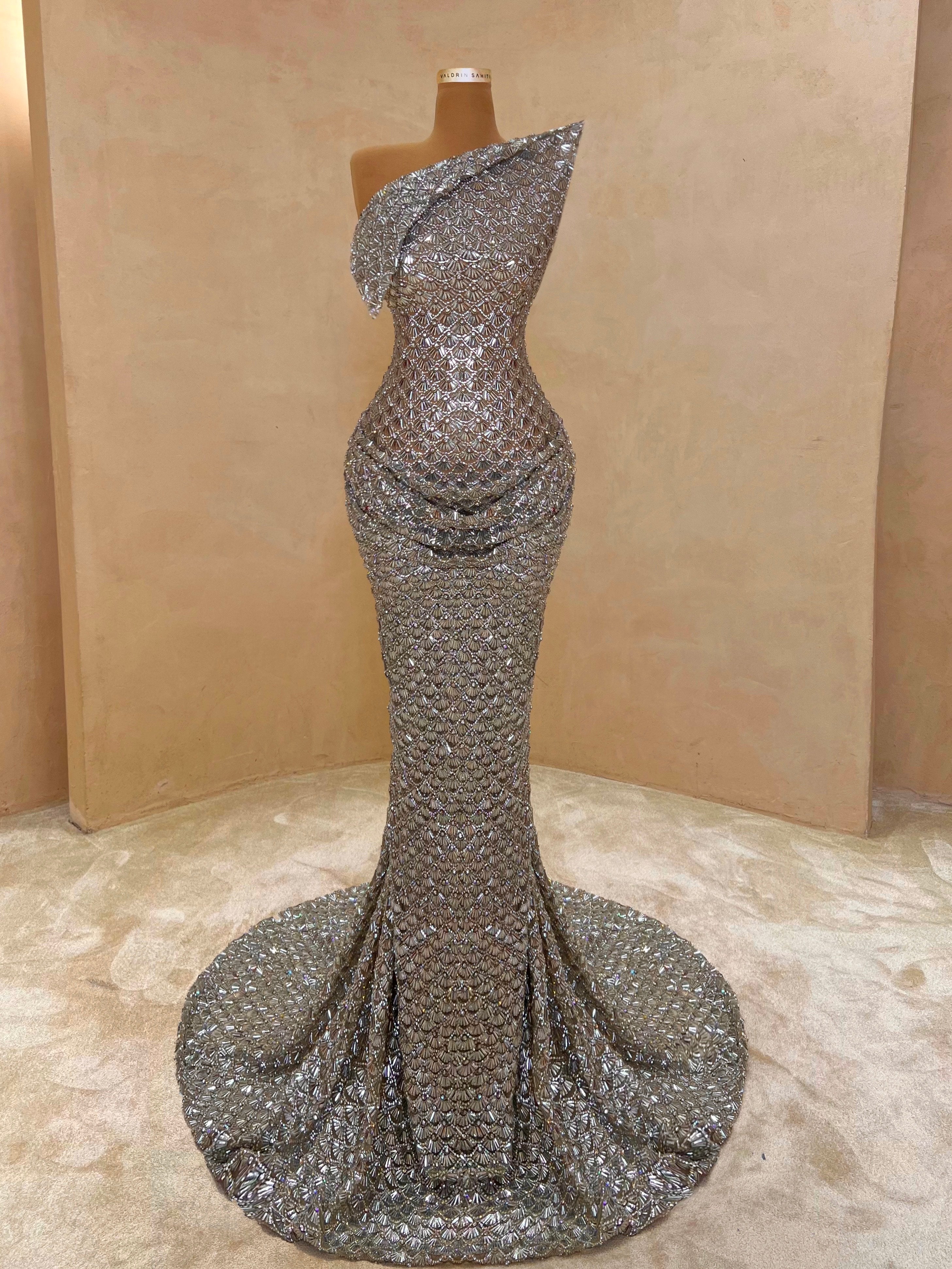 A sleek design with silver crystal embellishments gives this gown a statuesque feel. The intricate beading forms a subtle wave pattern that elongates the silhouette with just the right amount of allure. Best suited for black-tie events, receptions, or luxury fashion evenings.