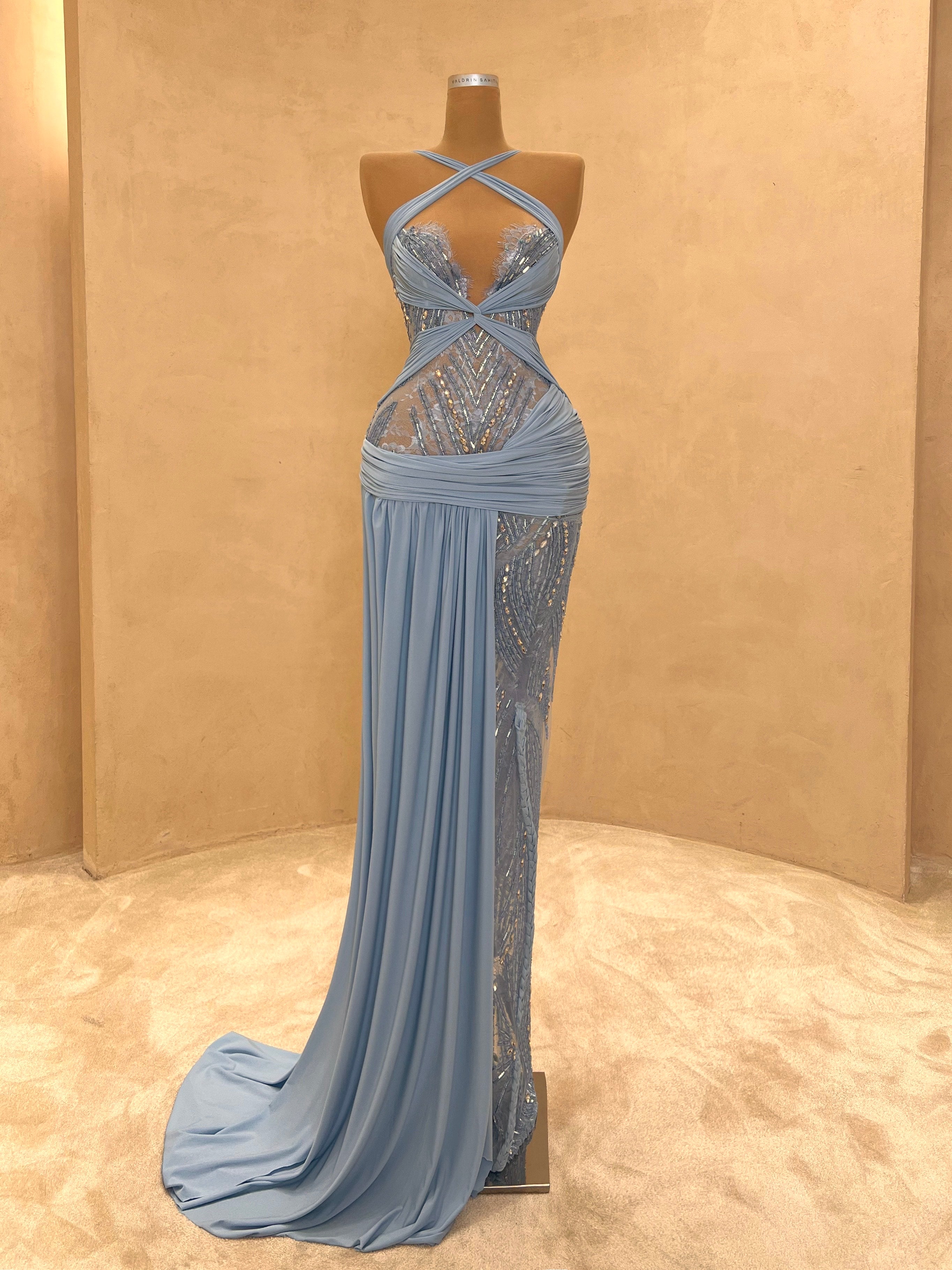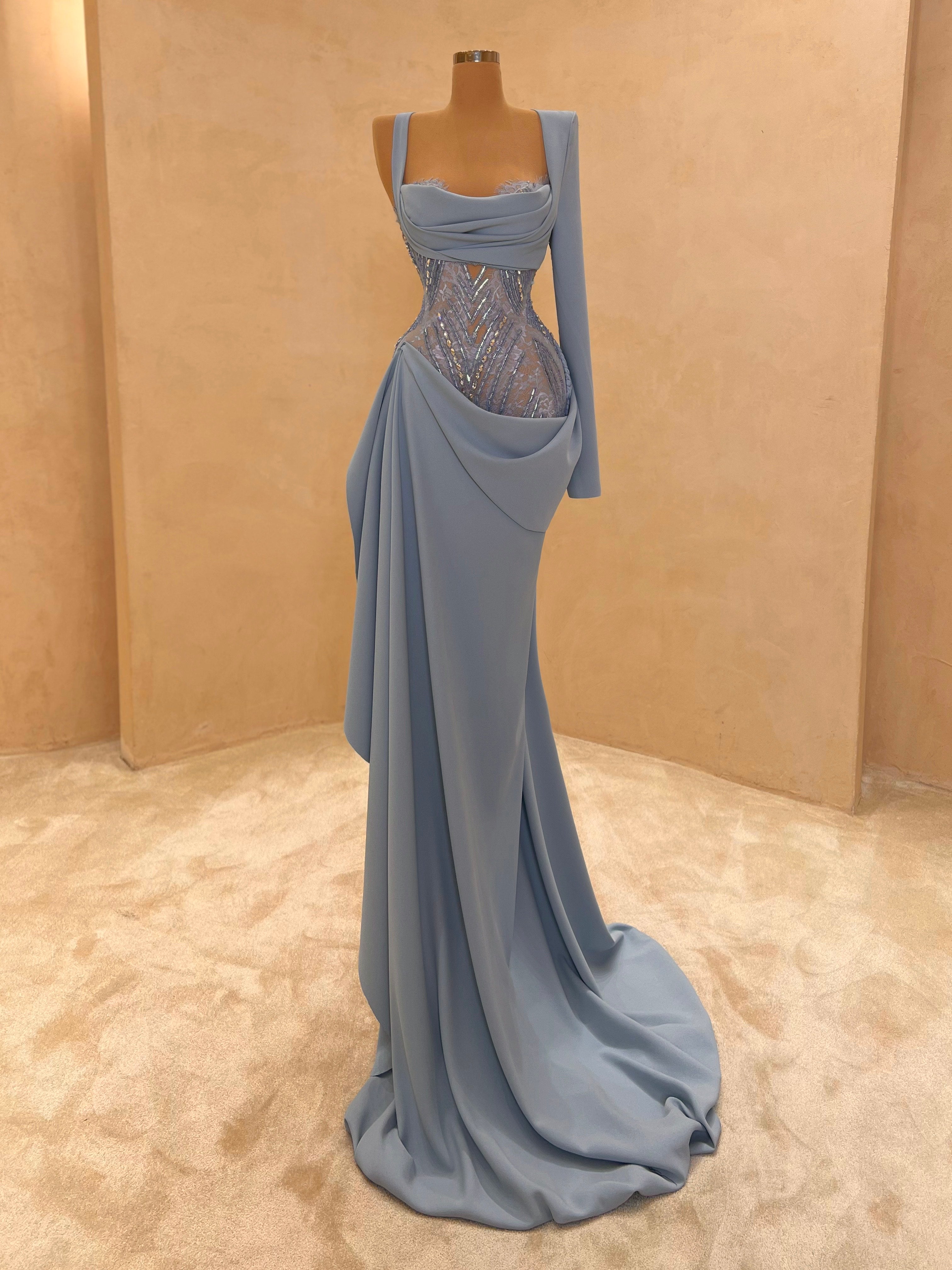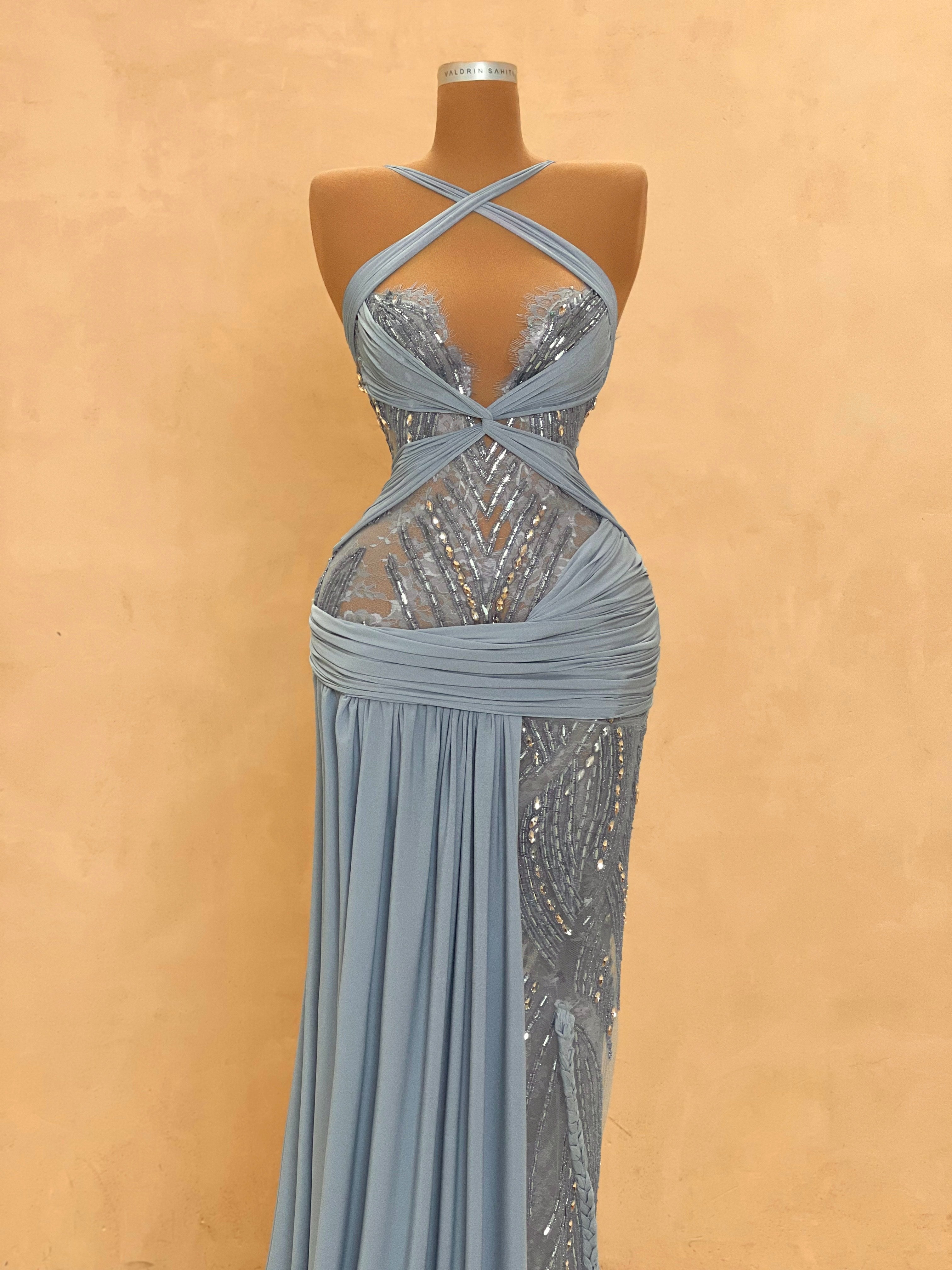 Graceful and modern, this pastel blue evening dress is defined by its asymmetric draping and crystal mesh side cutout. The structured bust and soft, flowing fabric bring balance between elegance and seduction. Ideal for destination weddings, upscale soirées, or red carpet entrances.