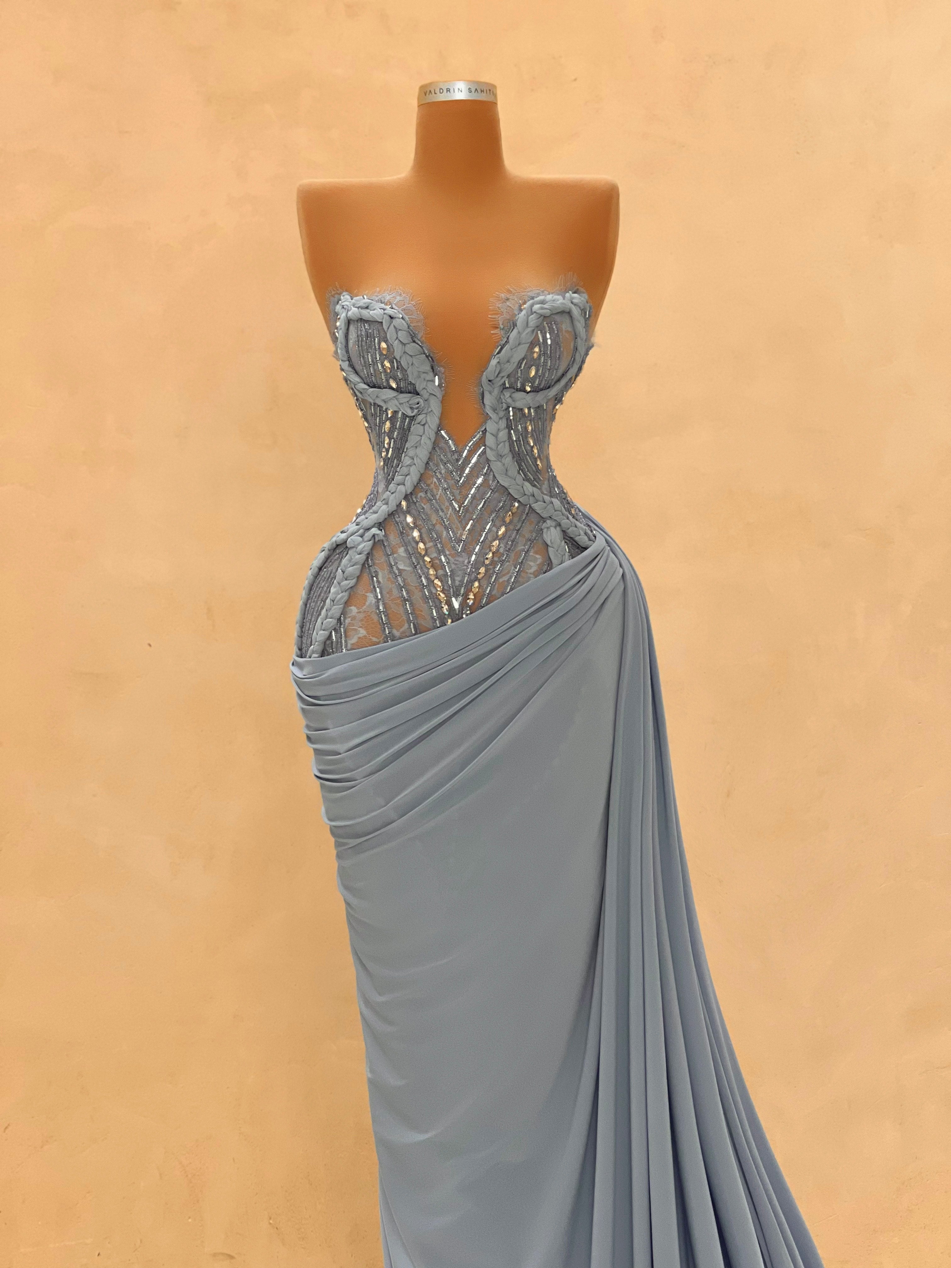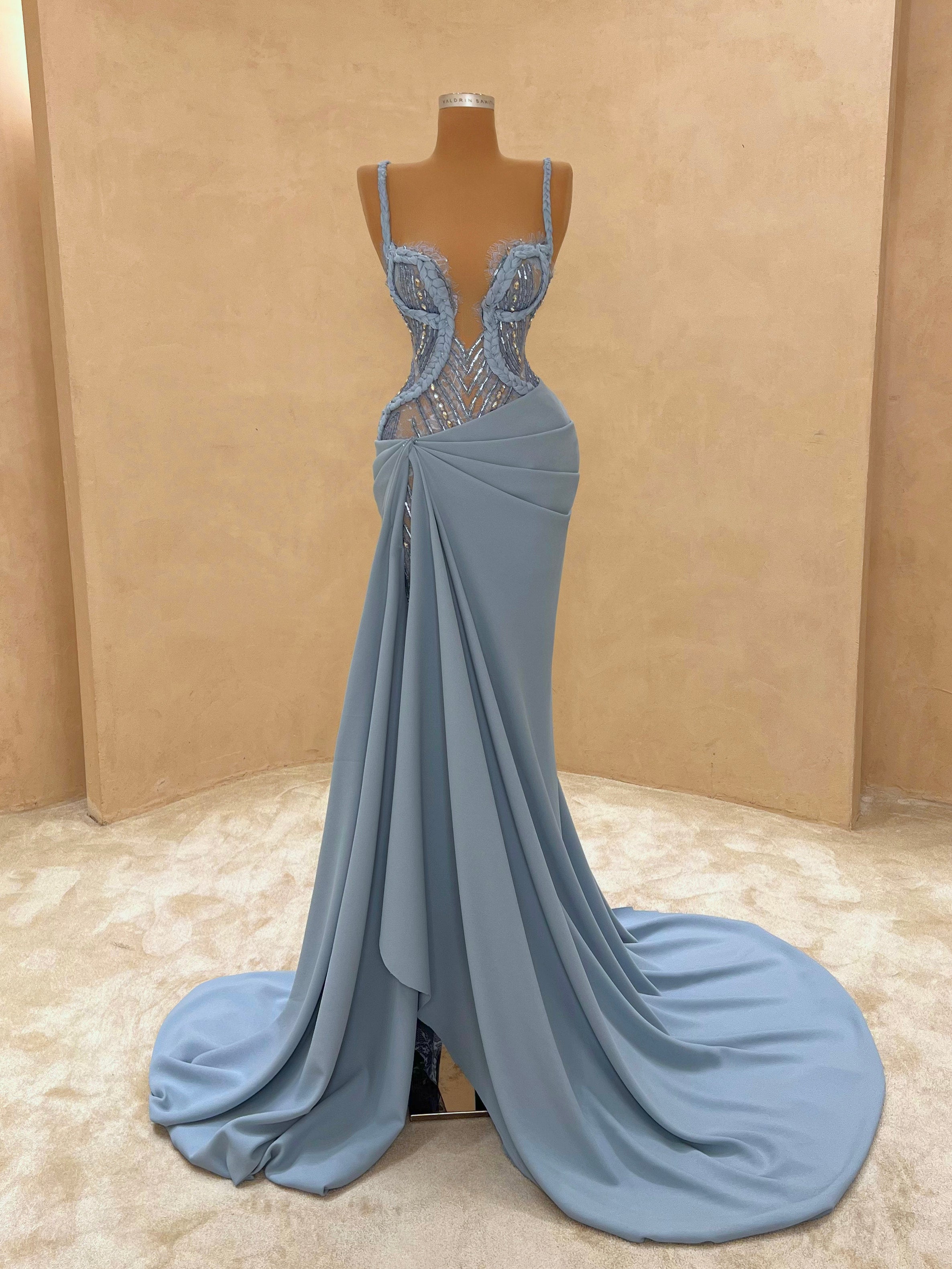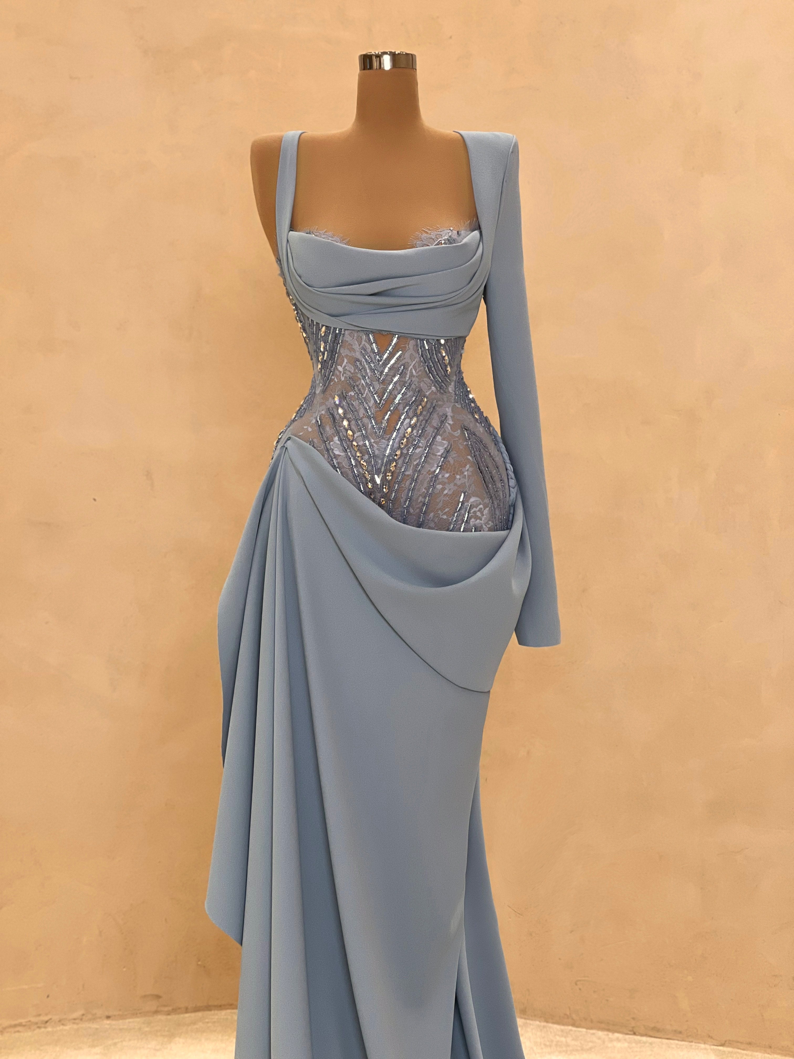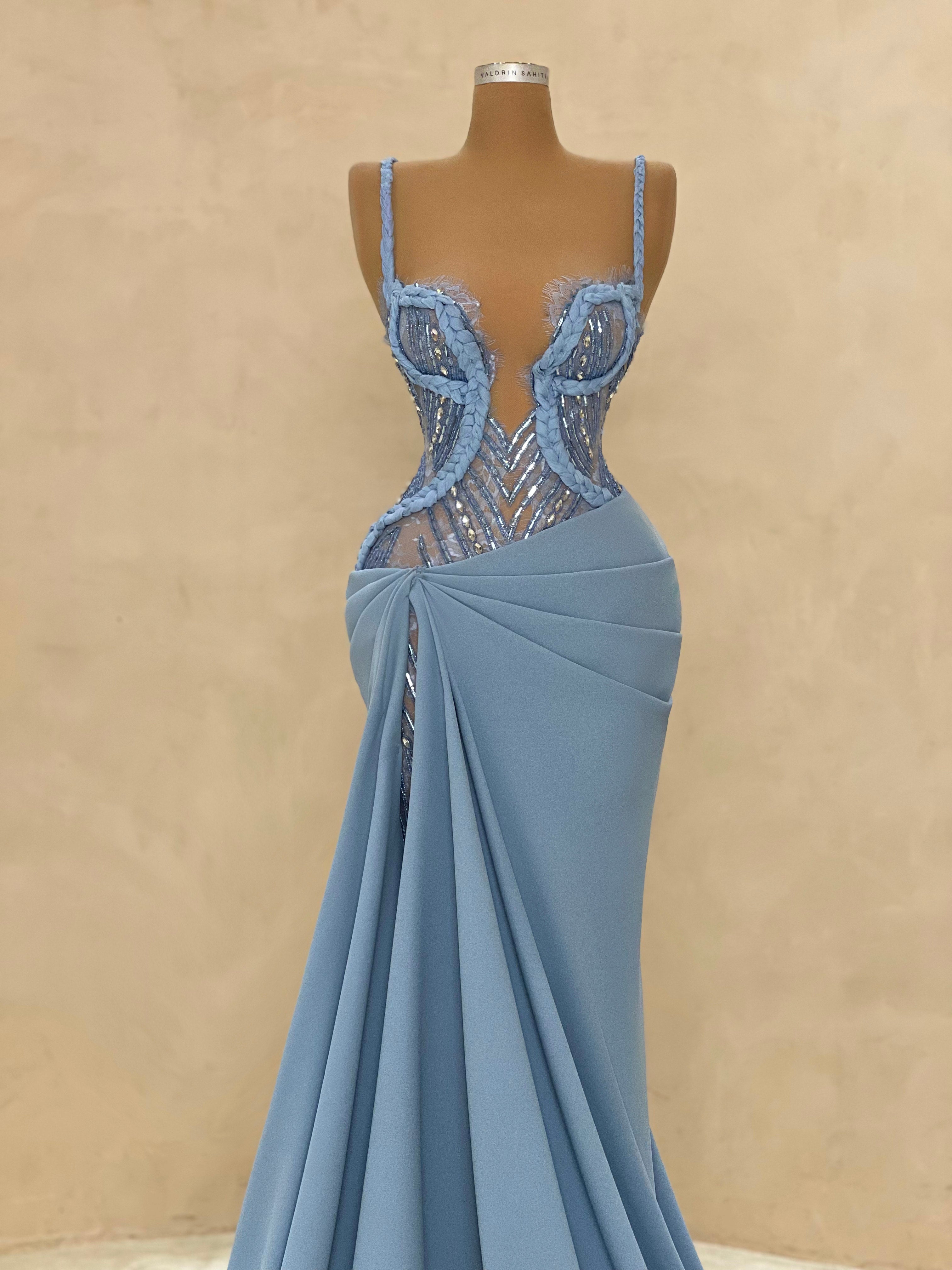 Graceful and modern, this pastel blue evening dress is defined by its asymmetric draping and crystal mesh side cutout. The structured bust and soft, flowing fabric bring balance between elegance and seduction. Ideal for destination weddings, upscale soirées, or red carpet entrances.