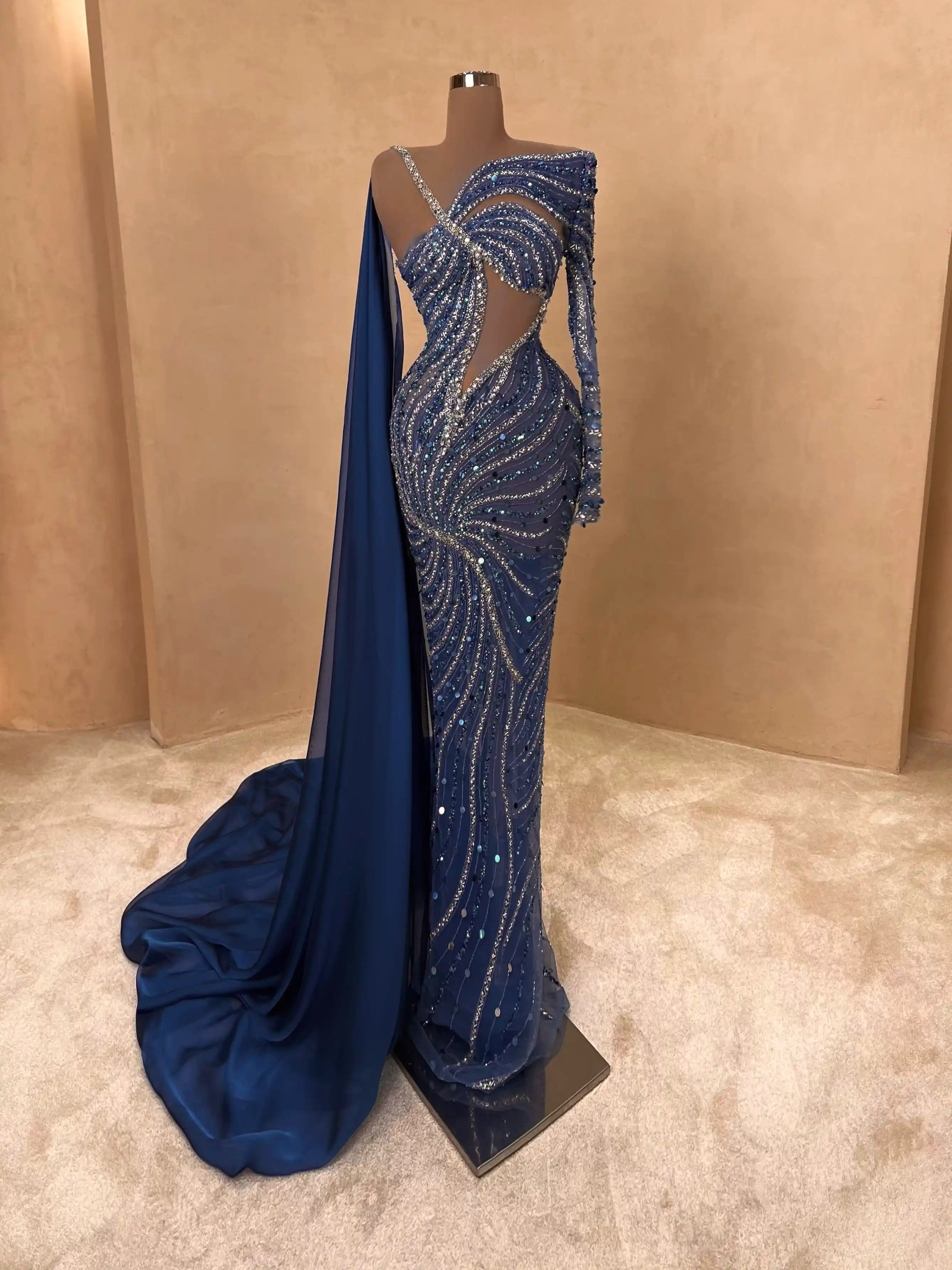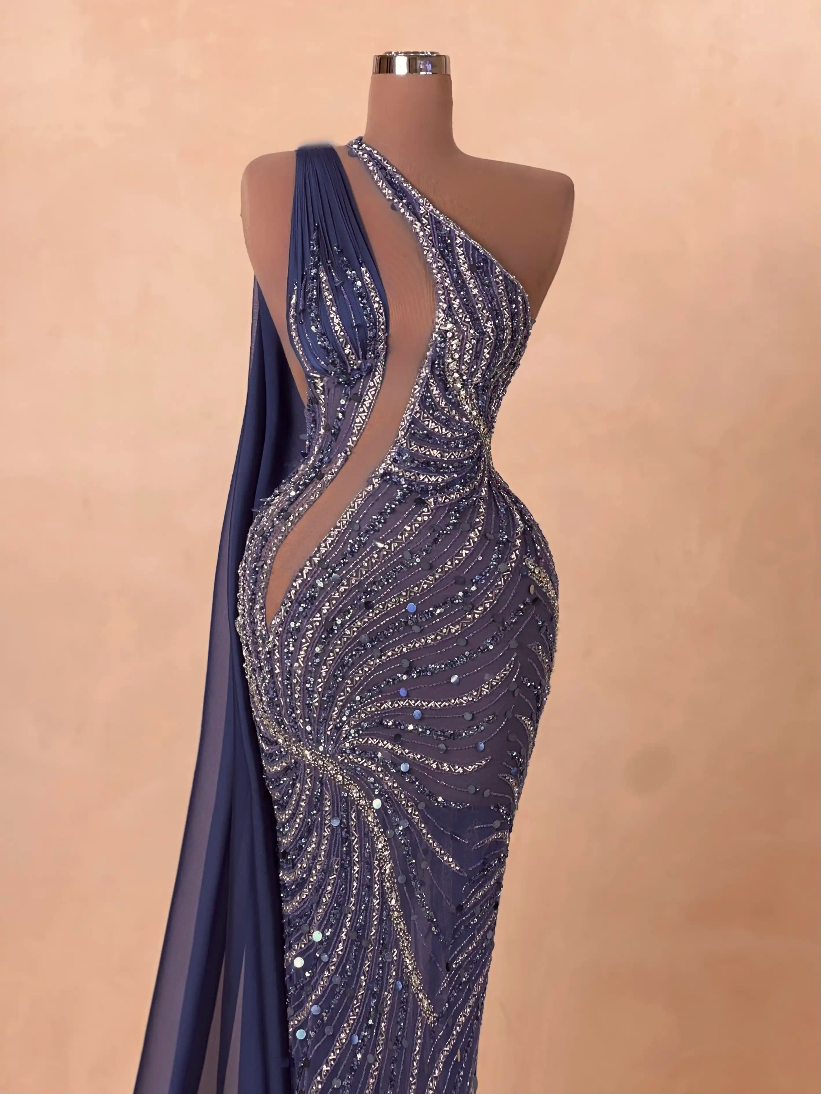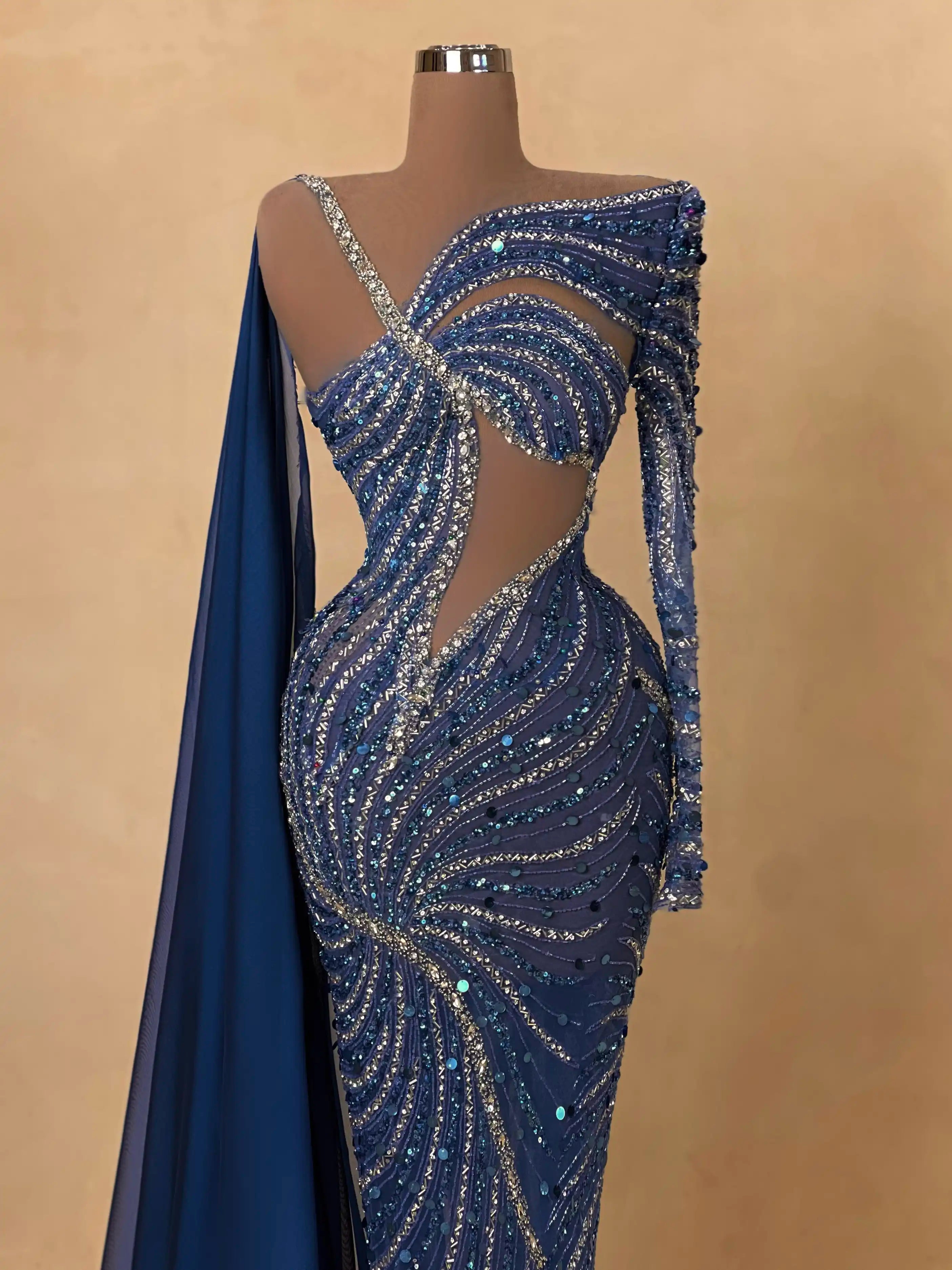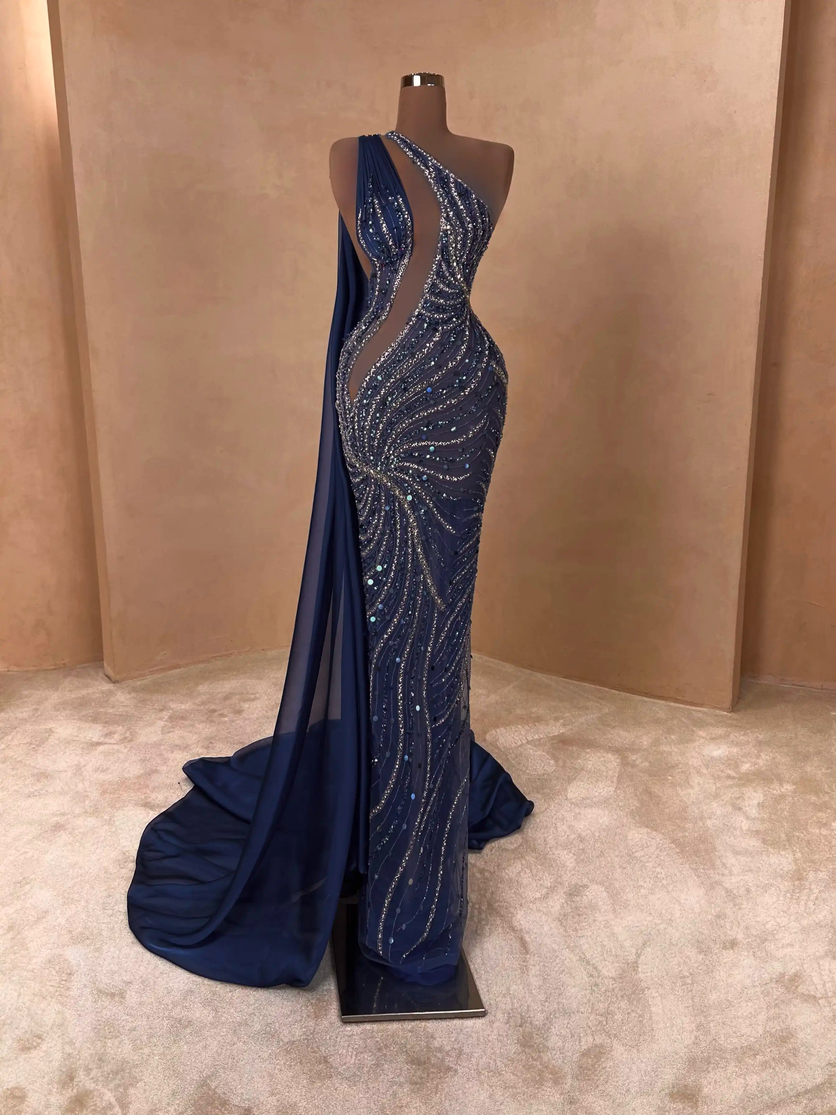 Modern elegance meets glamour in this midnight blue dress with one-shoulder styling and asymmetrical beading. The fitted silhouette and glimmering details make it perfect for high-profile evening events.