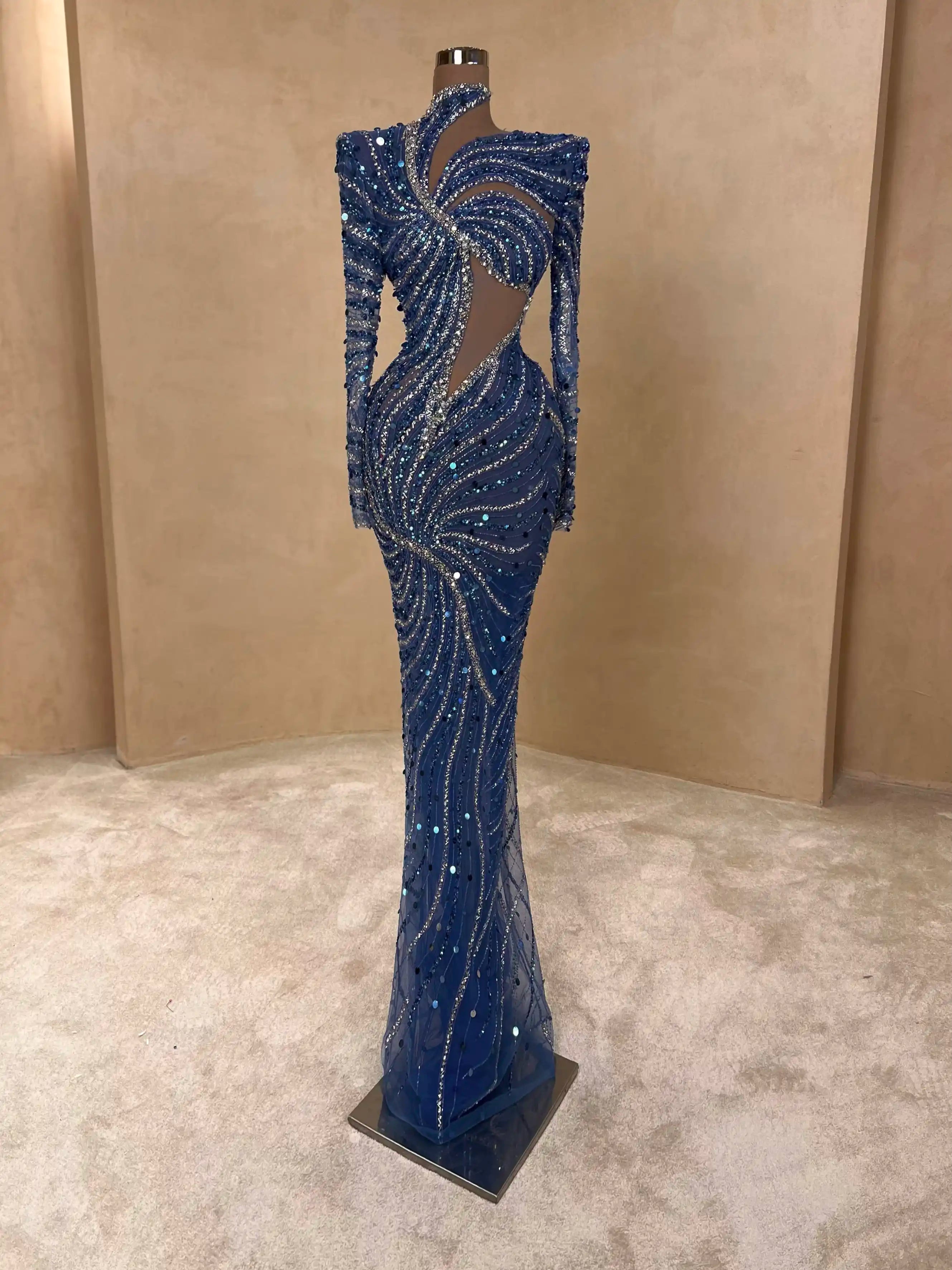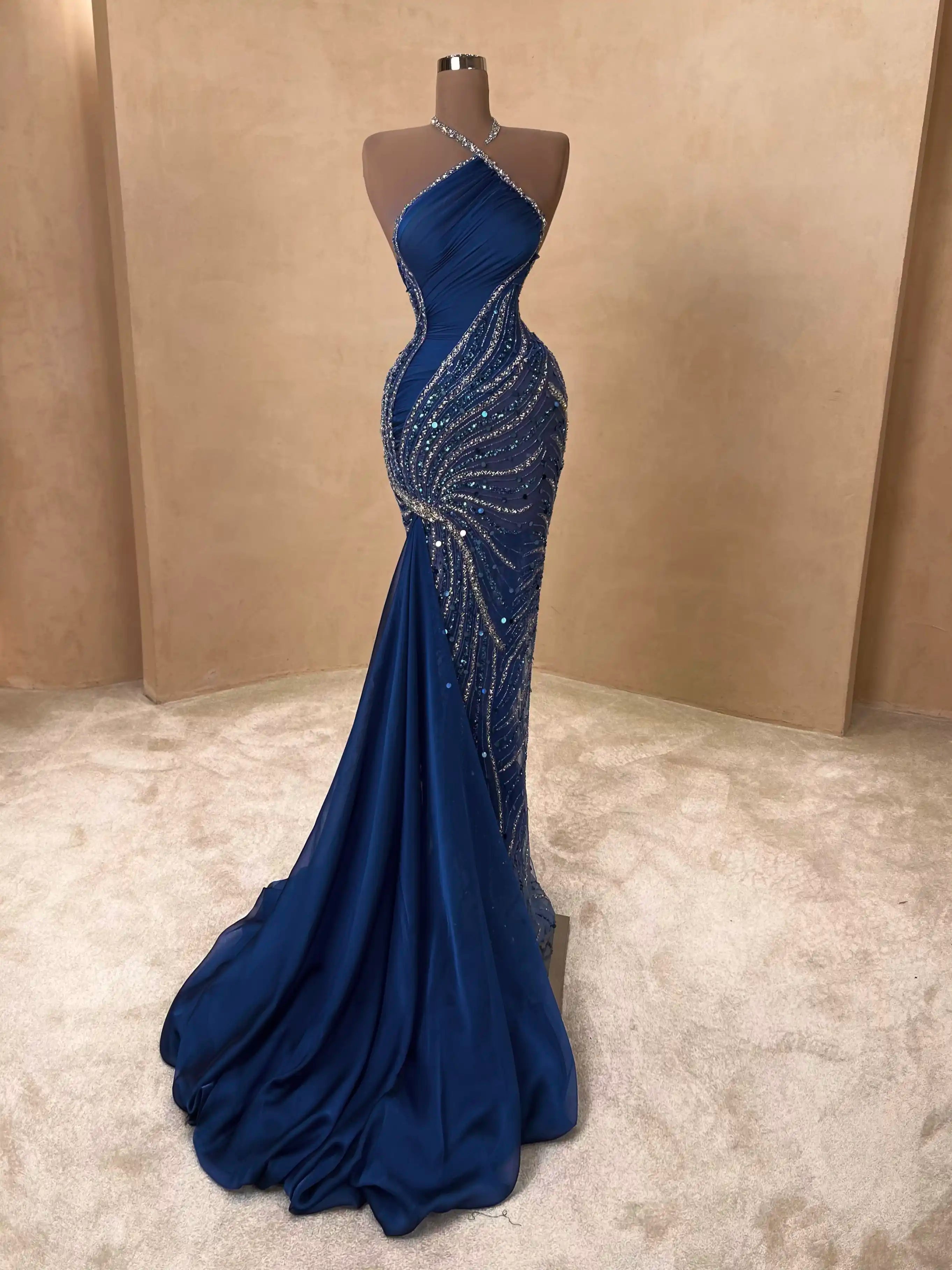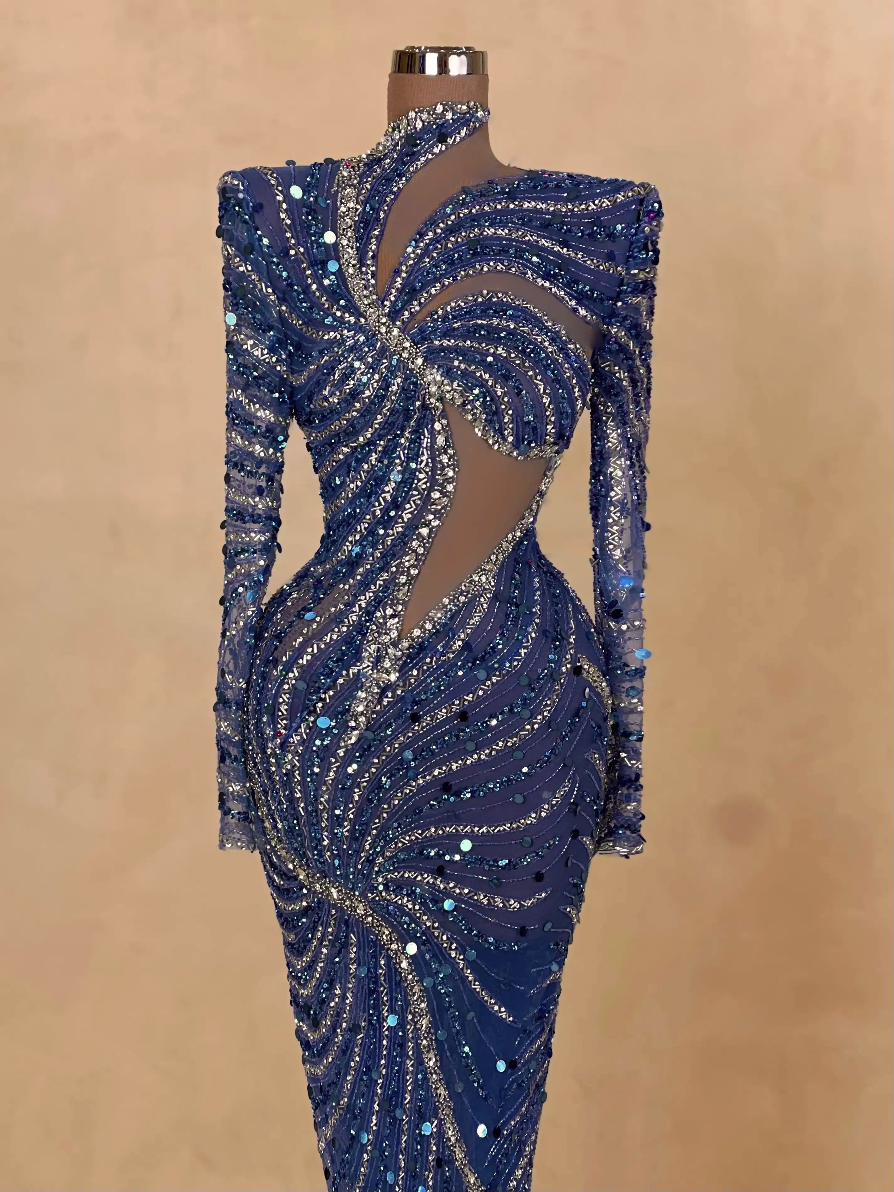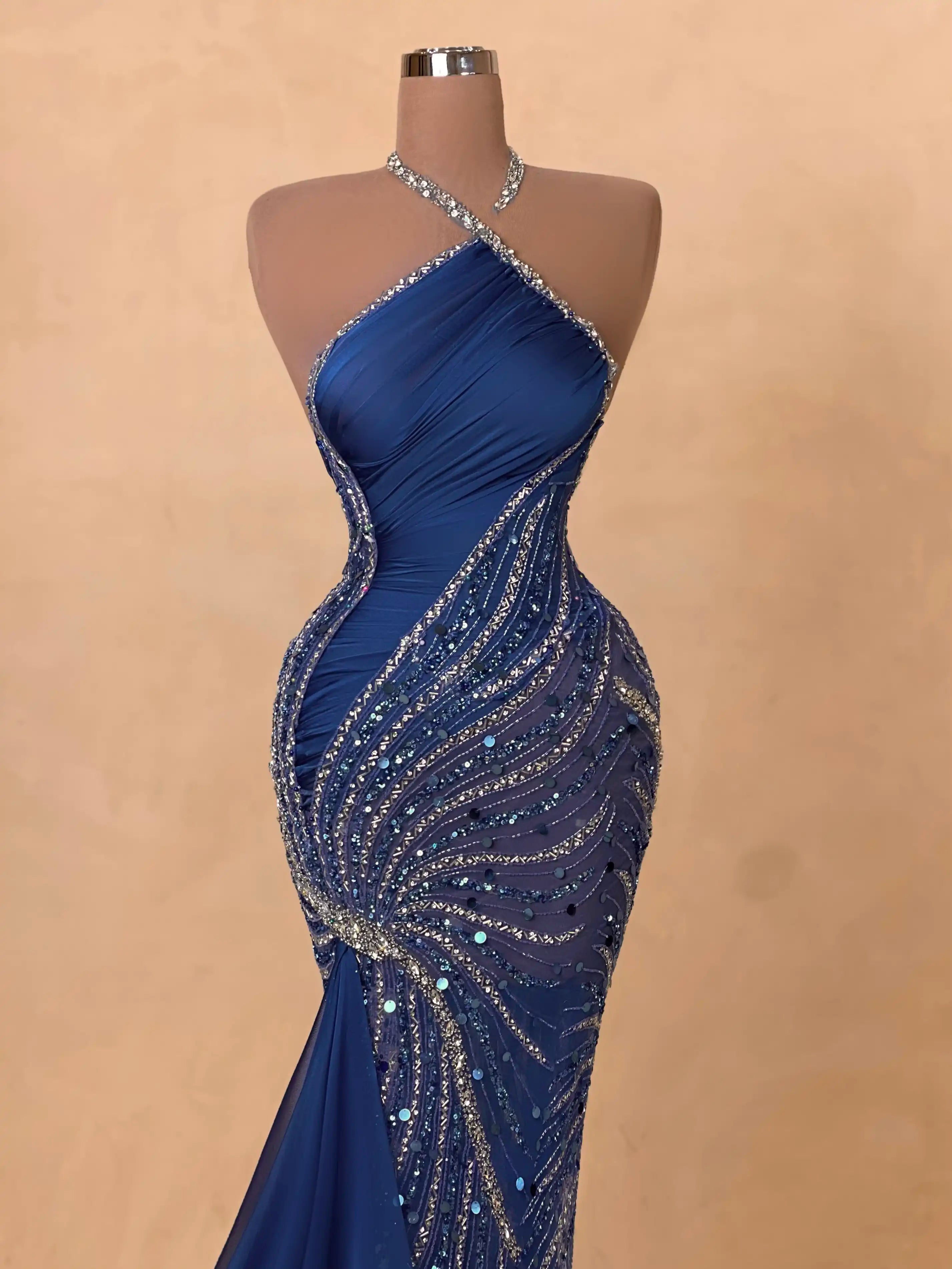 Modern elegance meets glamour in this midnight blue dress with one-shoulder styling and asymmetrical beading. The fitted silhouette and glimmering details make it perfect for high-profile evening events.