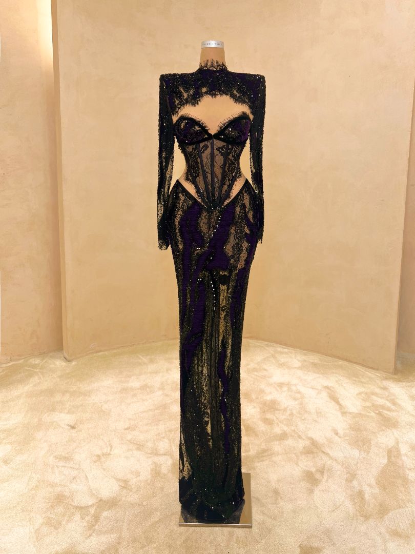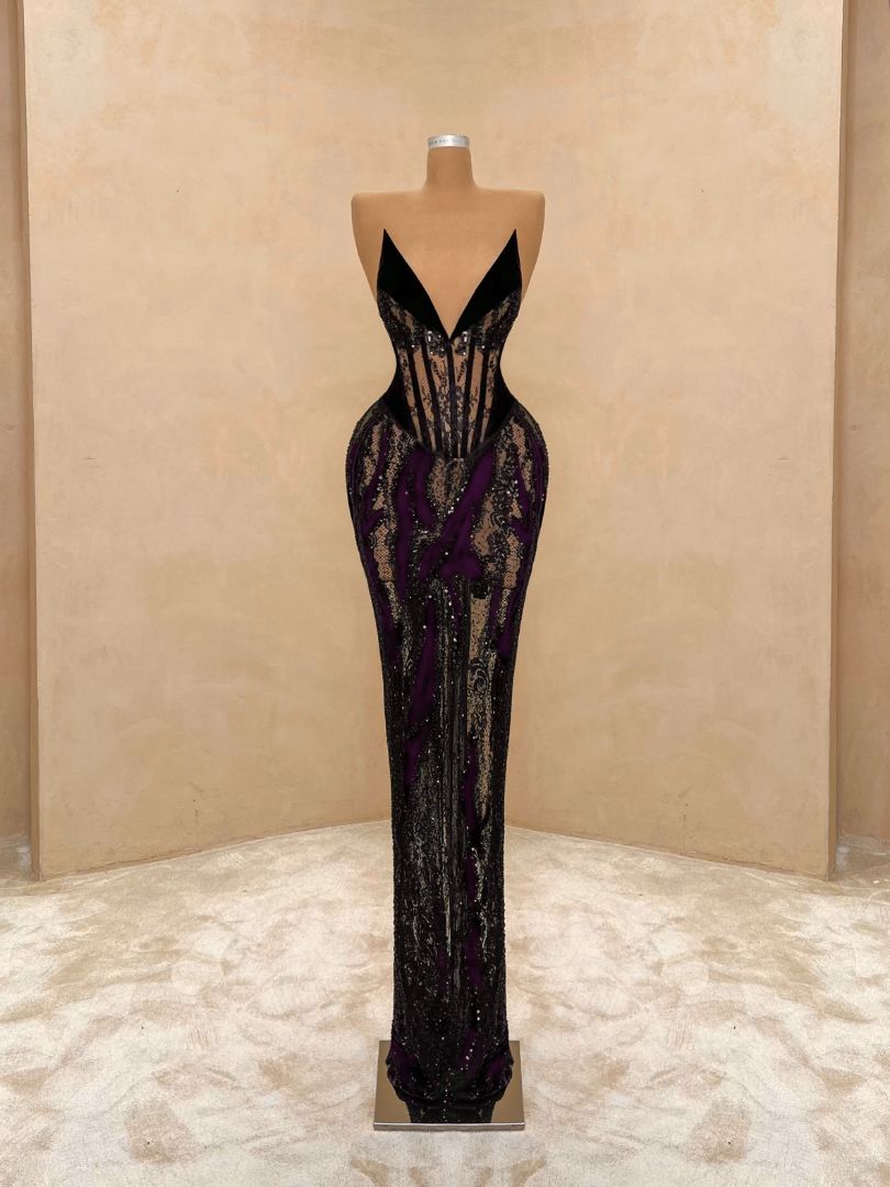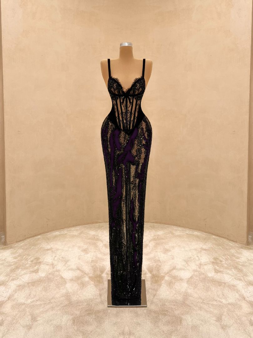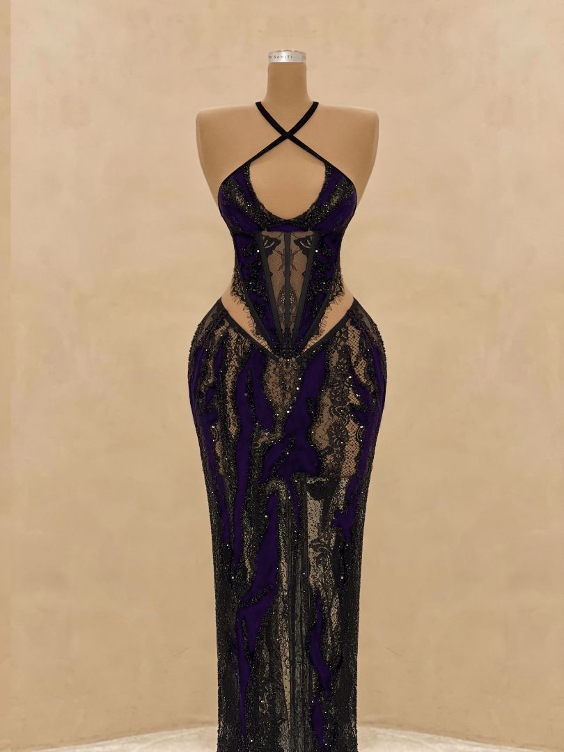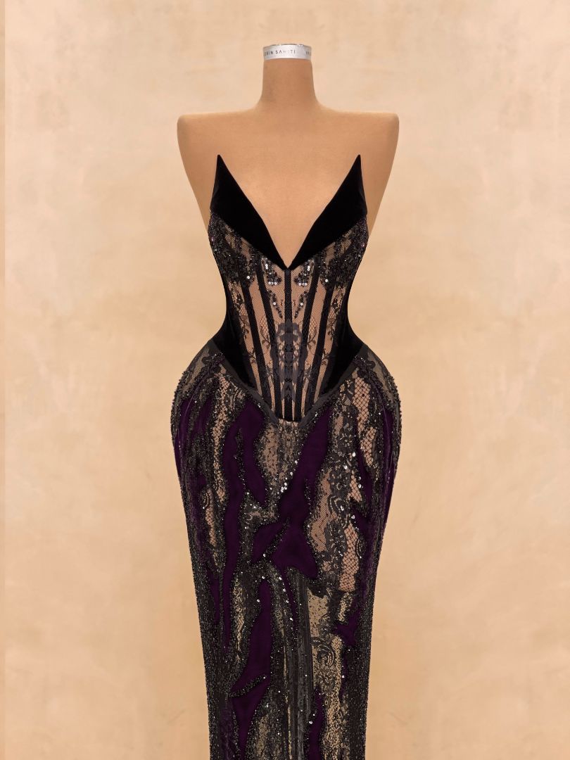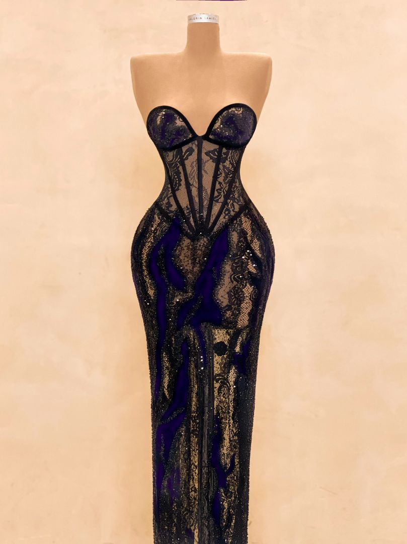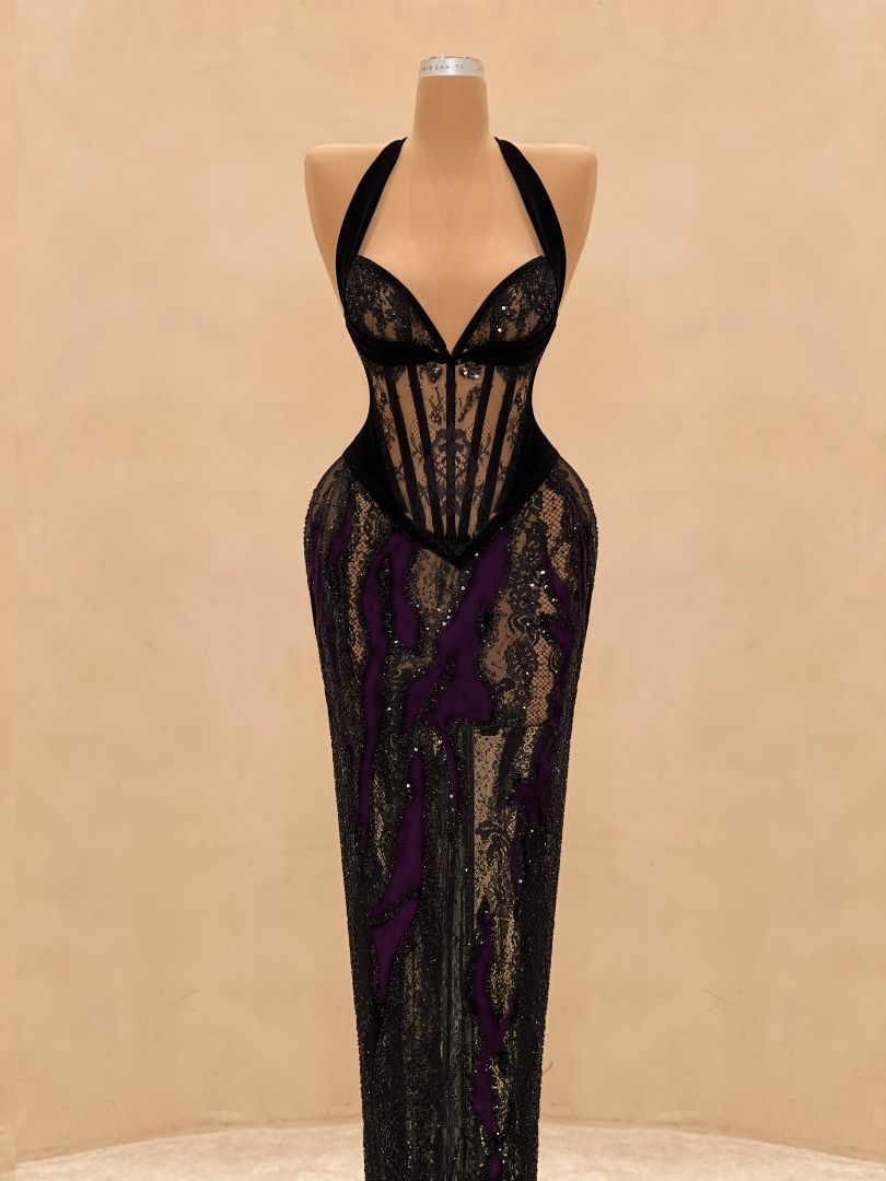 This dark navy and gold masterpiece combines modern structure with vintage elegance. Featuring a corset-style bodice, sheer panels, and intricate beadwork, it’s a dress made for making statements. The figure-enhancing silhouette and dramatic neckline create a couture-level impact.