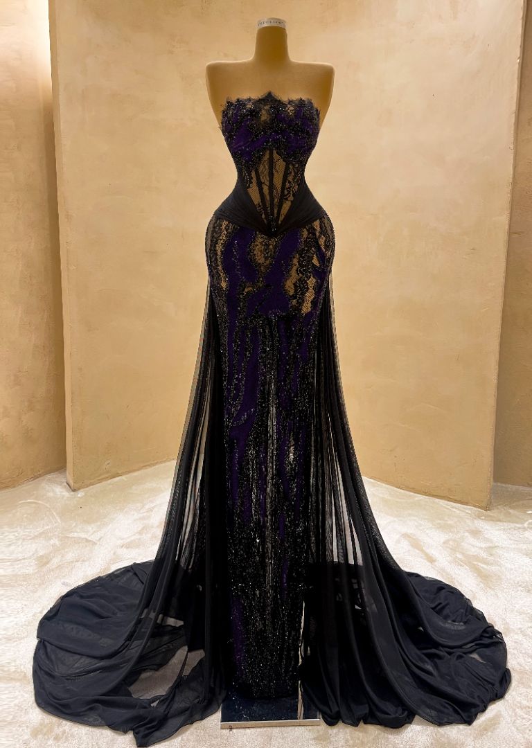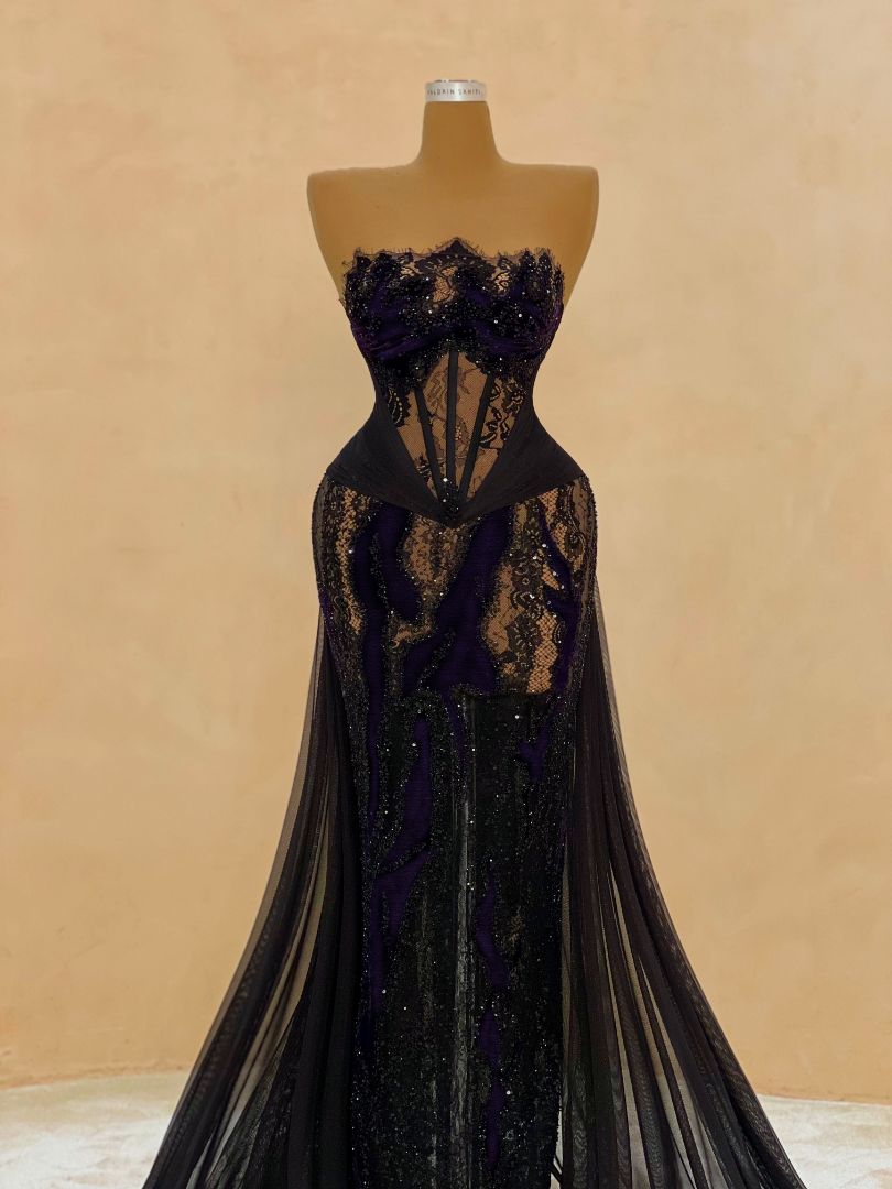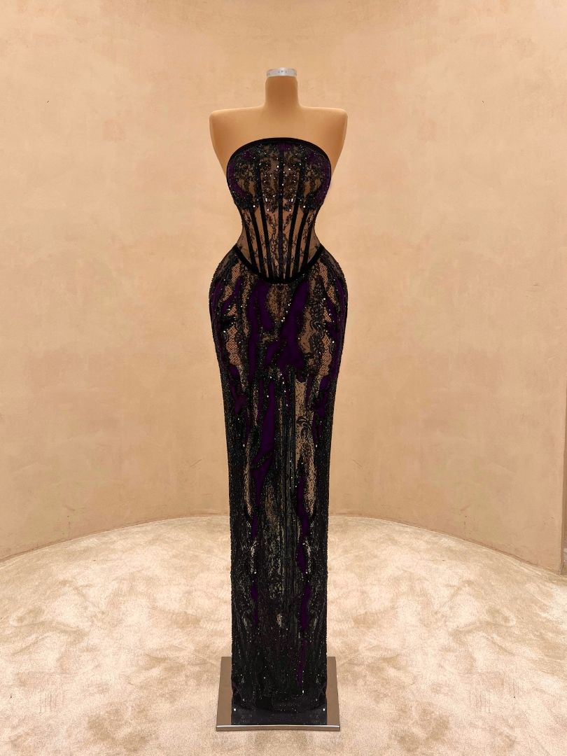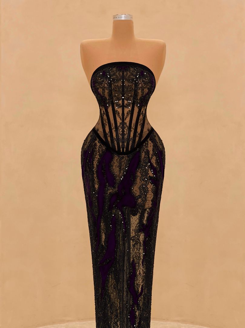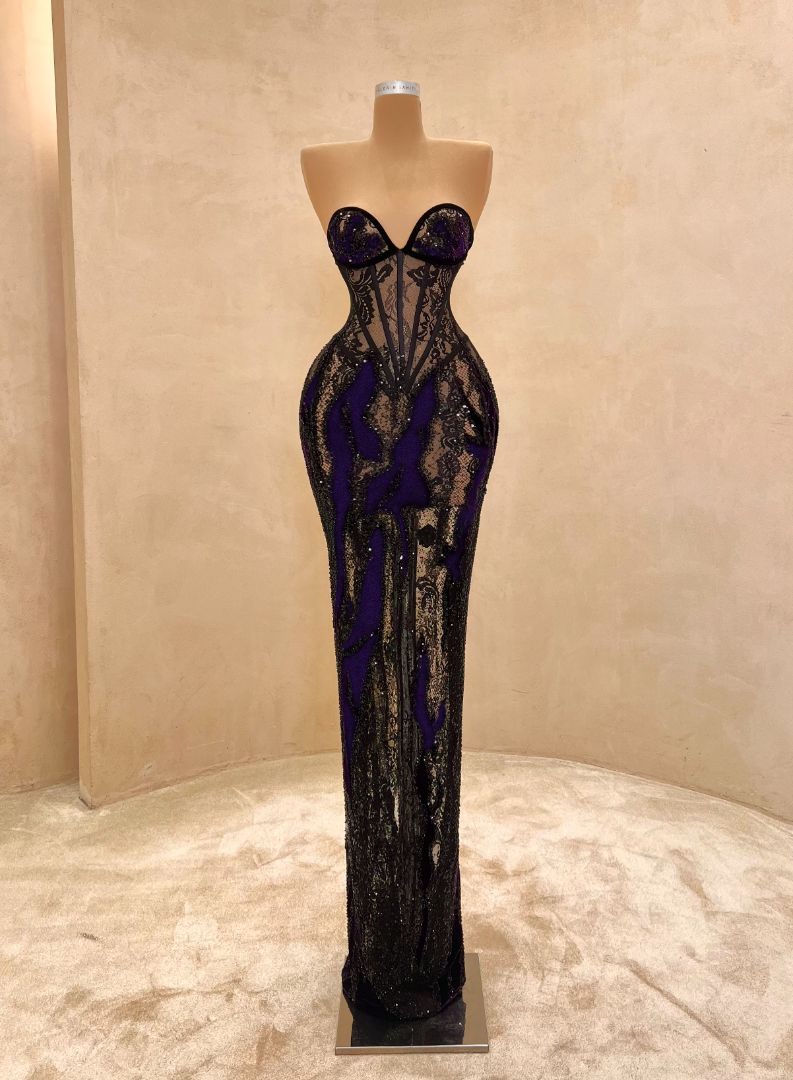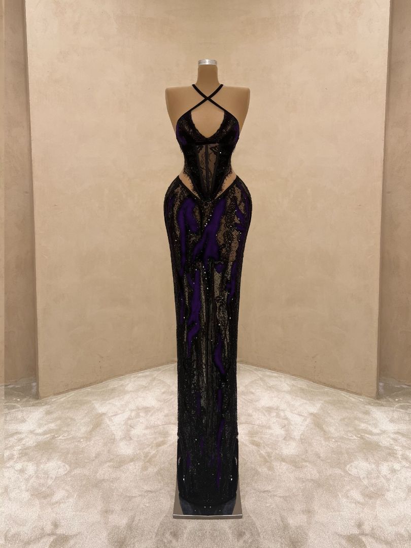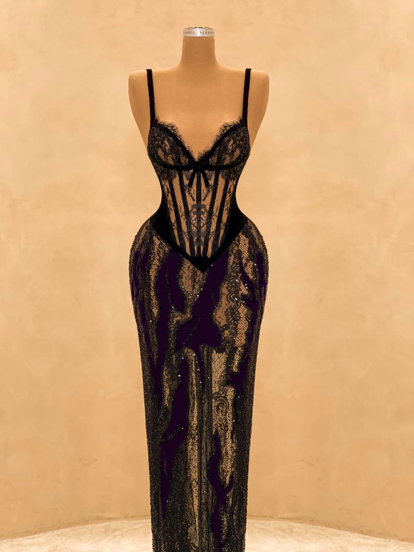 This dark navy and gold masterpiece combines modern structure with vintage elegance. Featuring a corset-style bodice, sheer panels, and intricate beadwork, it’s a dress made for making statements. The figure-enhancing silhouette and dramatic neckline create a couture-level impact.