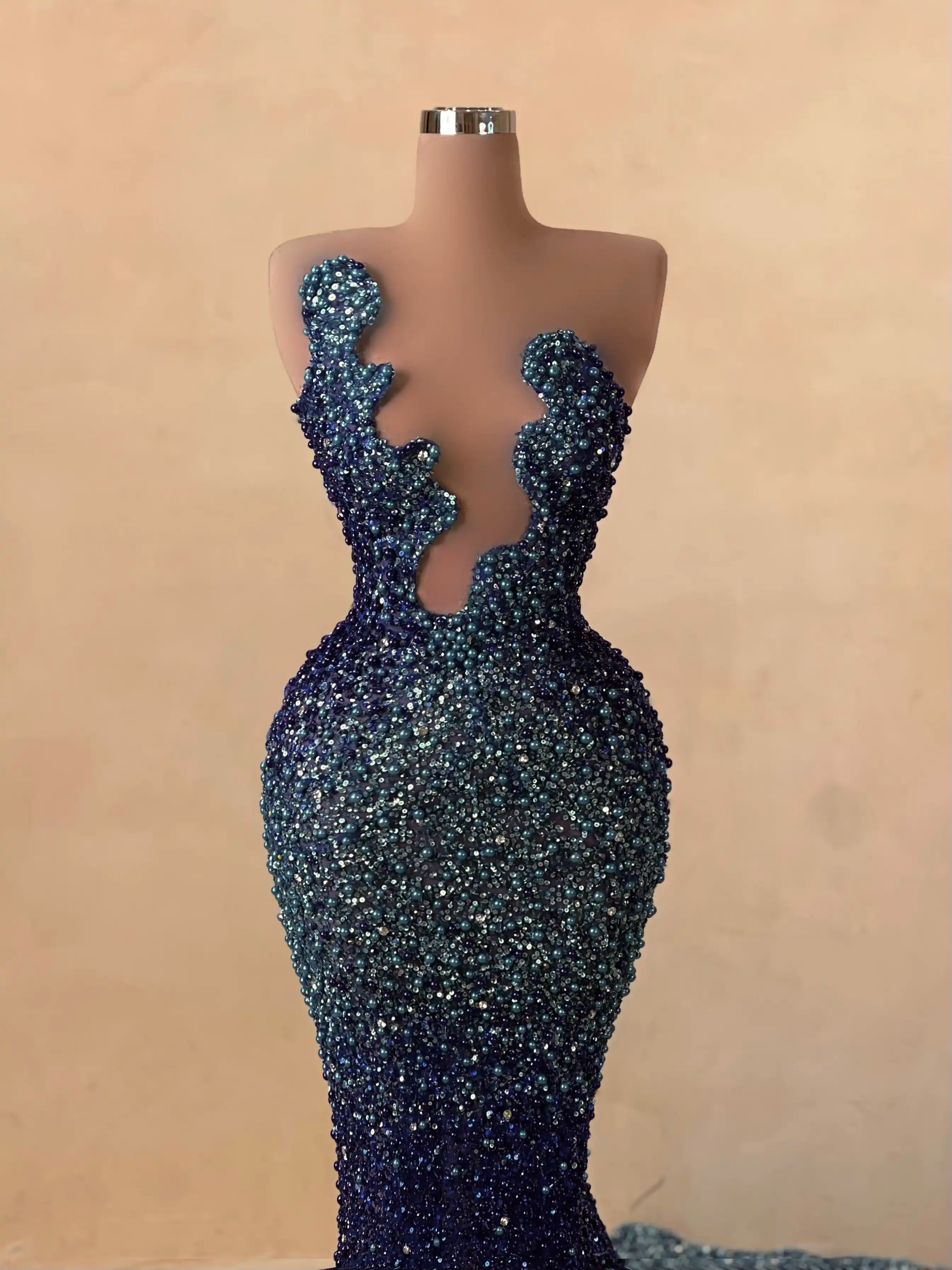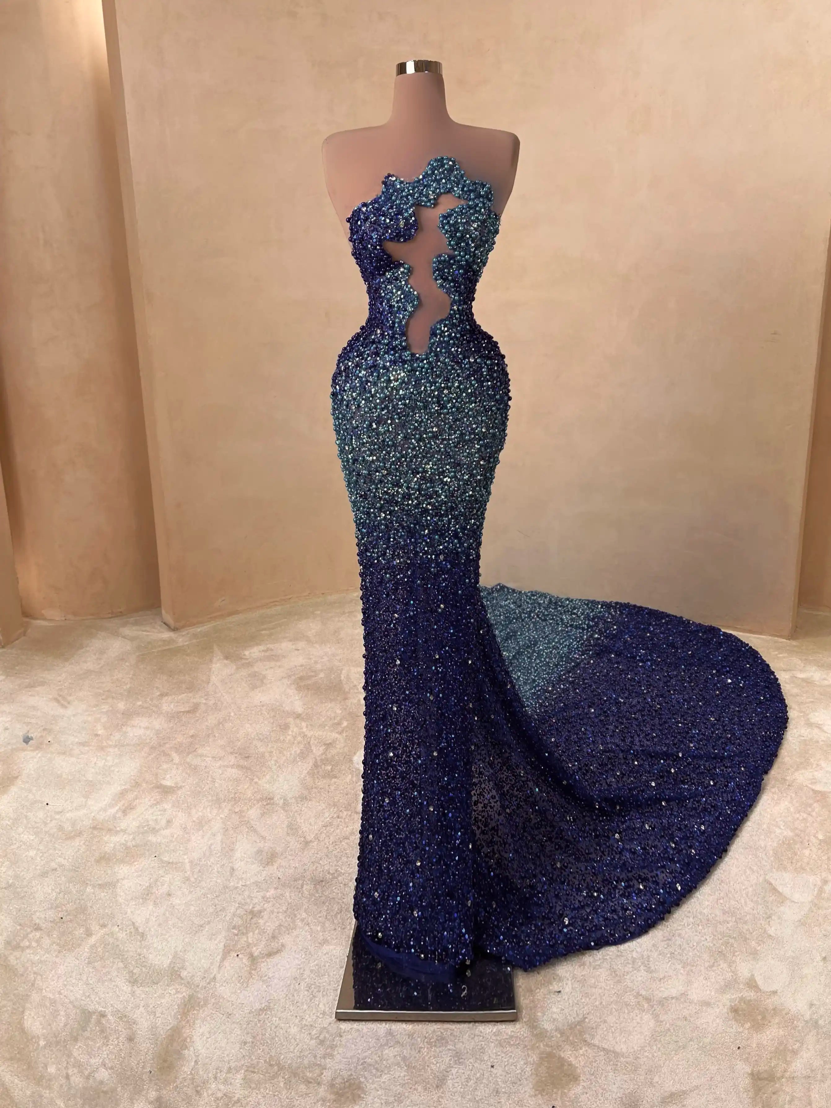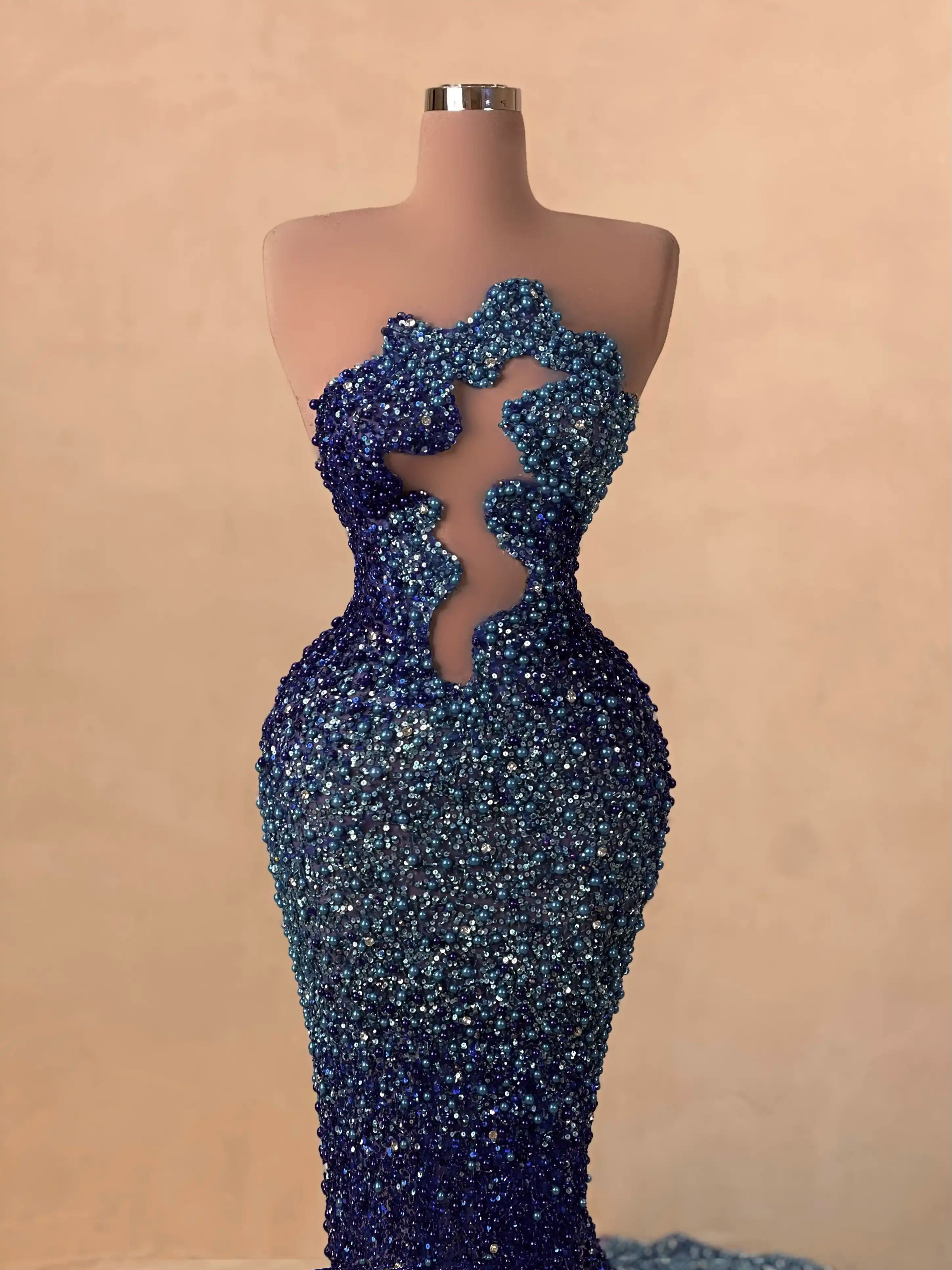 A dazzling creation in rich sapphire, this beaded red carpet gown features a form-fitting cut, structured bustier, and elegant sparkle that catches every flash. A bold statement of luxury and confidence.