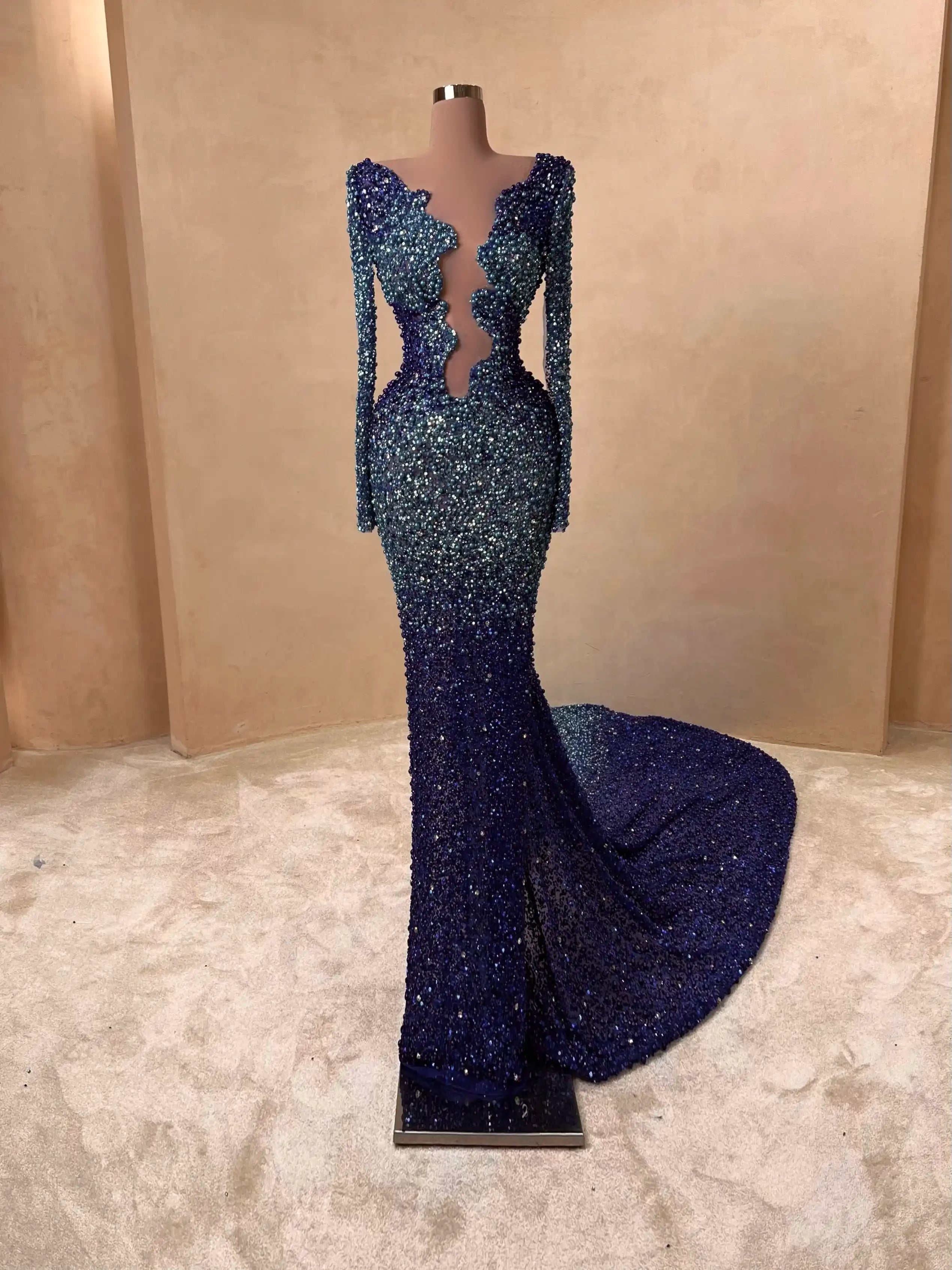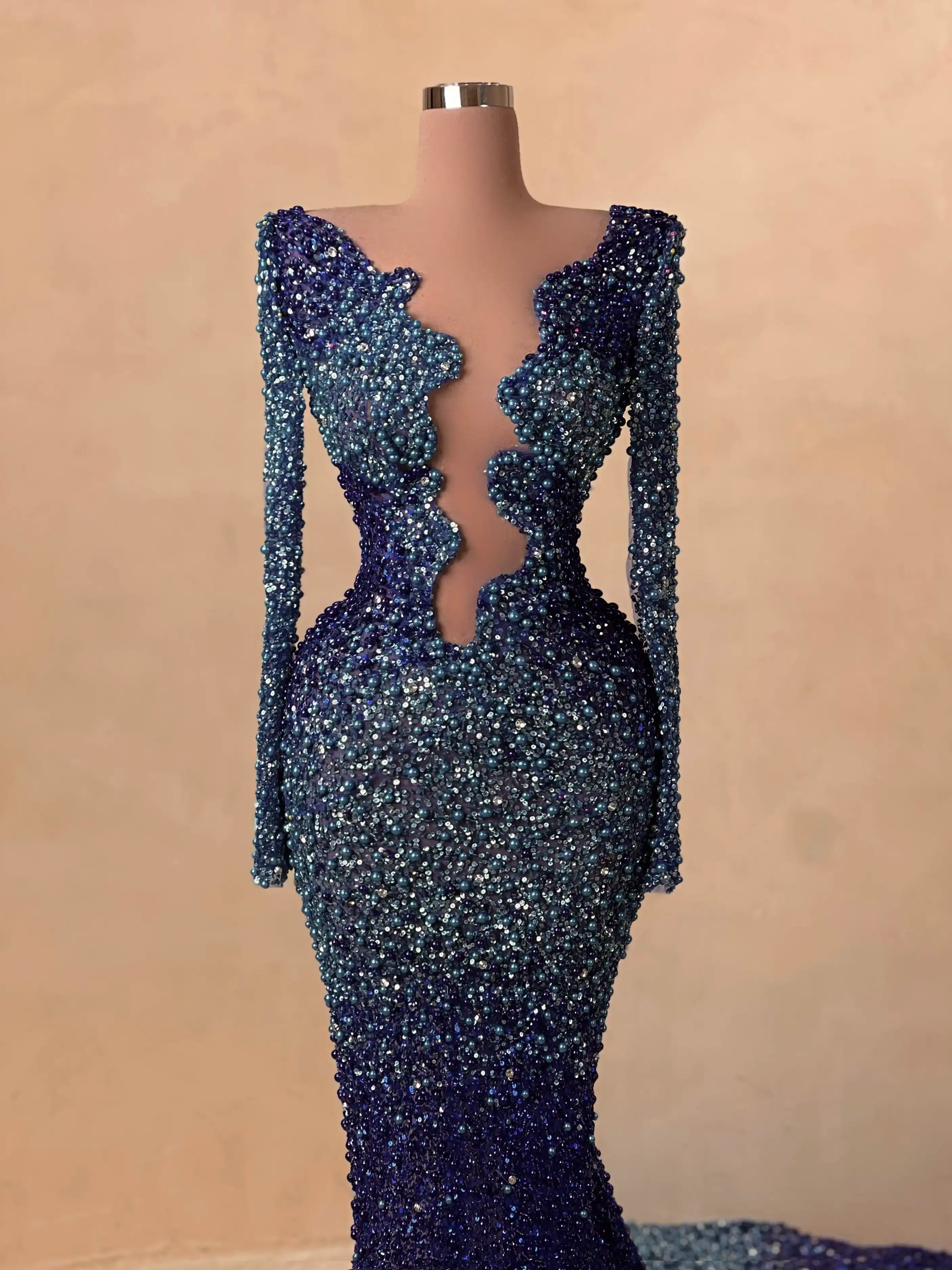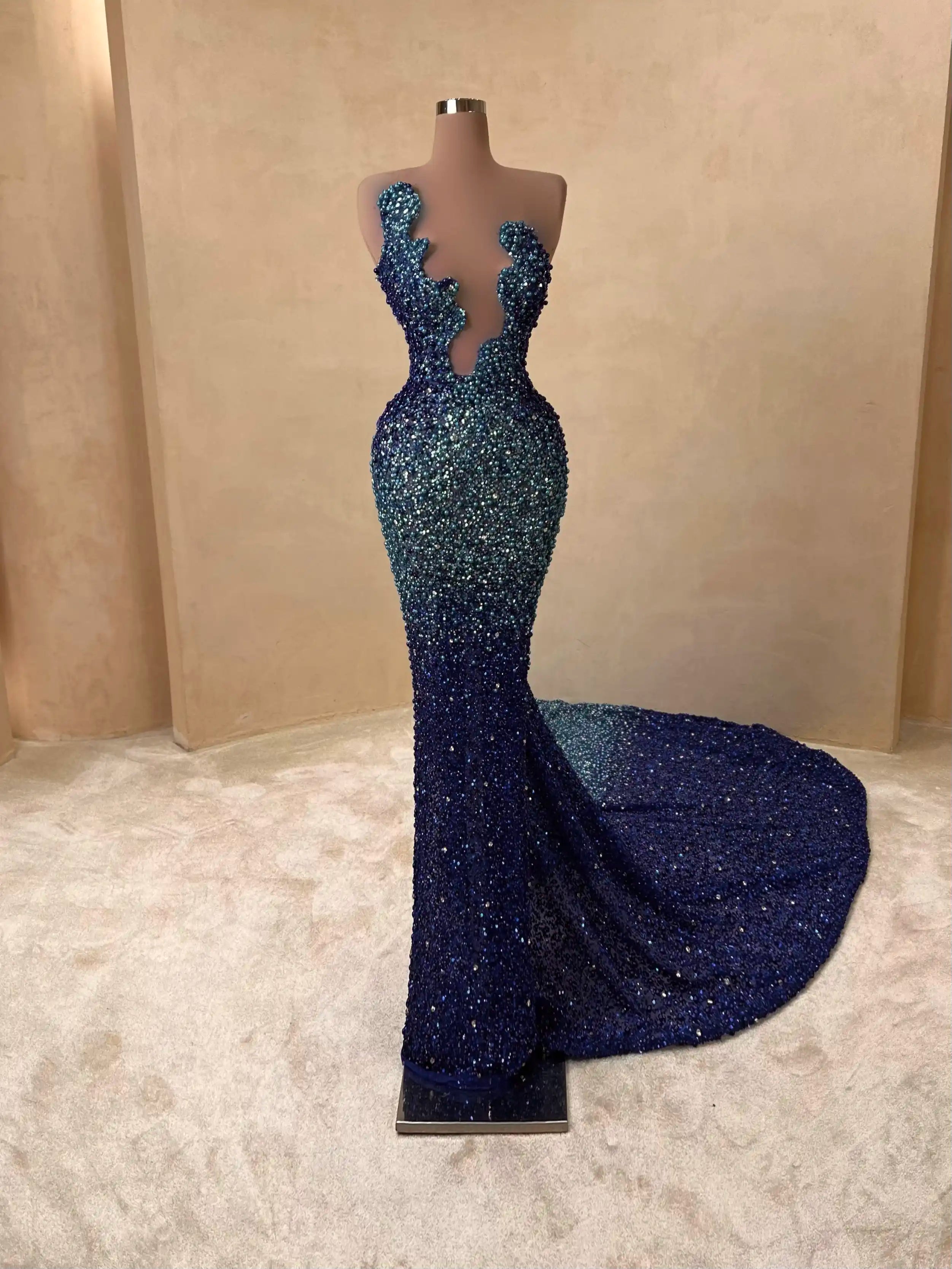 A dazzling creation in rich sapphire, this beaded red carpet gown features a form-fitting cut, structured bustier, and elegant sparkle that catches every flash. A bold statement of luxury and confidence.