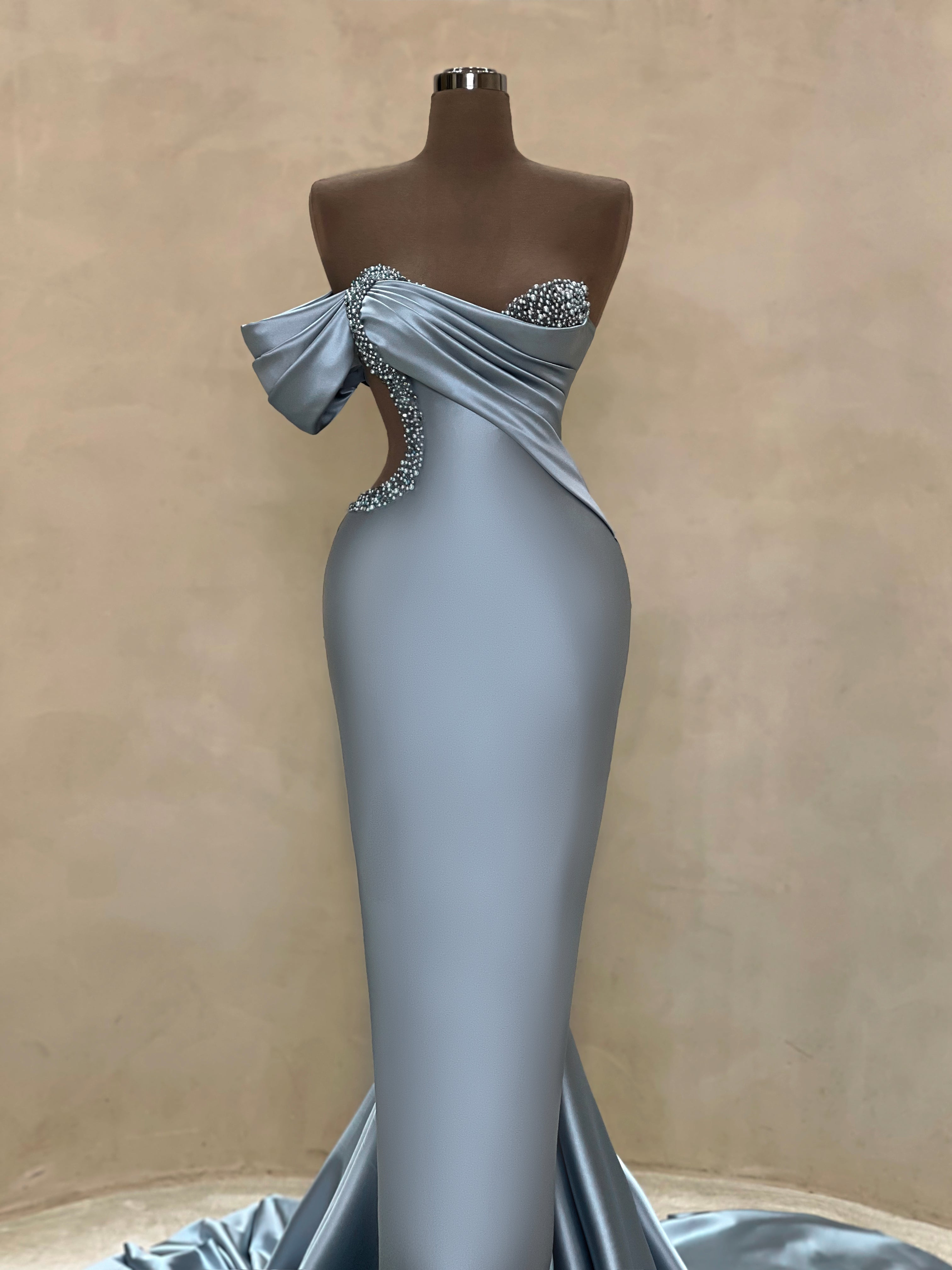 This icy silver gown is designed to shine. A crisscross halter neckline meets a sculpted, ruched bodice and hip-high slit, offering structure, shimmer, and flow all in one. With its metallic sheen and figure-hugging fit, it’s made for spotlight moments on glamorous occasions.