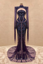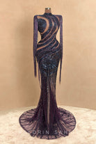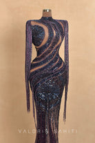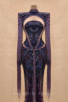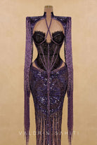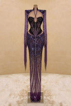 A striking purple gown designed with a sculpted cutout silhouette and fully embellished crystal detailing. The structured bodice frames the body with precision, while cascading beadwork elongates the shape and adds fluid movement. Signature Valdrin Sahiti lines contour the waist and hips, creating a powerful hourglass effect. A dramatic, modern statement for evening events and red-carpet moments.