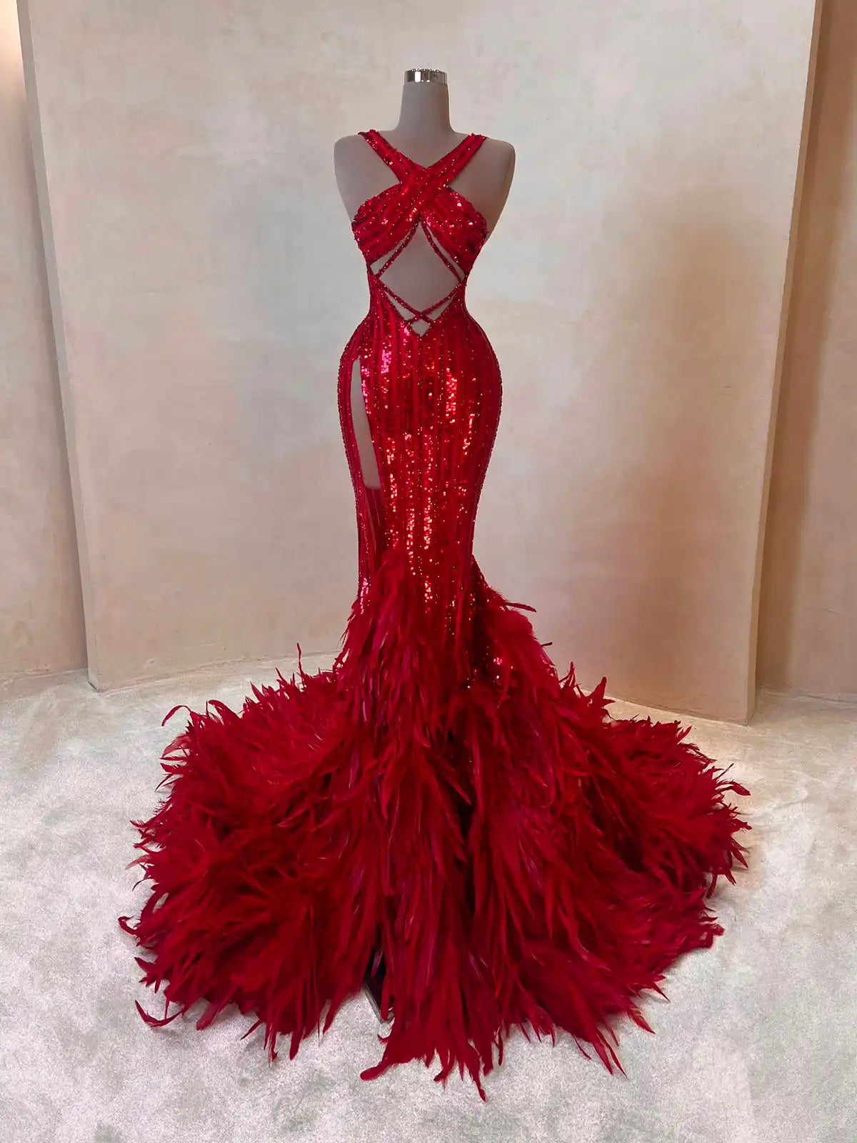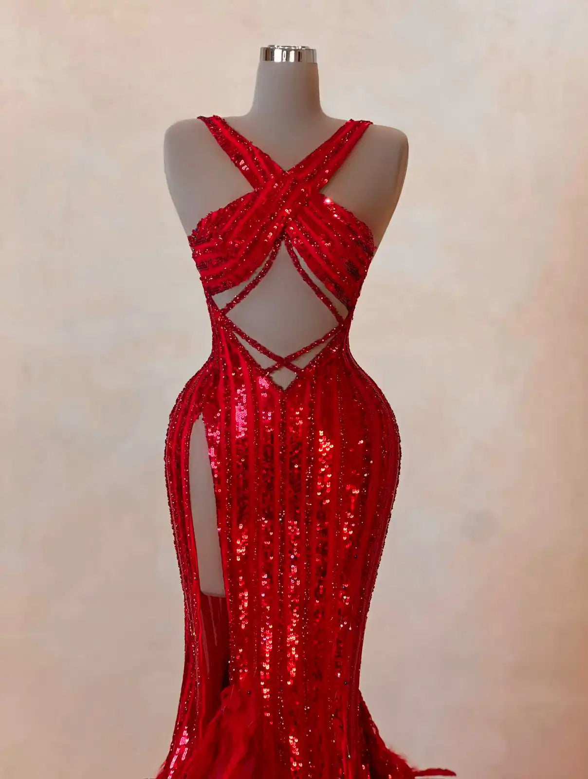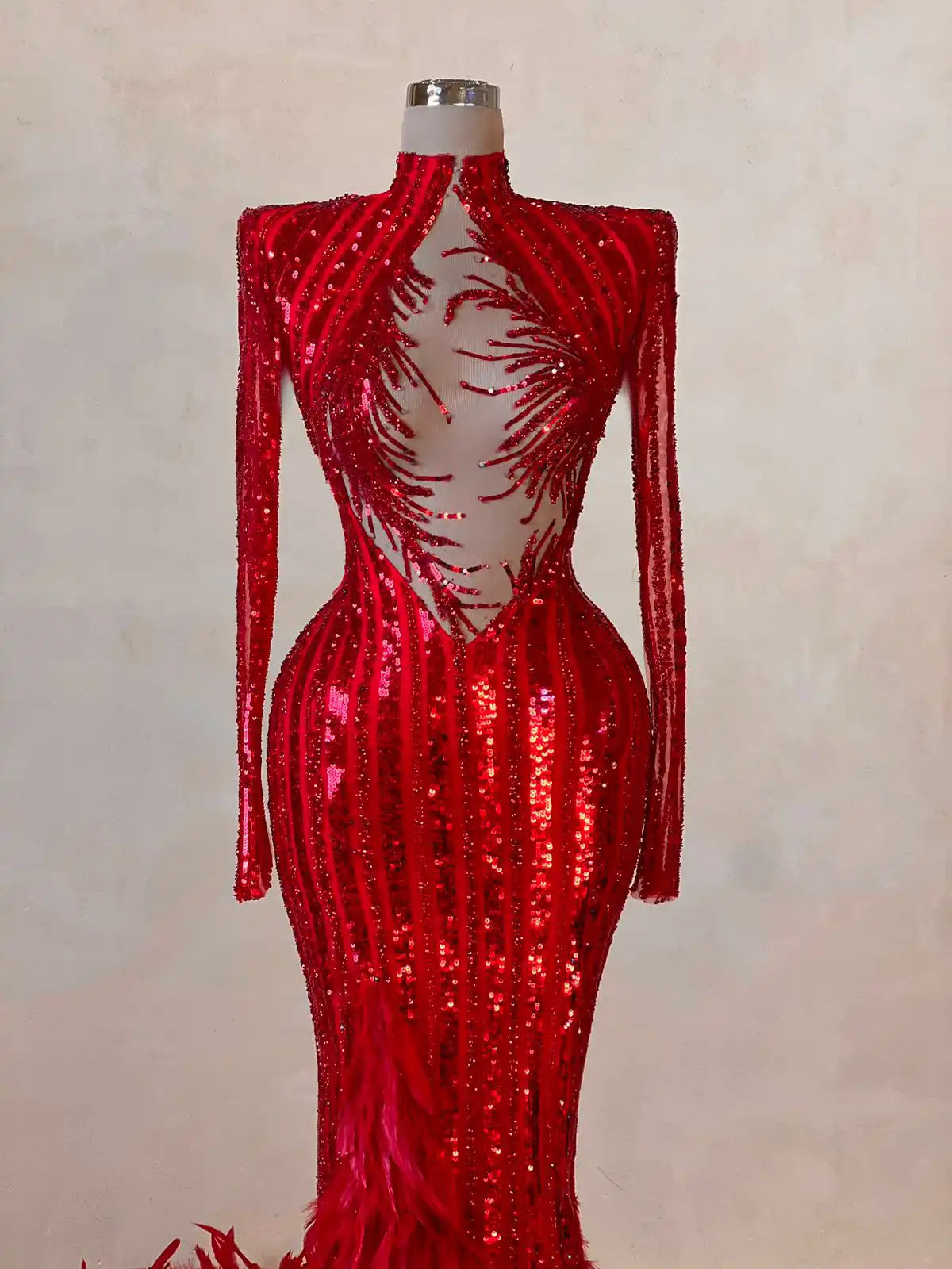 This crimson couture gown is all about movement and drama. The shimmering sequin-embellished silhouette features a strappy bodice with cut-out detailing and bold floor-length cape sleeves. The feathered hemline and sheer paneling bring red carpet extravagance to life.