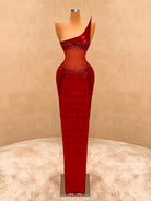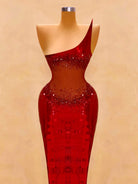 An unforgettable silhouette that speaks volumes. This ruby red one-shoulder gown features sheer illusion tulle and is fully hand-embellished with cascading crystals and intricate detailing. Designed to contour the body, the asymmetric neckline and sharp side cutout add drama and sensuality. Perfect for red carpets, gala events, or any night made for owning the spotlight.