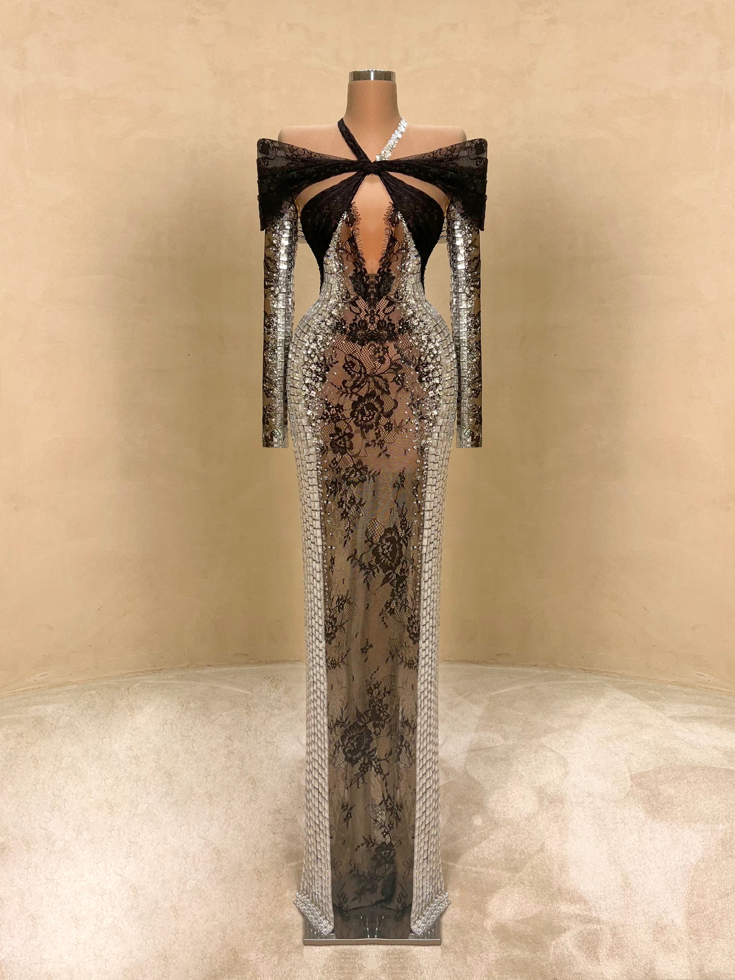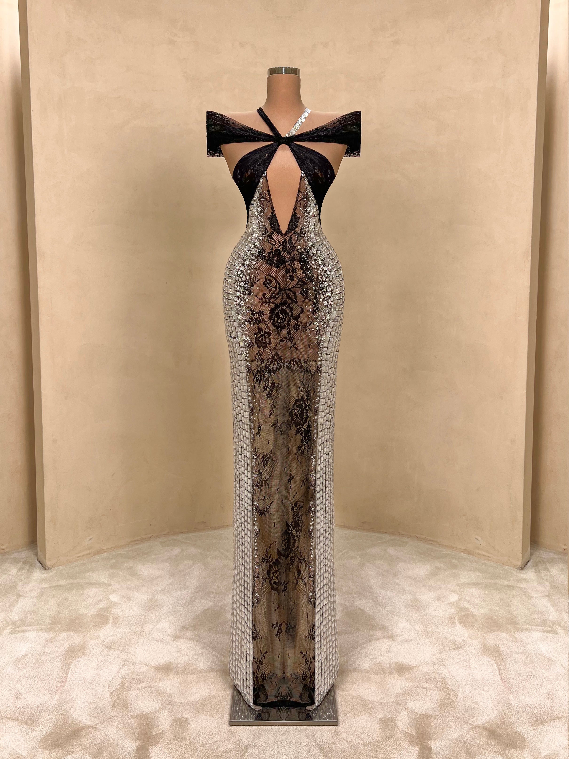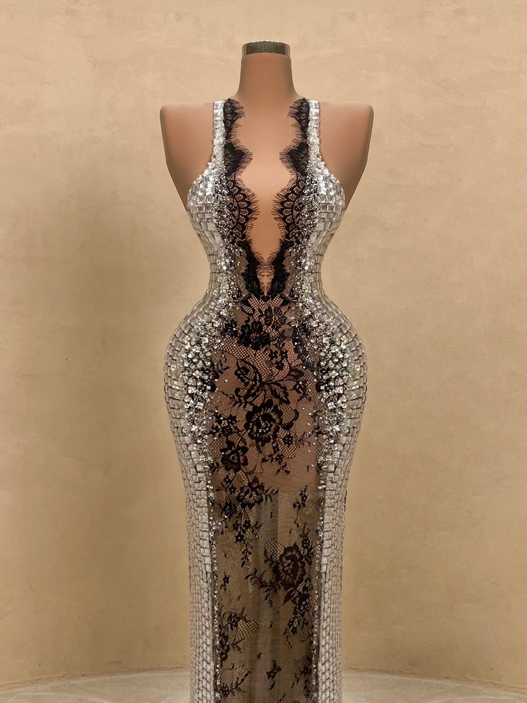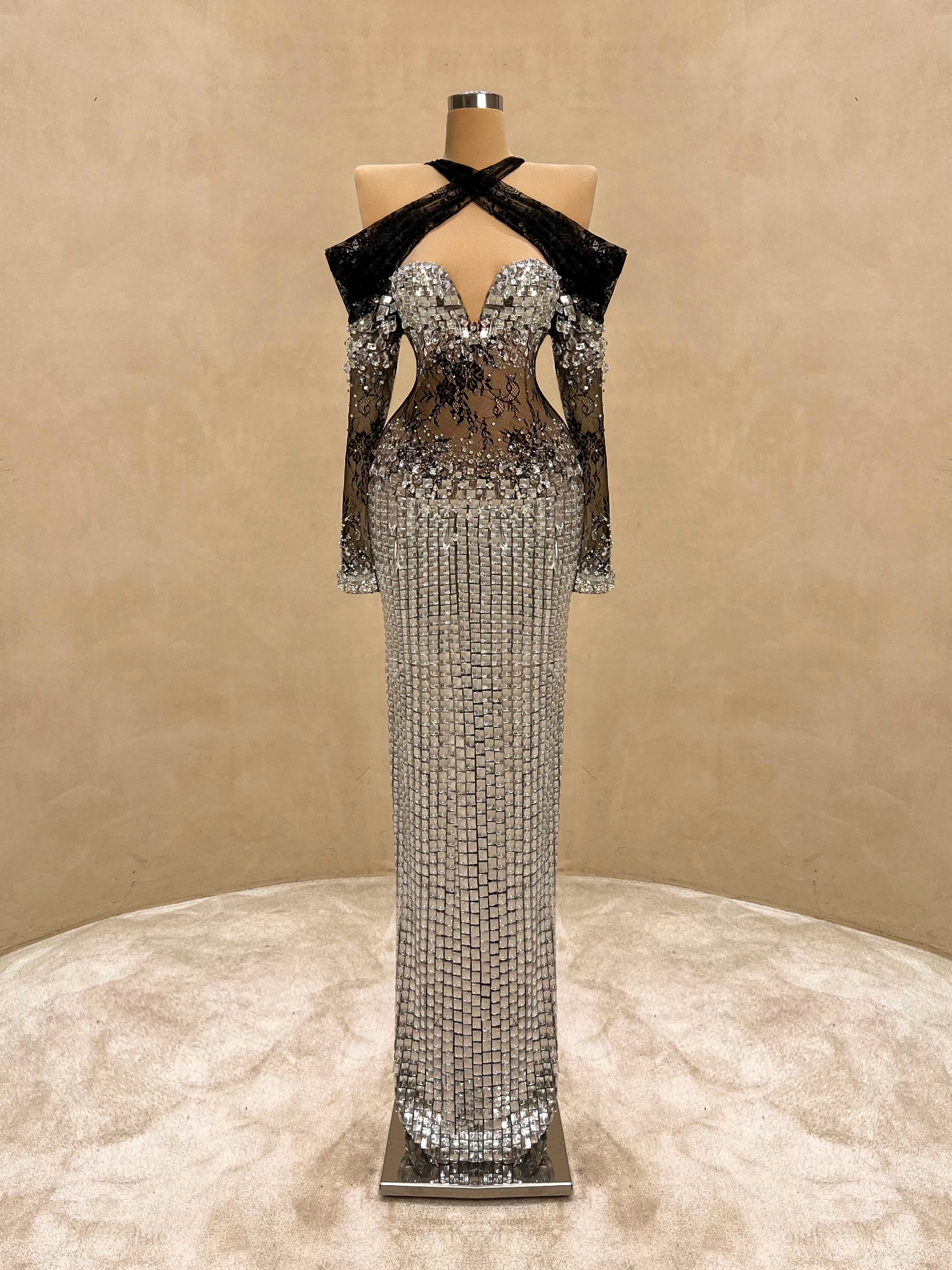 Daring elegance meets modern glamour in this strapless evening gown. Adorned with reflective silver crystals and a sheer black lace bodice that accentuates the waist, this form-fitting silhouette creates an unforgettable hourglass illusion. A bold choice for high-end events, galas, or exclusive parties.
