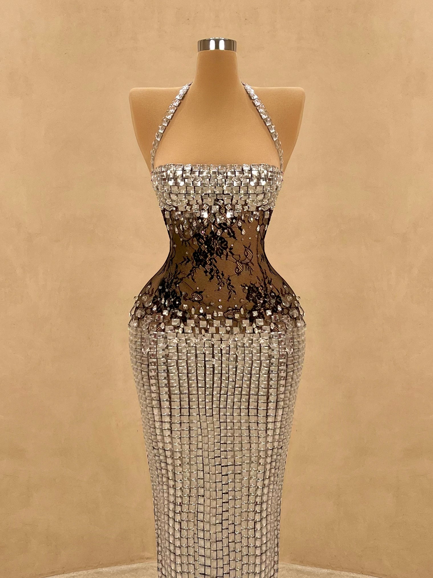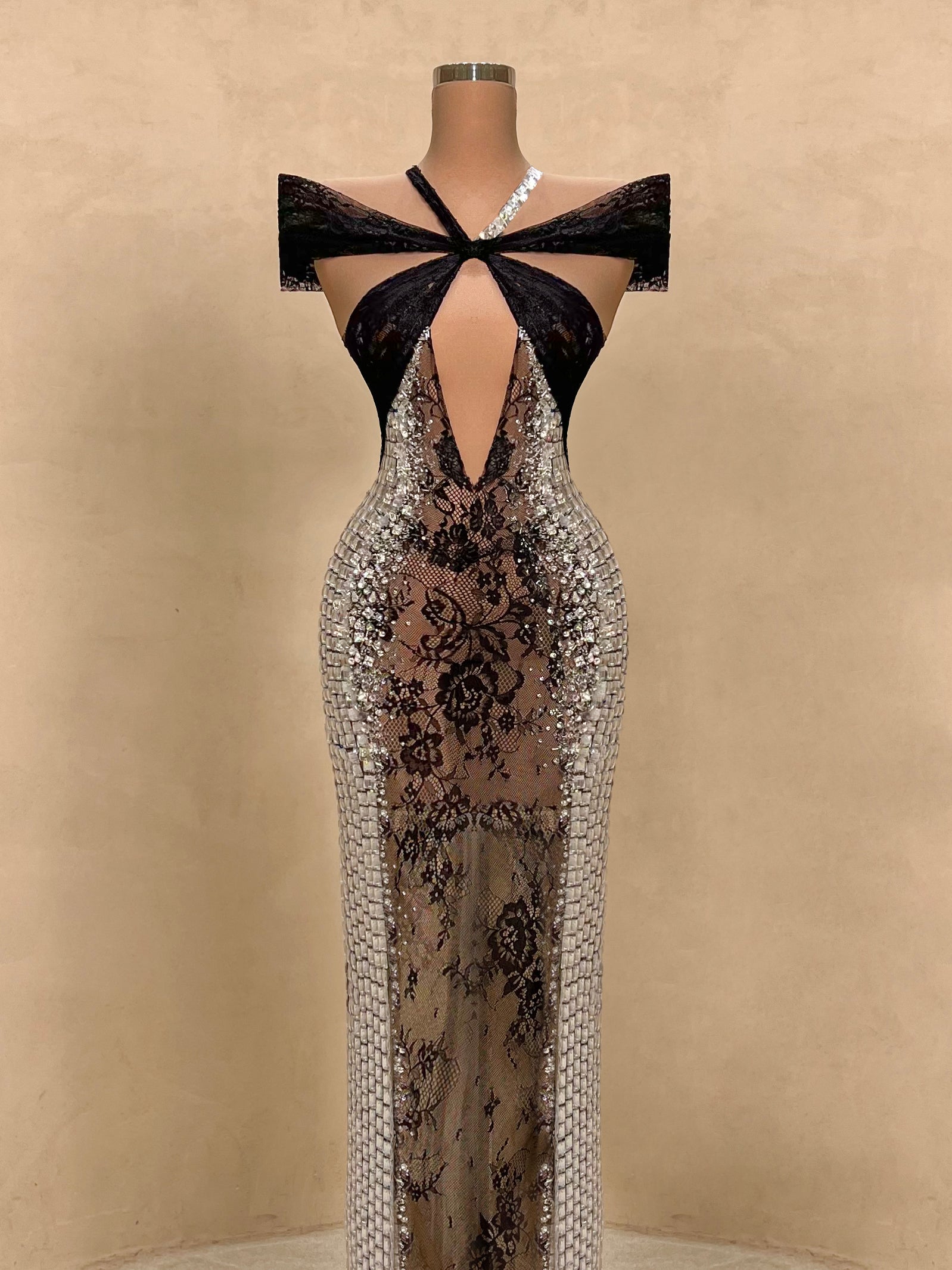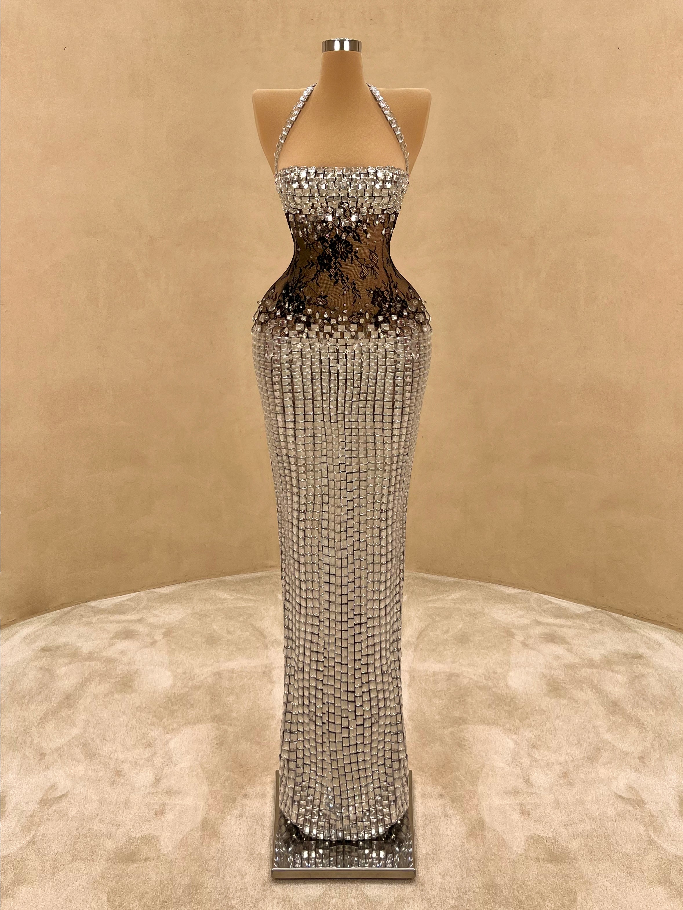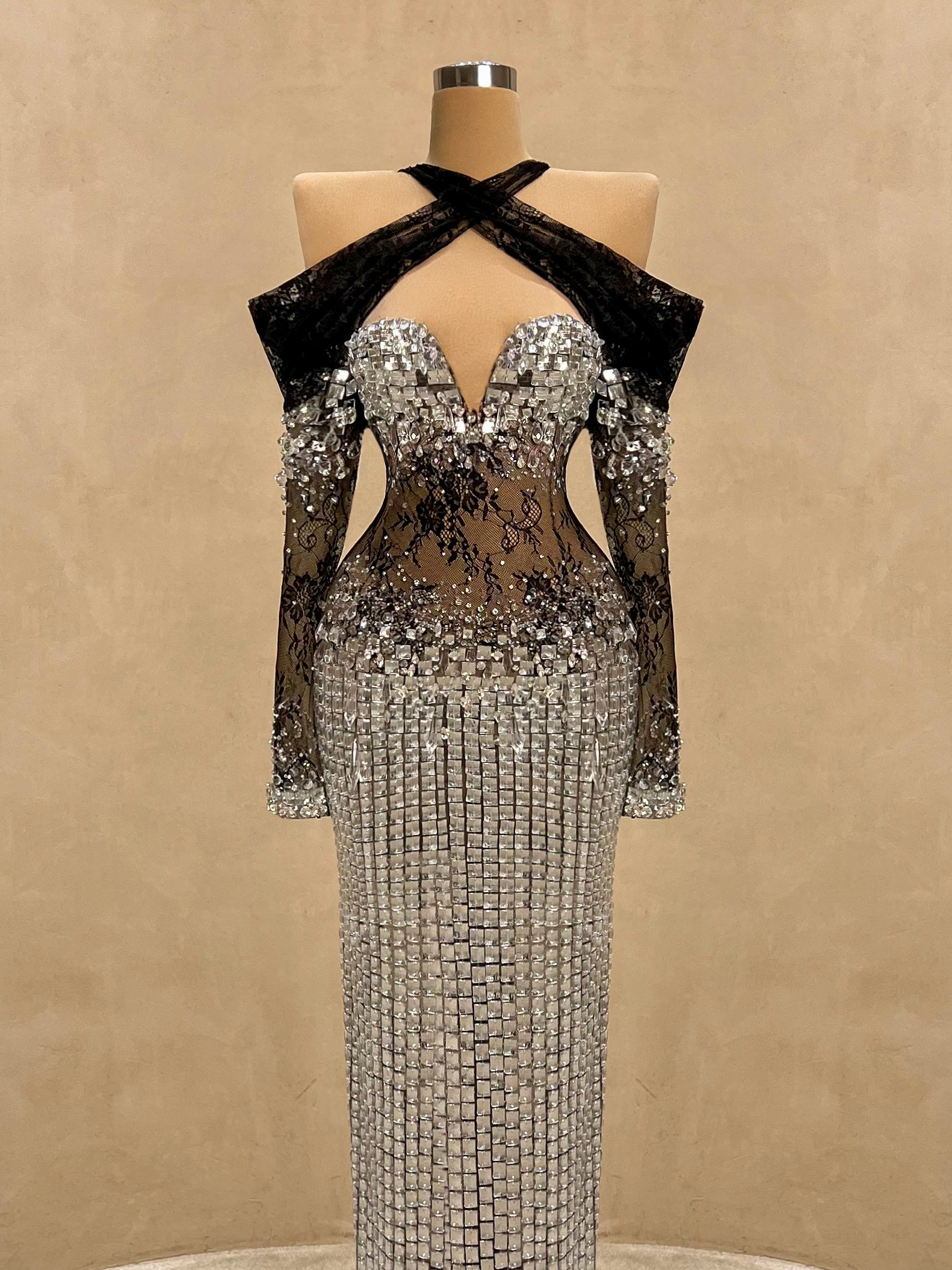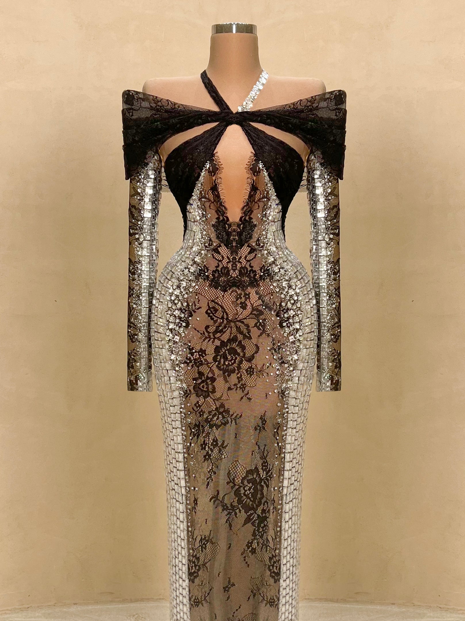 Daring elegance meets modern glamour in this strapless evening gown. Adorned with reflective silver crystals and a sheer black lace bodice that accentuates the waist, this form-fitting silhouette creates an unforgettable hourglass illusion. A bold choice for high-end events, galas, or exclusive parties.