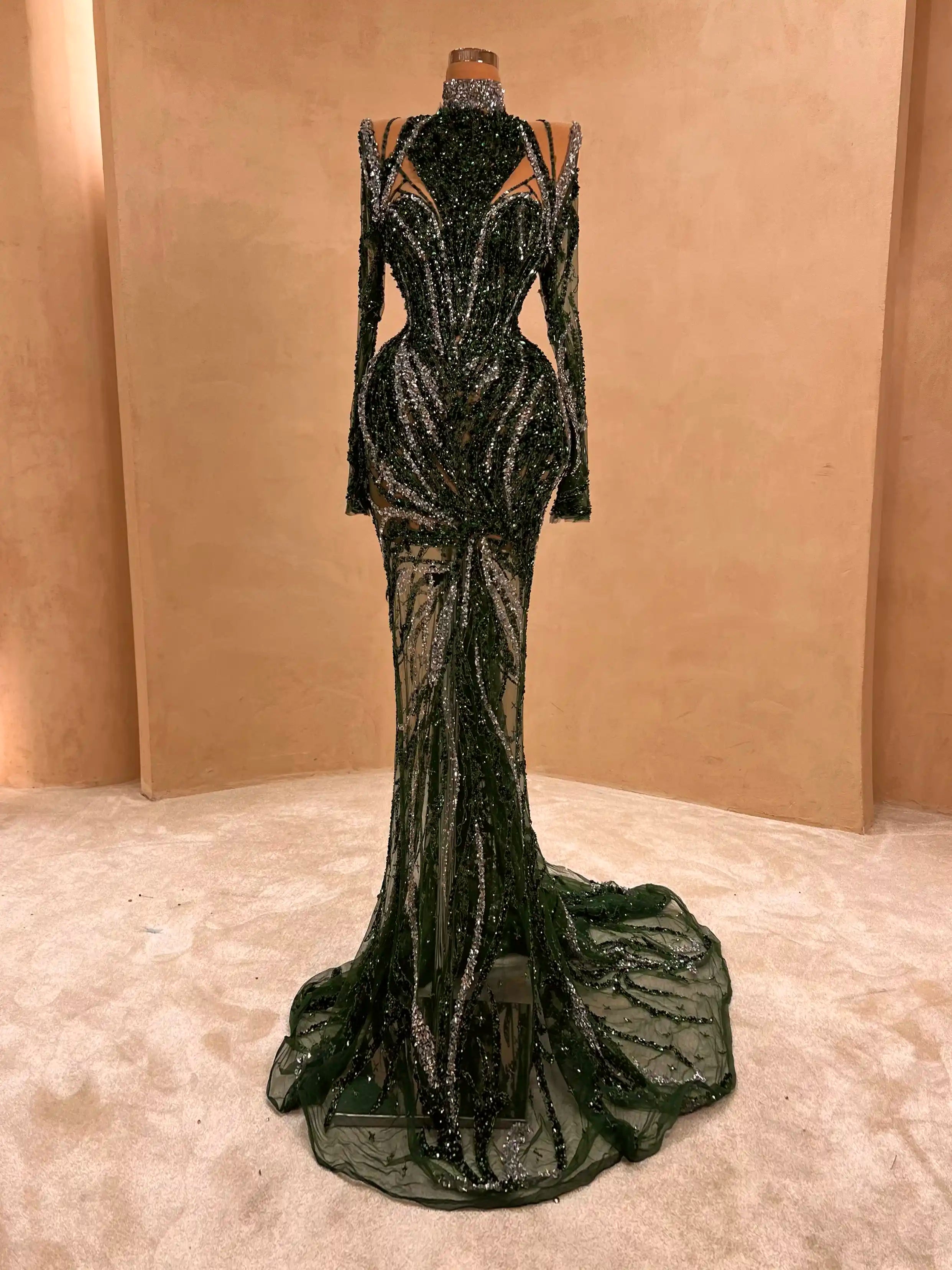 A vision of power and opulence, this structured emerald gown features sharp shoulder accents, intricate beadwork, and a commanding silhouette. Ideal for high-fashion events where bold presence is key.