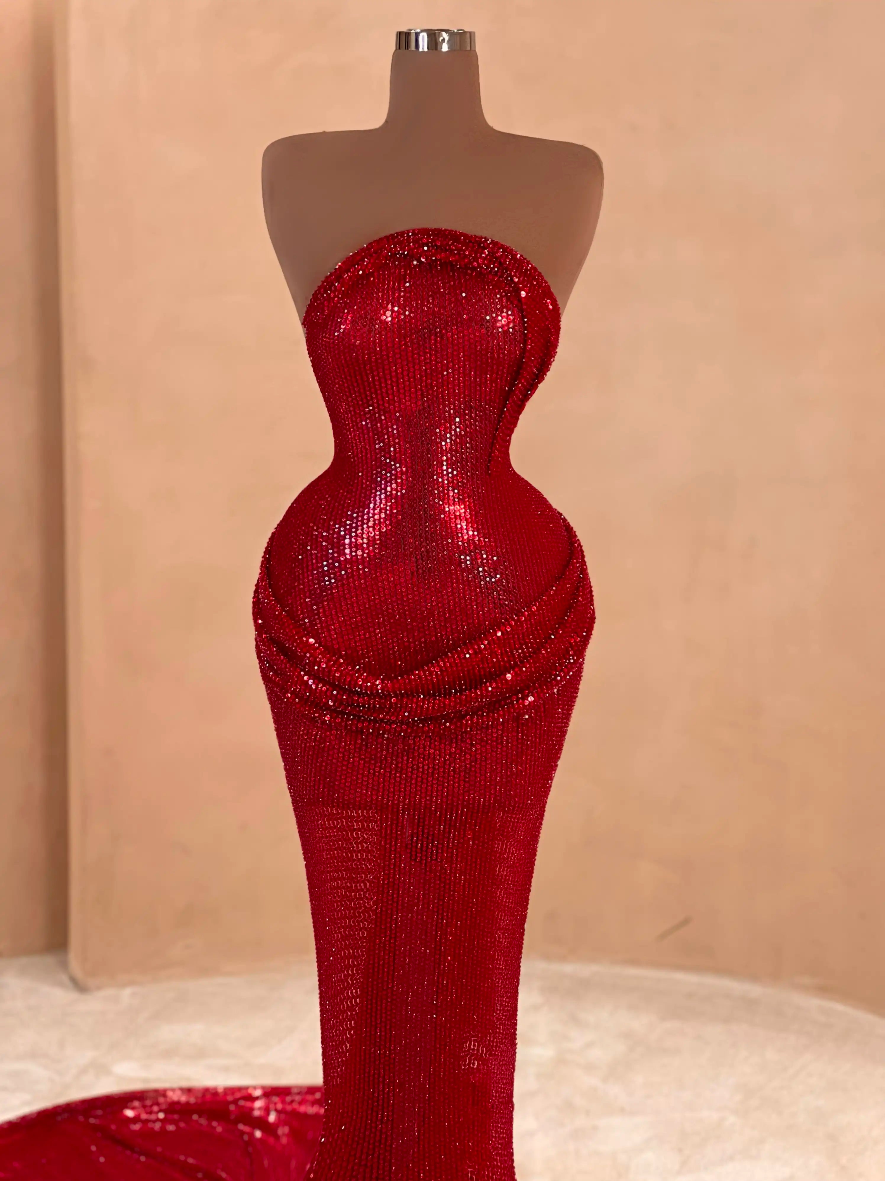 Command attention in this bold red couture gown featuring sculptural hips, draped embellishments, and a rich velvet-like texture. With its high neckline and long train, this dress brings old-Hollywood glamour into the now.