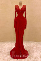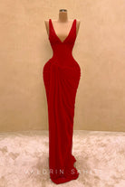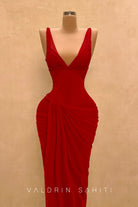 Flowing seamlessly into a floor-length mermaid skirt, the fabric cascades into a subtle train, exuding luxury. The combination of soft, ruched fabric and precise tailoring makes this gown a statement piece ideal for red-carpet events or high-fashion occasions.